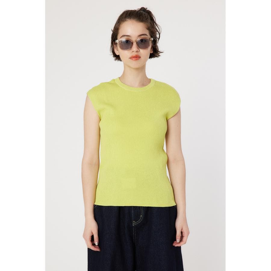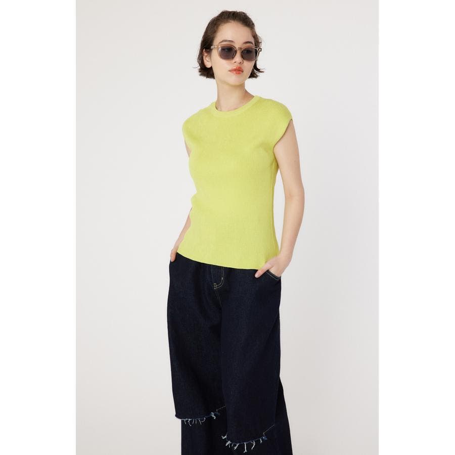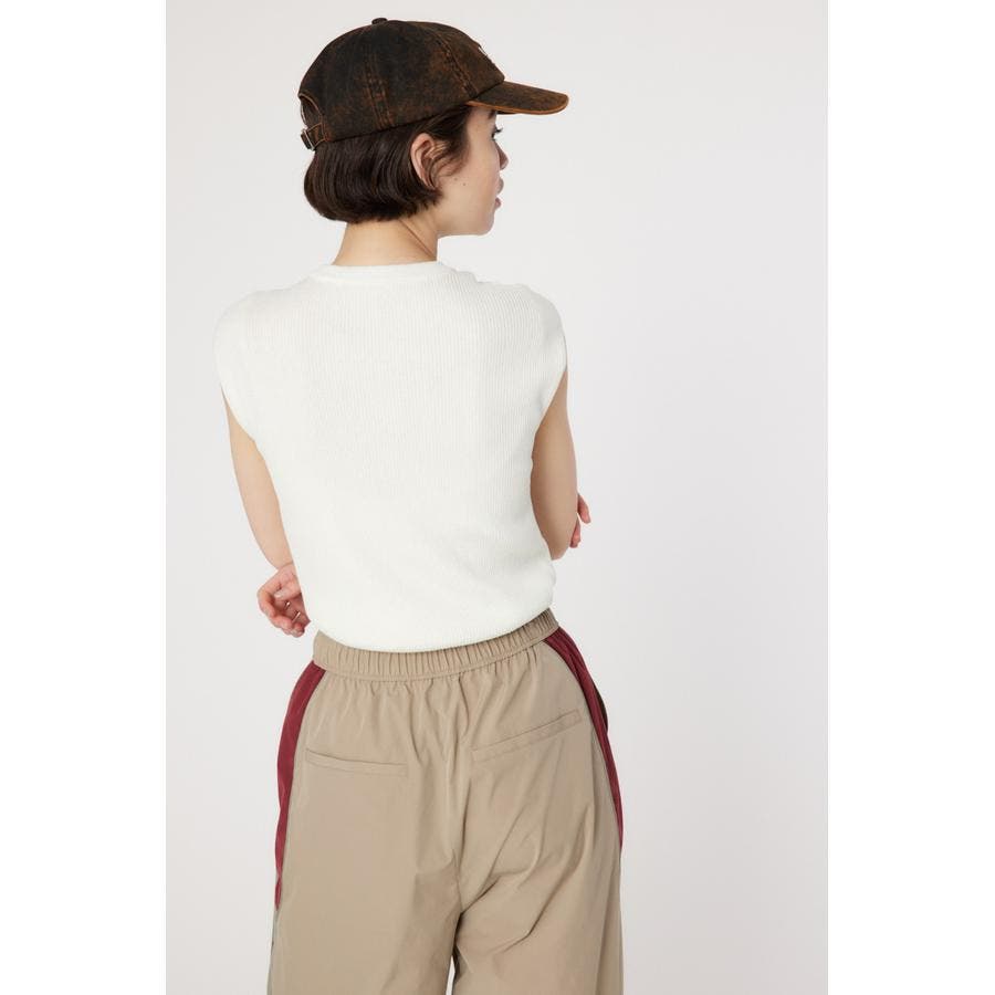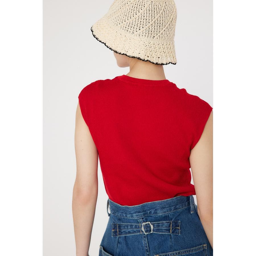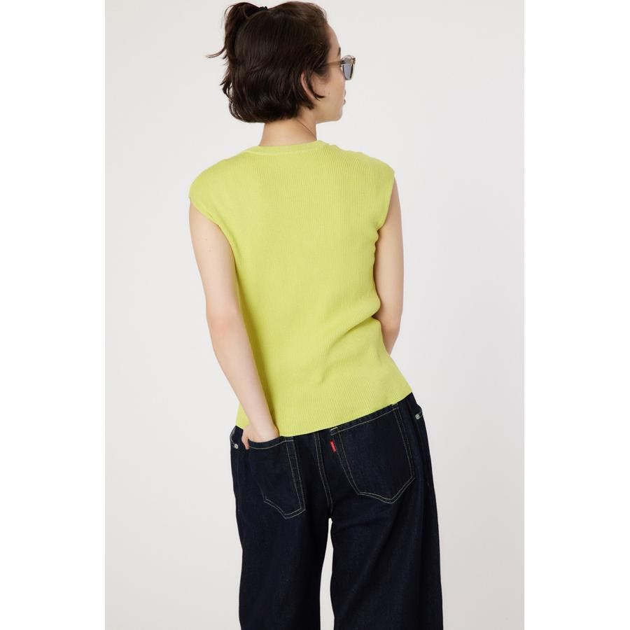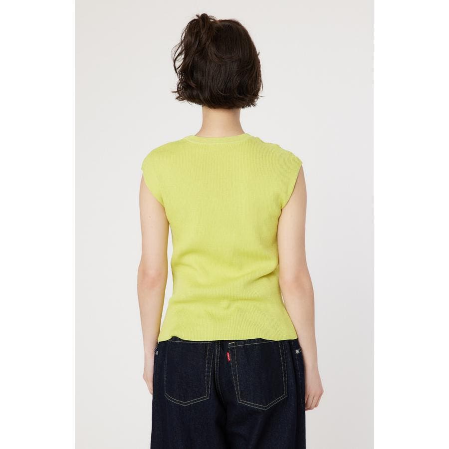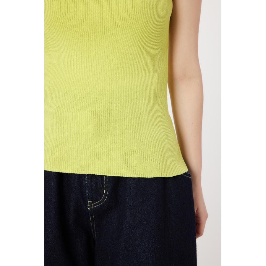 ニット編地でありながら、繊細な細番のポリエステル糸を使用し、春夏らしいドライ感を表現したノースリーブトップス。ベーシックに使えるOWHT・BLKと、コーデのポイントになるLIME・REDの4色展開です。
