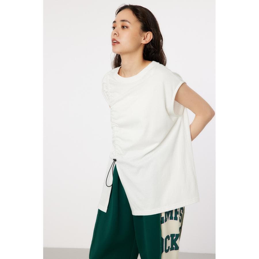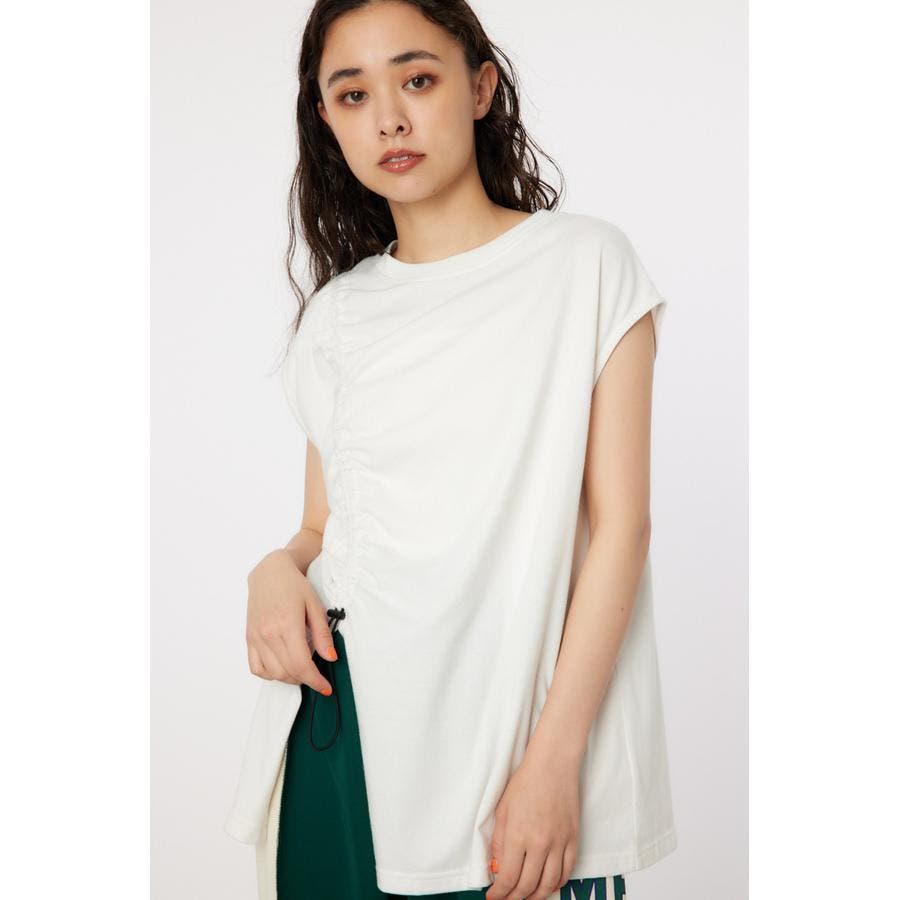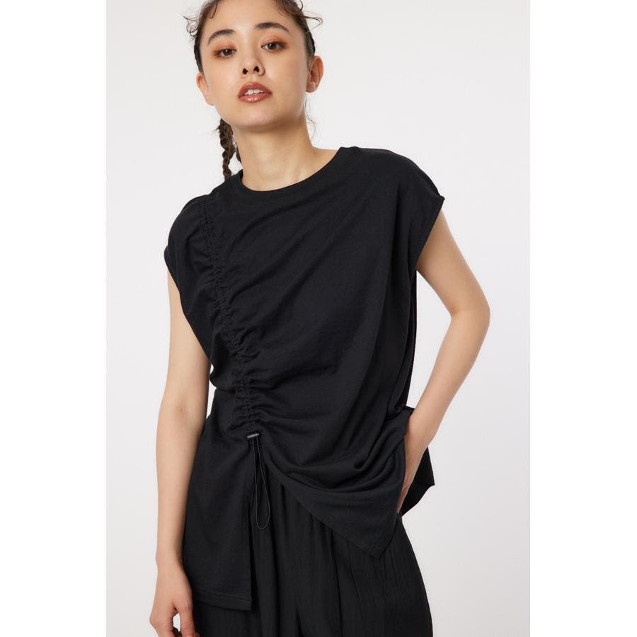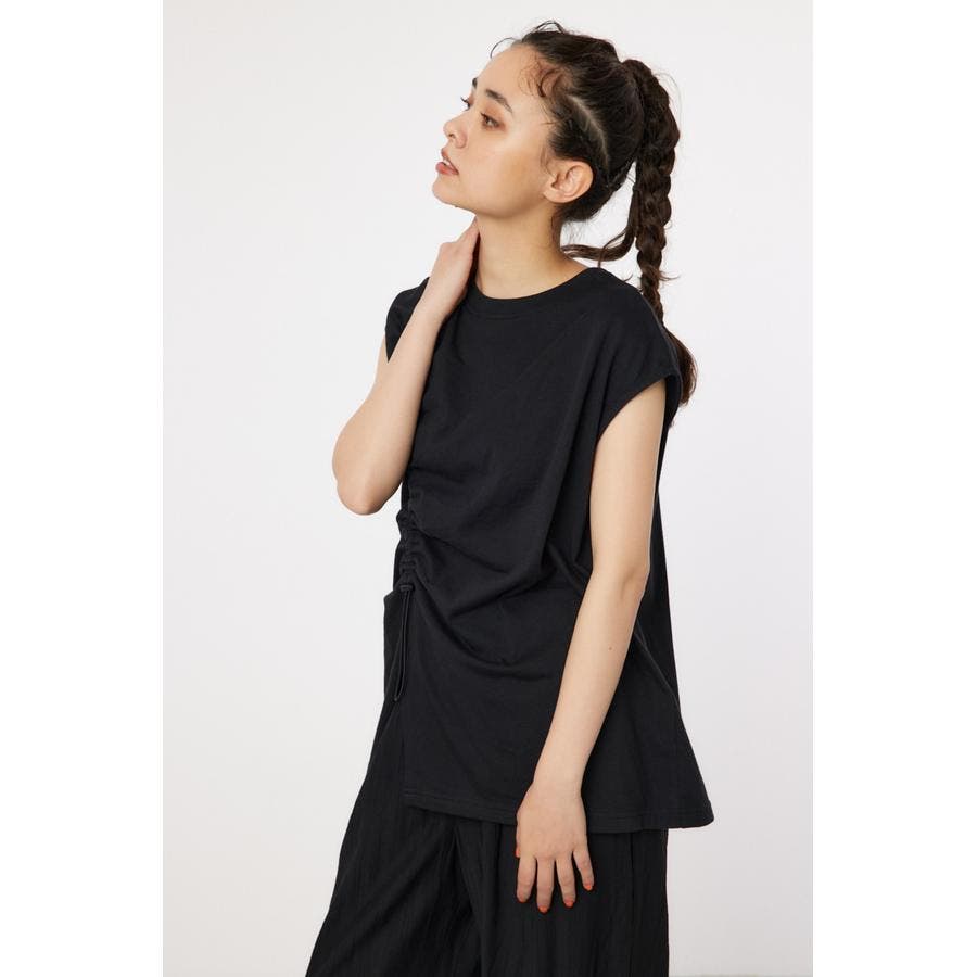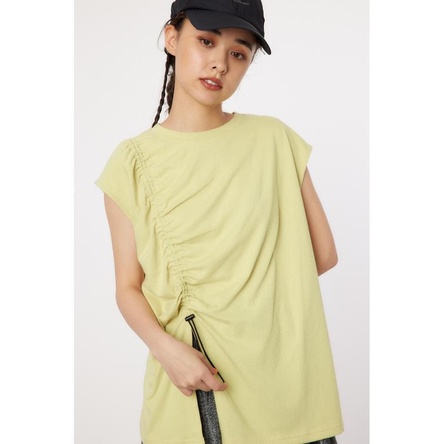 ベーシックなタンクトップに、シャーリングディティールをプラスしたトップス。シャーリング部分には長めのスリットを入れることで、インしなくても腰位置を高く、スタイルアップするデザインになっています。