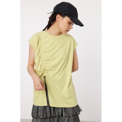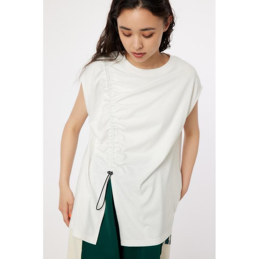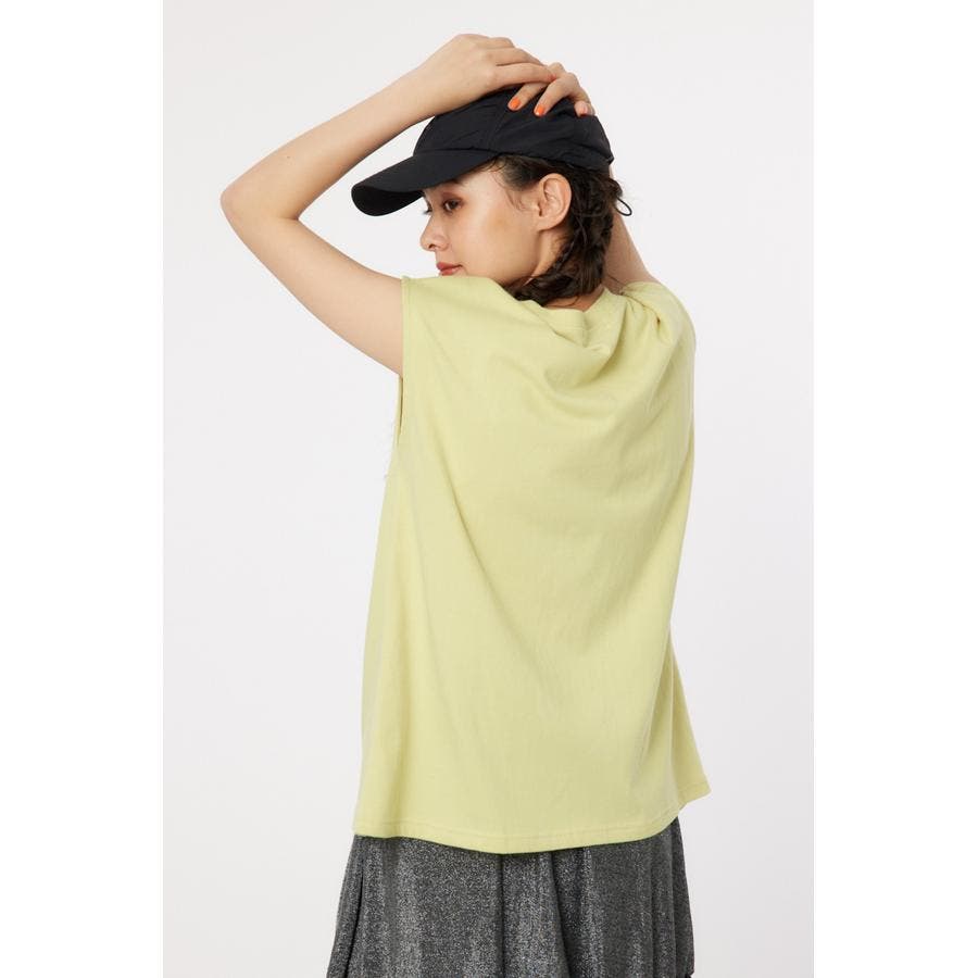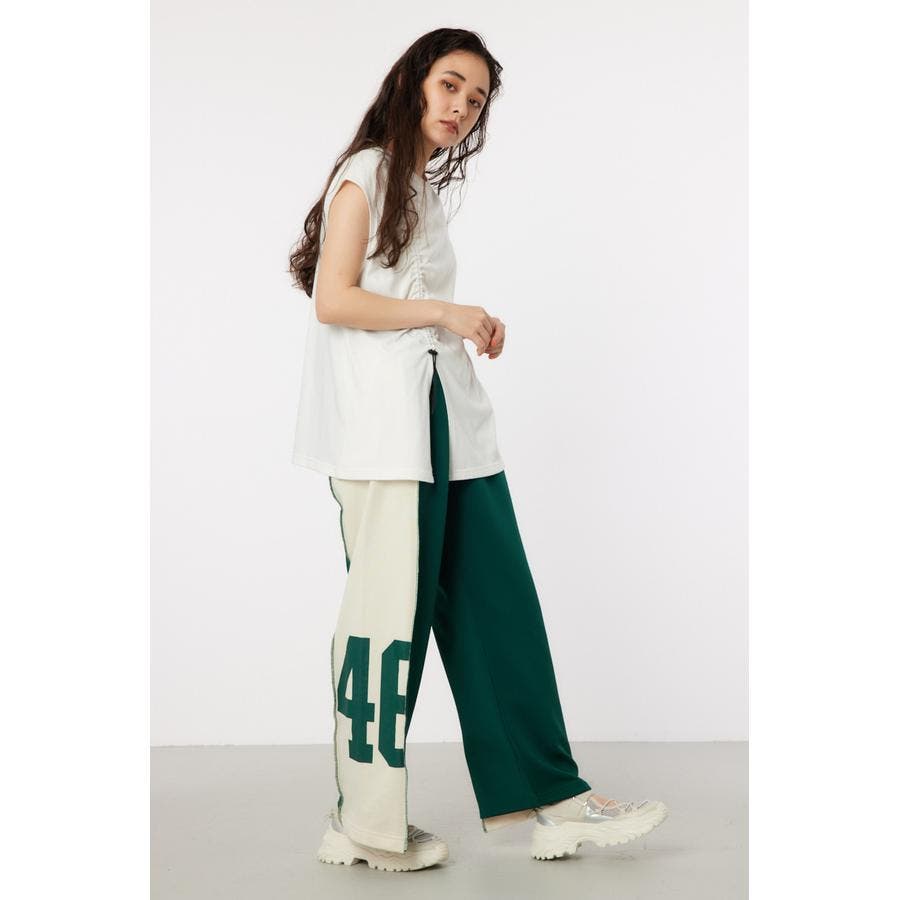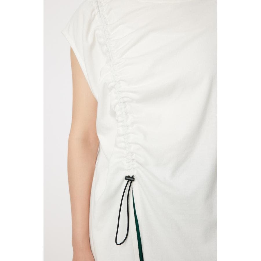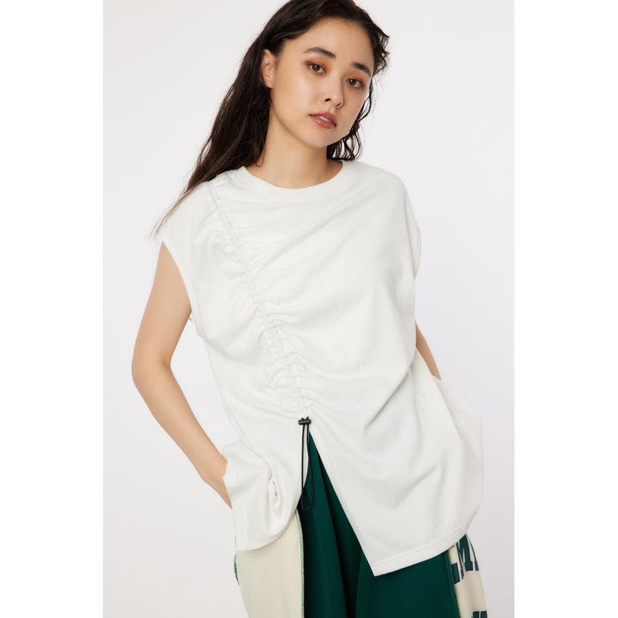 ベーシックなタンクトップに、シャーリングディティールをプラスしたトップス。シャーリング部分には長めのスリットを入れることで、インしなくても腰位置を高く、スタイルアップするデザインになっています。