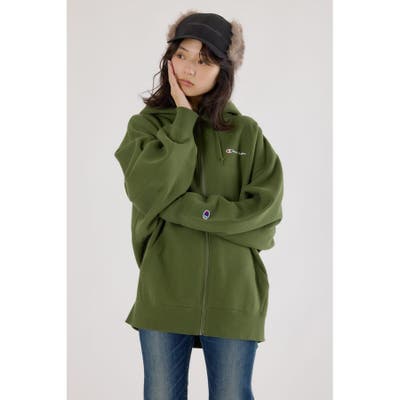フード部分にCHAMPIONロゴの刺繍、バックには共地ロゴのアップリケをデザイン。