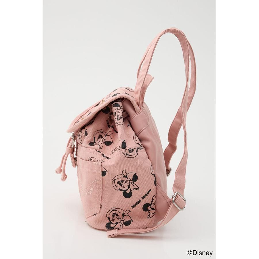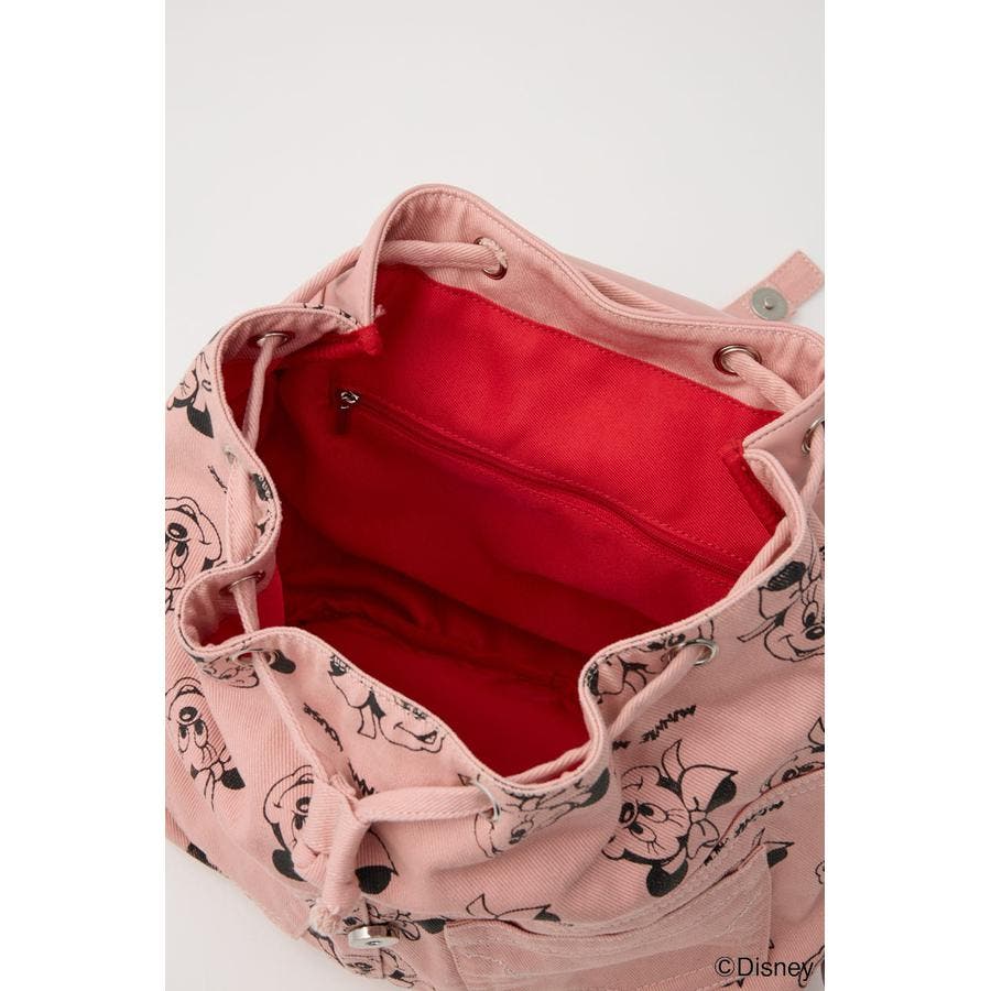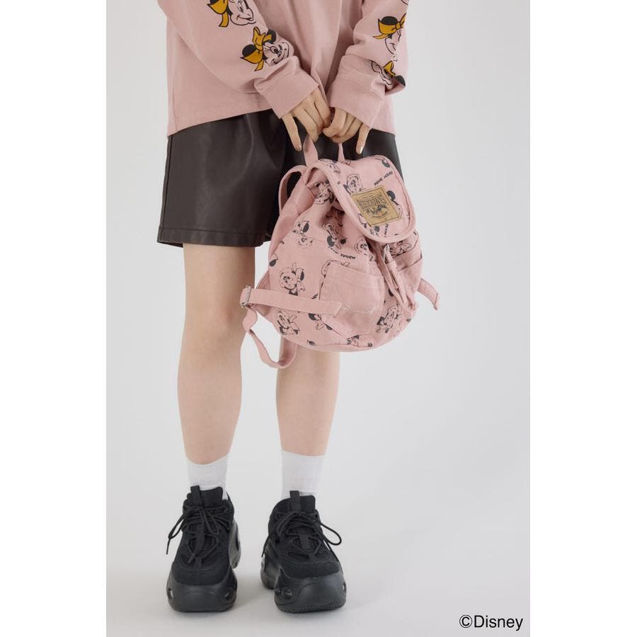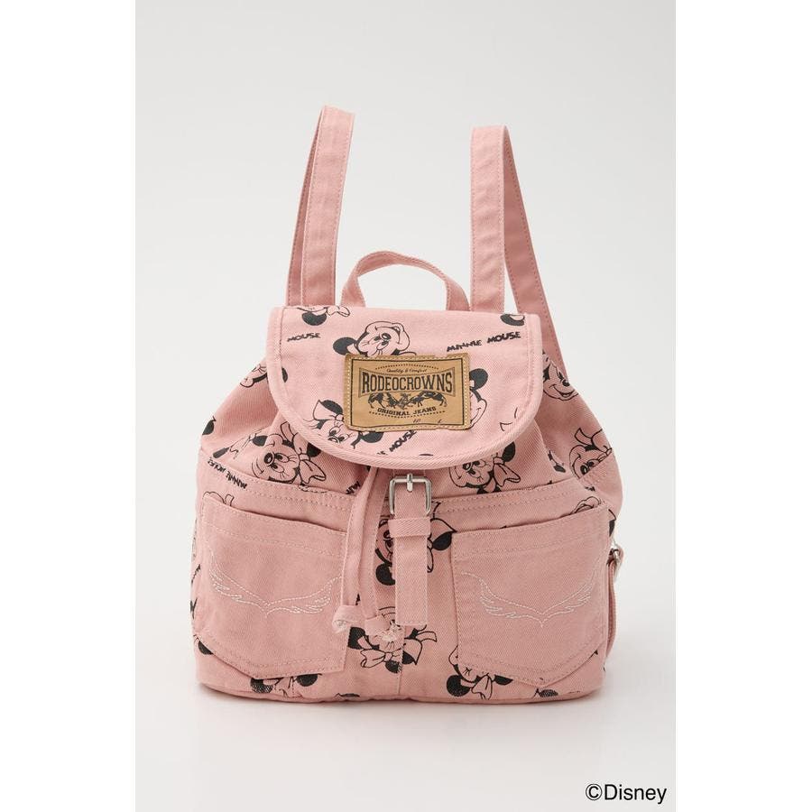 大人気ディズニーキャラクターのミッキーとミニーの総柄デザインがプリントされたデニムリュック。