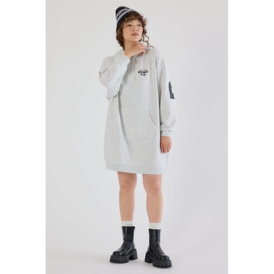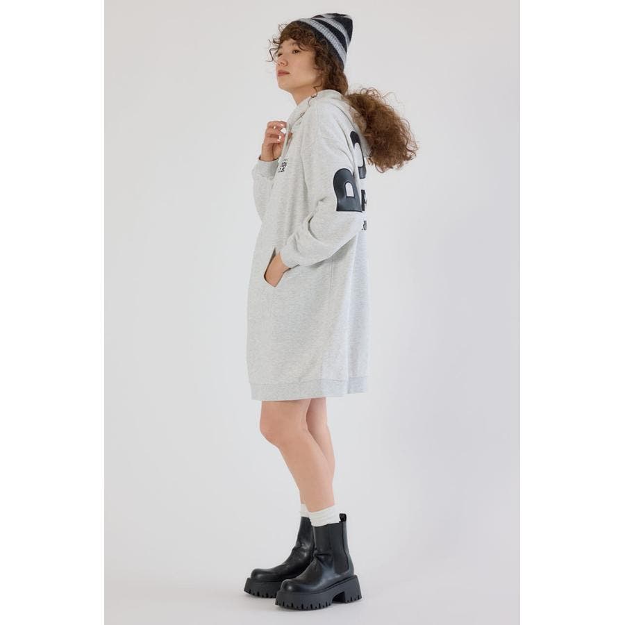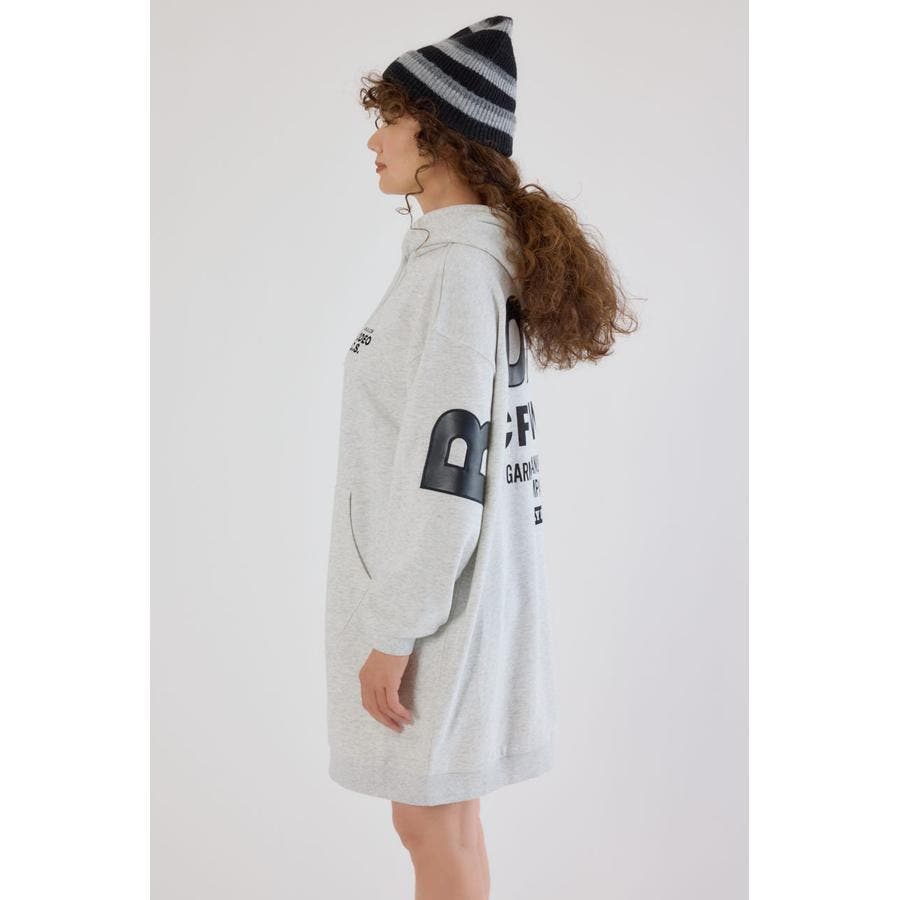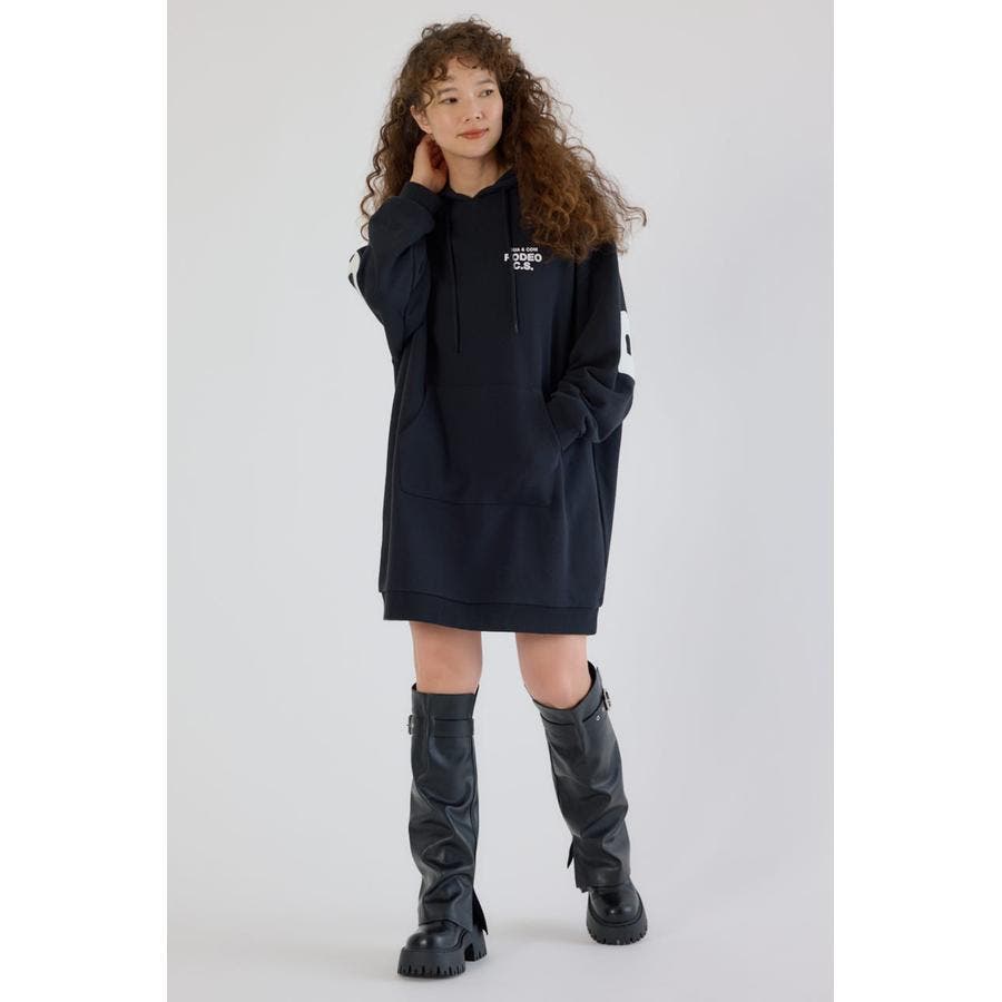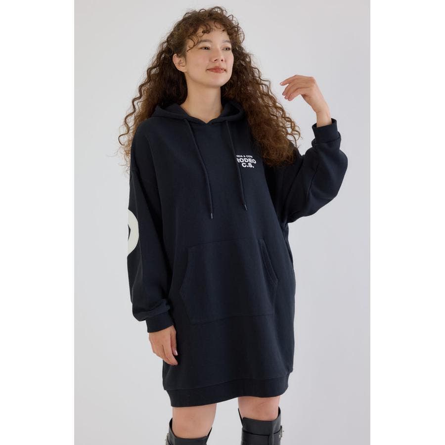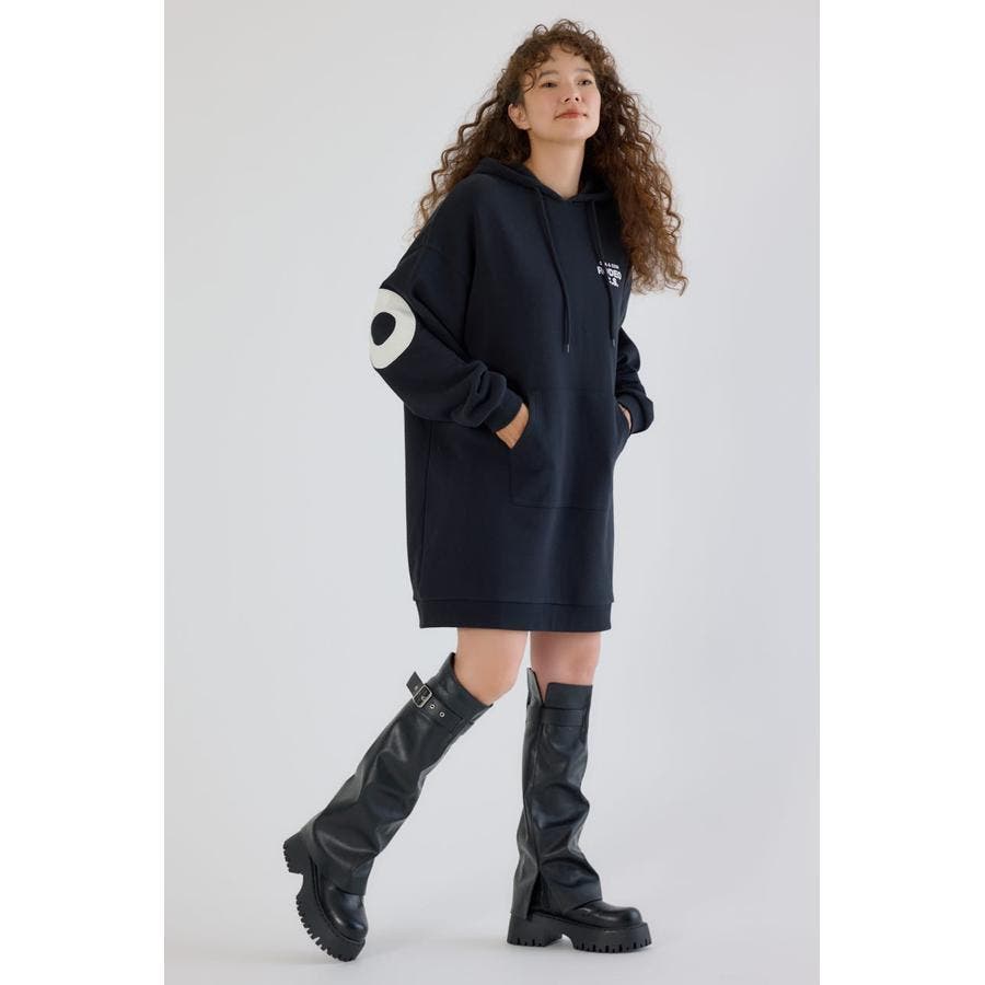 秋冬にぴったりなレザーアップリケがトレンド感があり、かっこいいパーカーワンピースです。