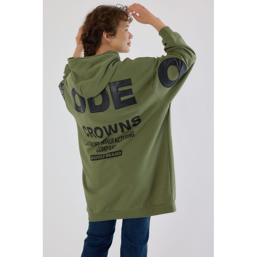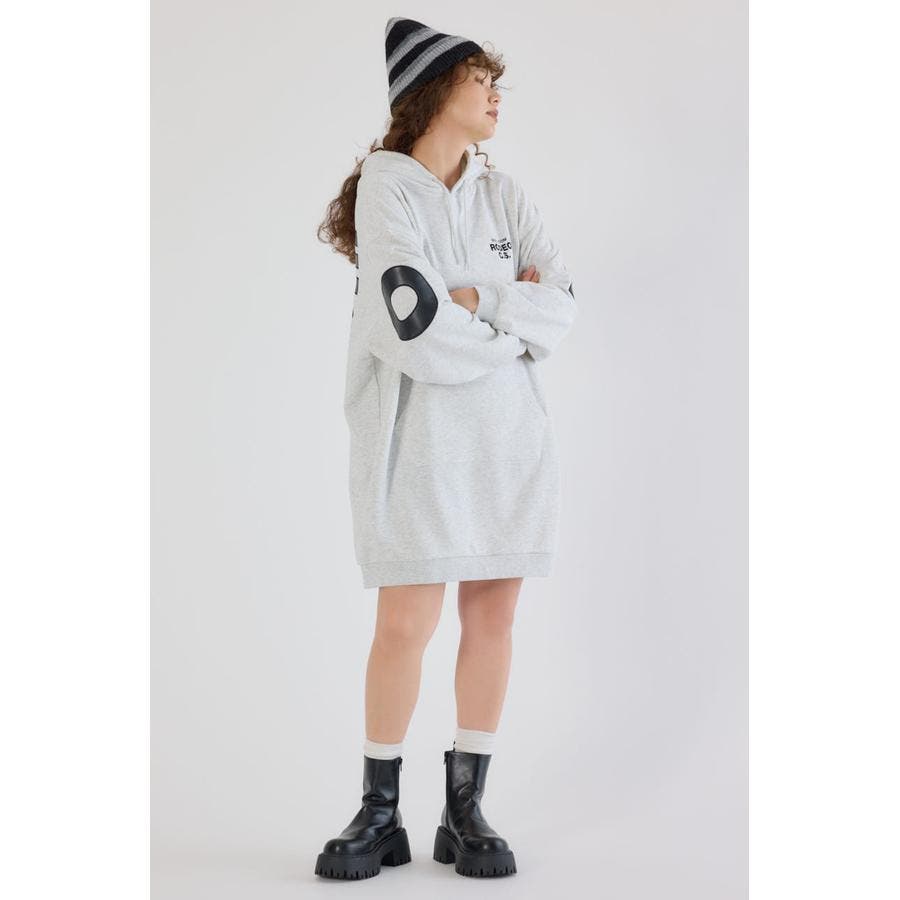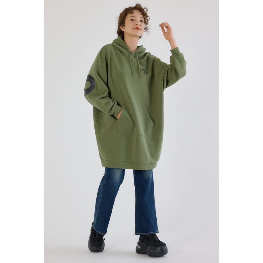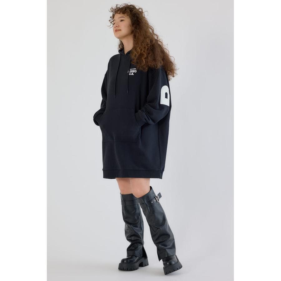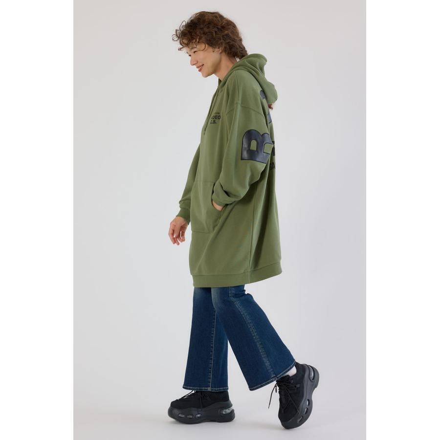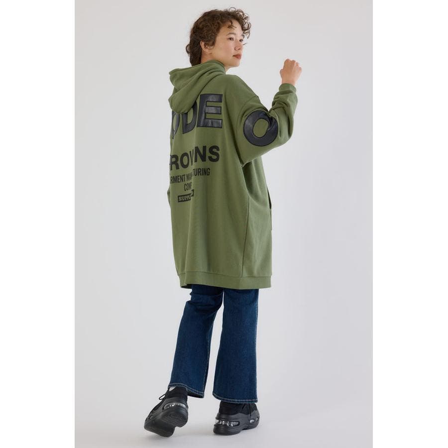 秋冬にぴったりなレザーアップリケがトレンド感があり、かっこいいパーカーワンピースです。
