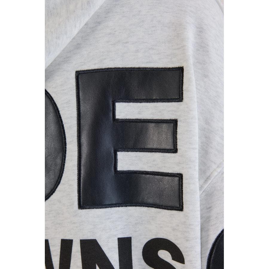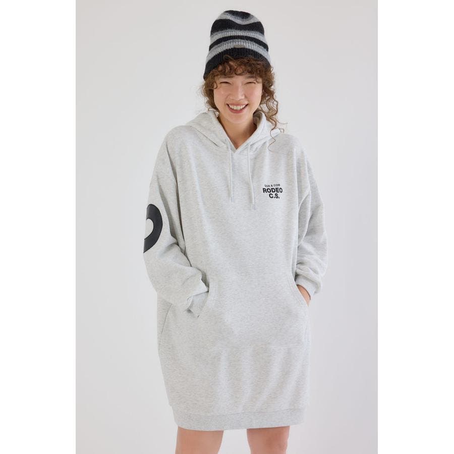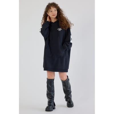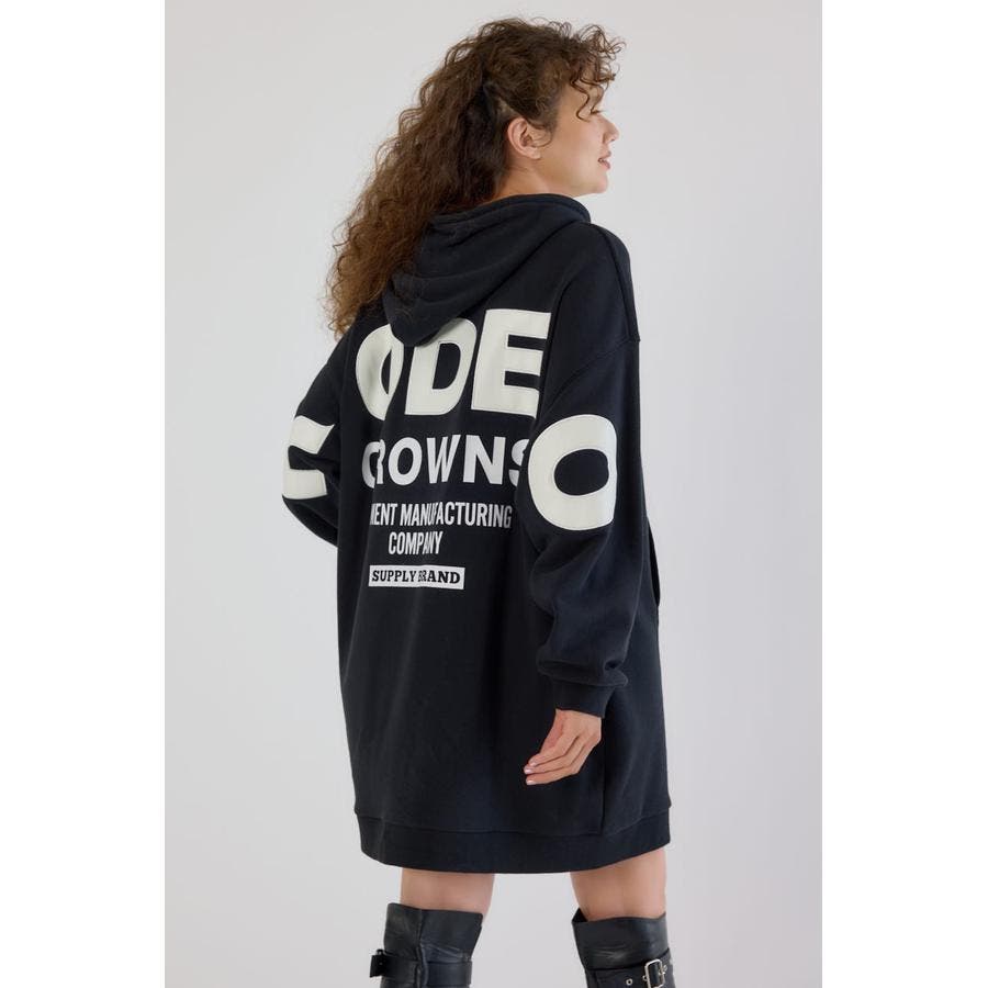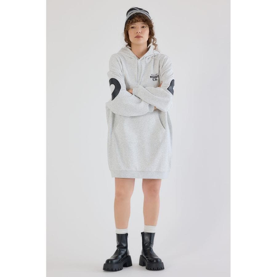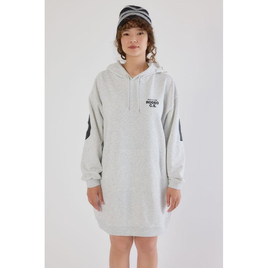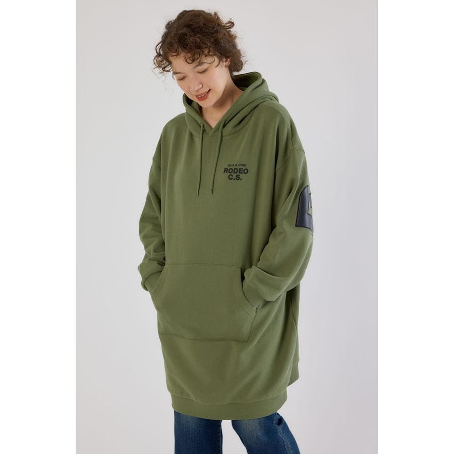 秋冬にぴったりなレザーアップリケがトレンド感があり、かっこいいパーカーワンピースです。
