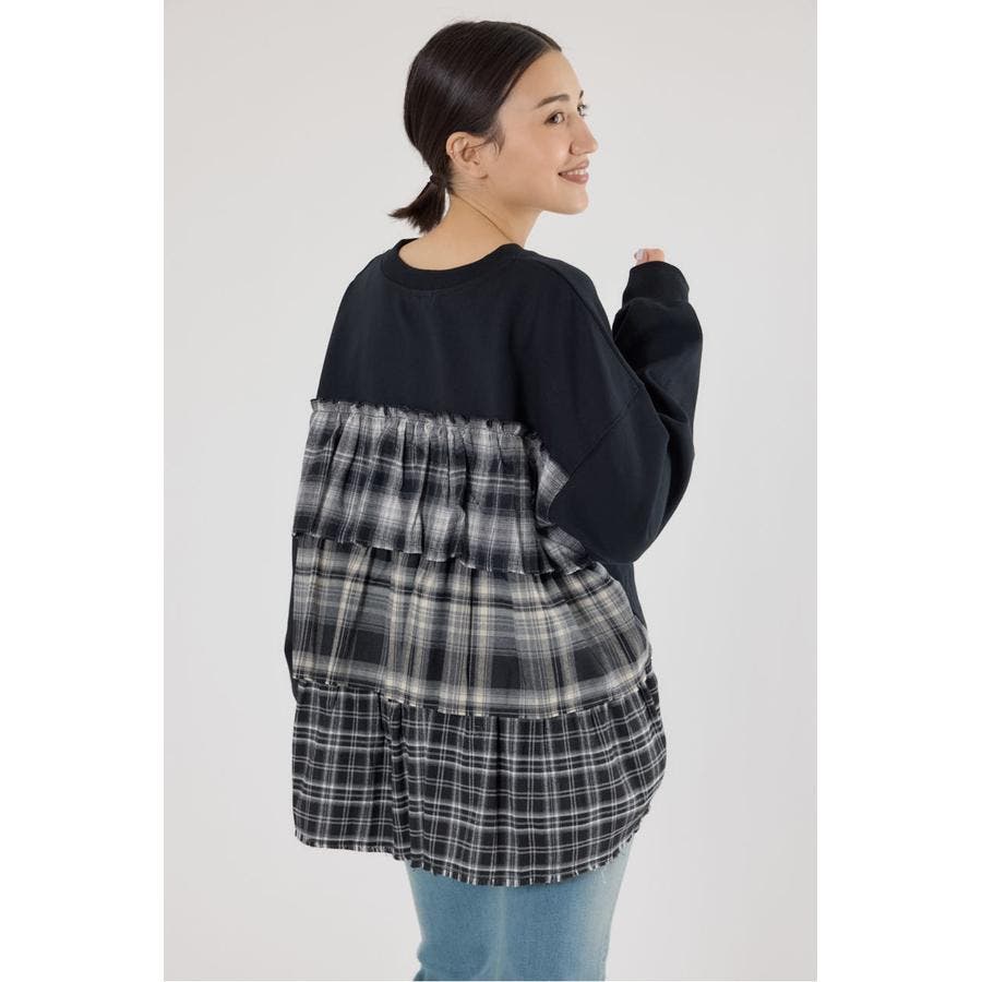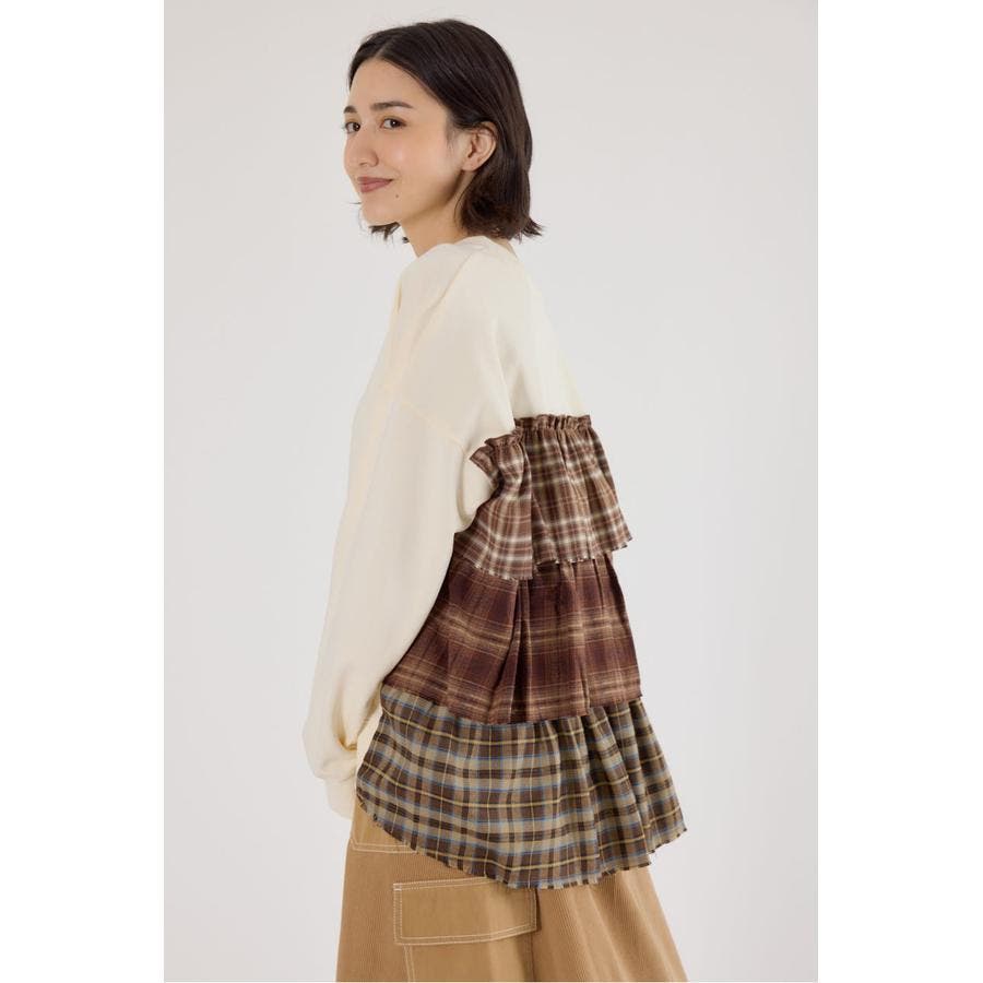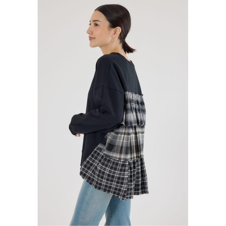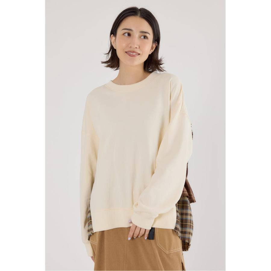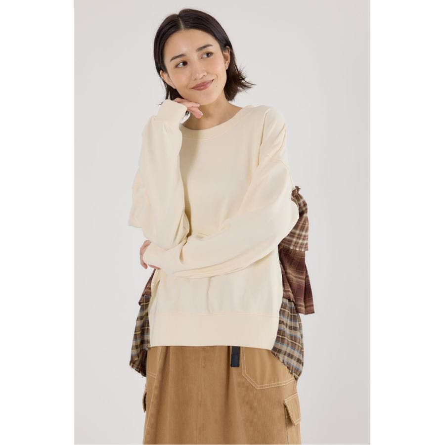 前身はスウェット地、後ろ身はネルチェック生地のデコラティブなデザイントップス。