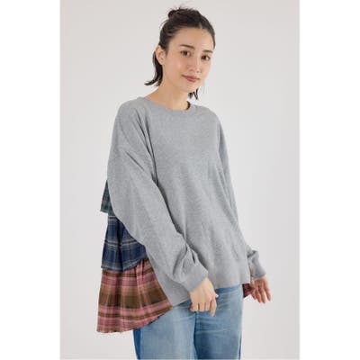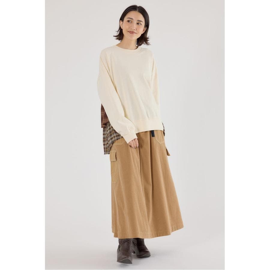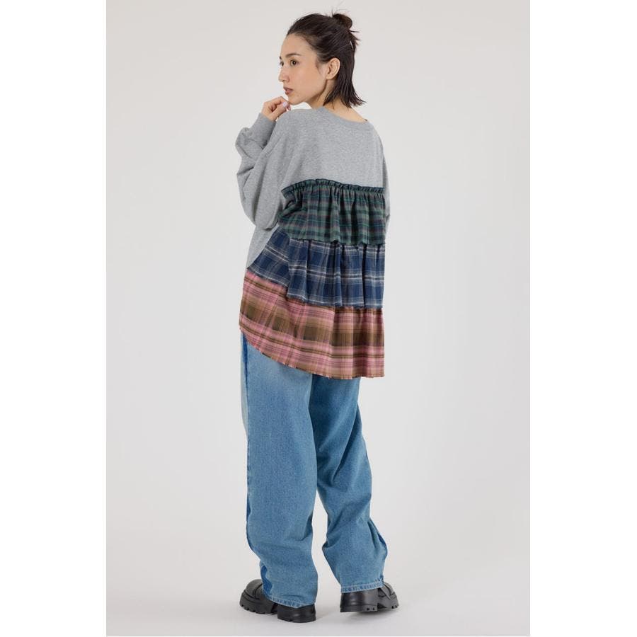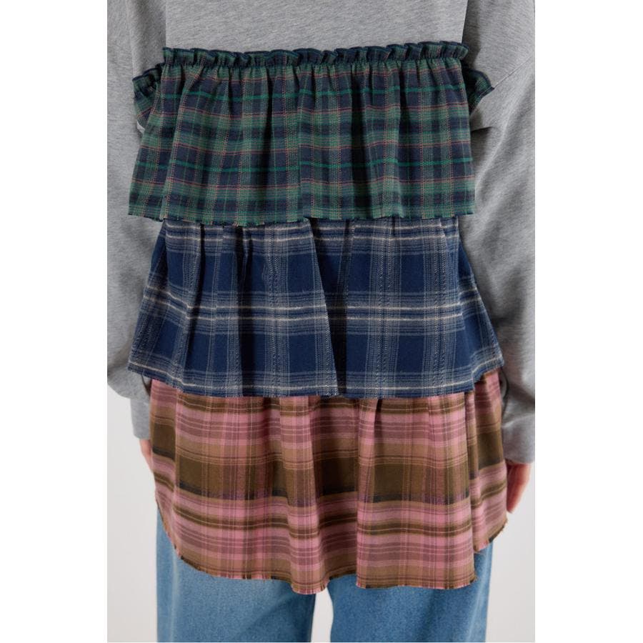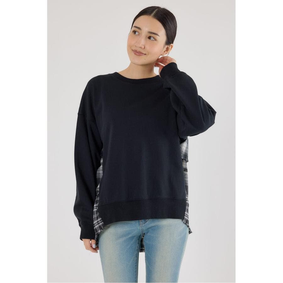 前身はスウェット地、後ろ身はネルチェック生地のデコラティブなデザイントップス。