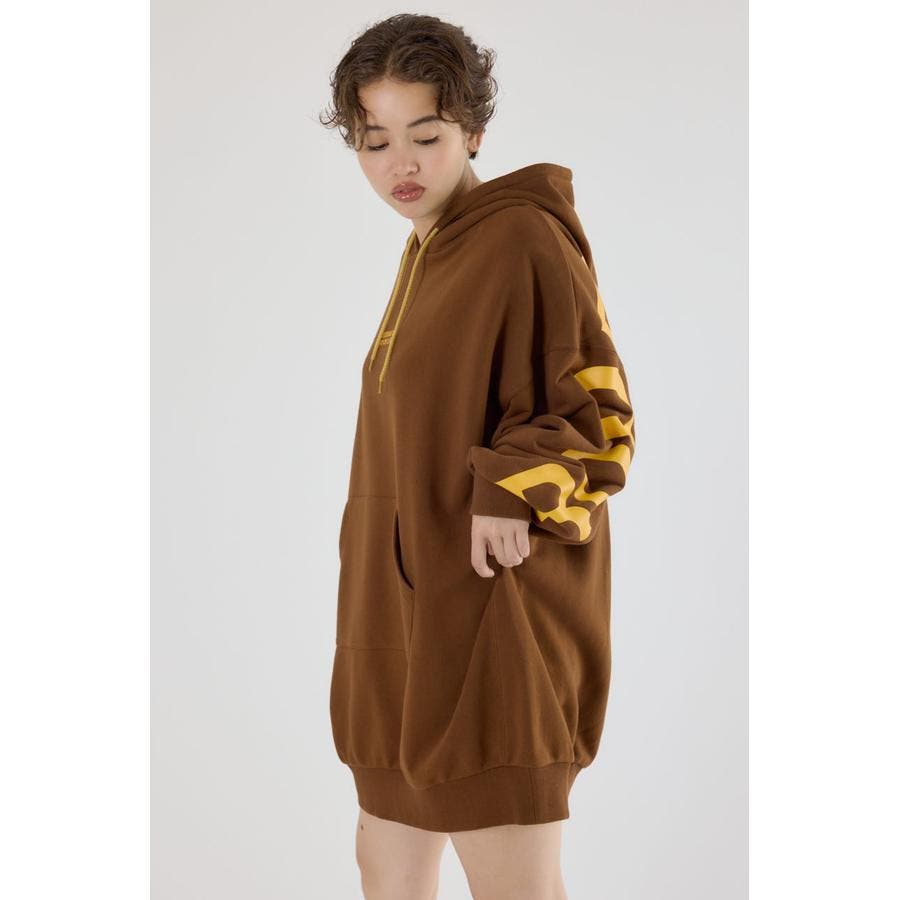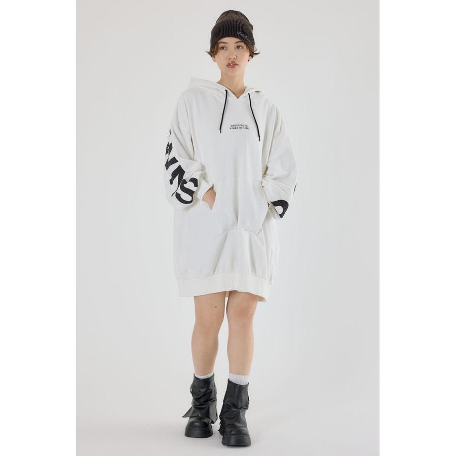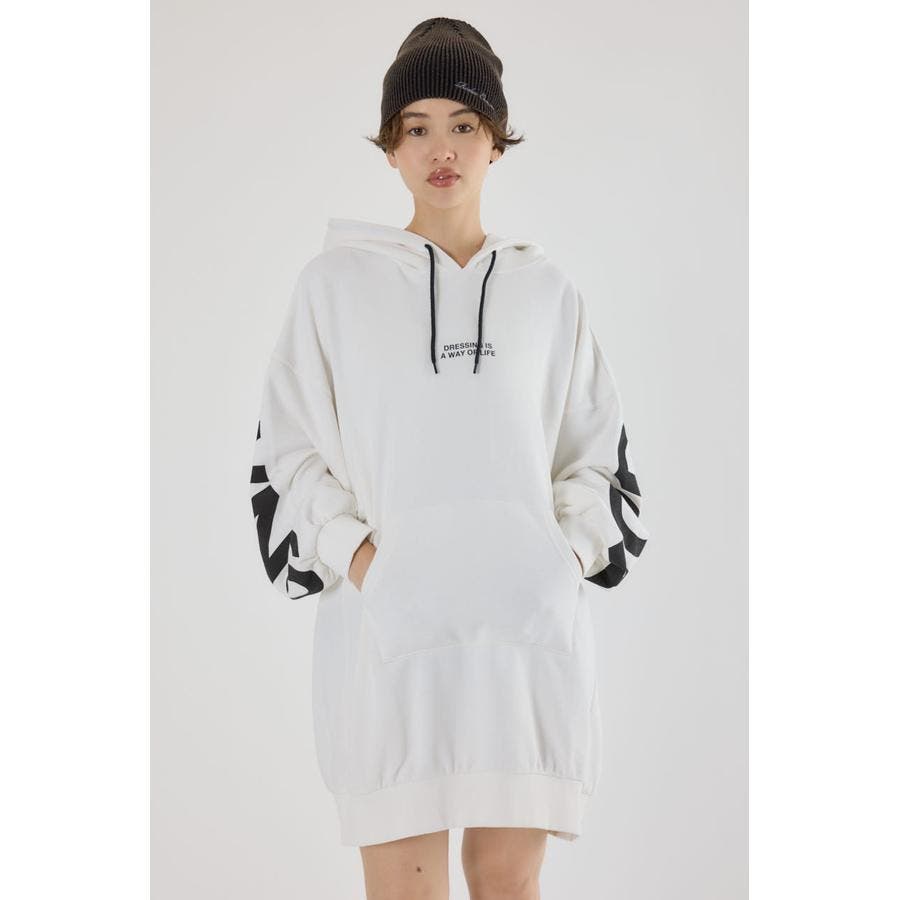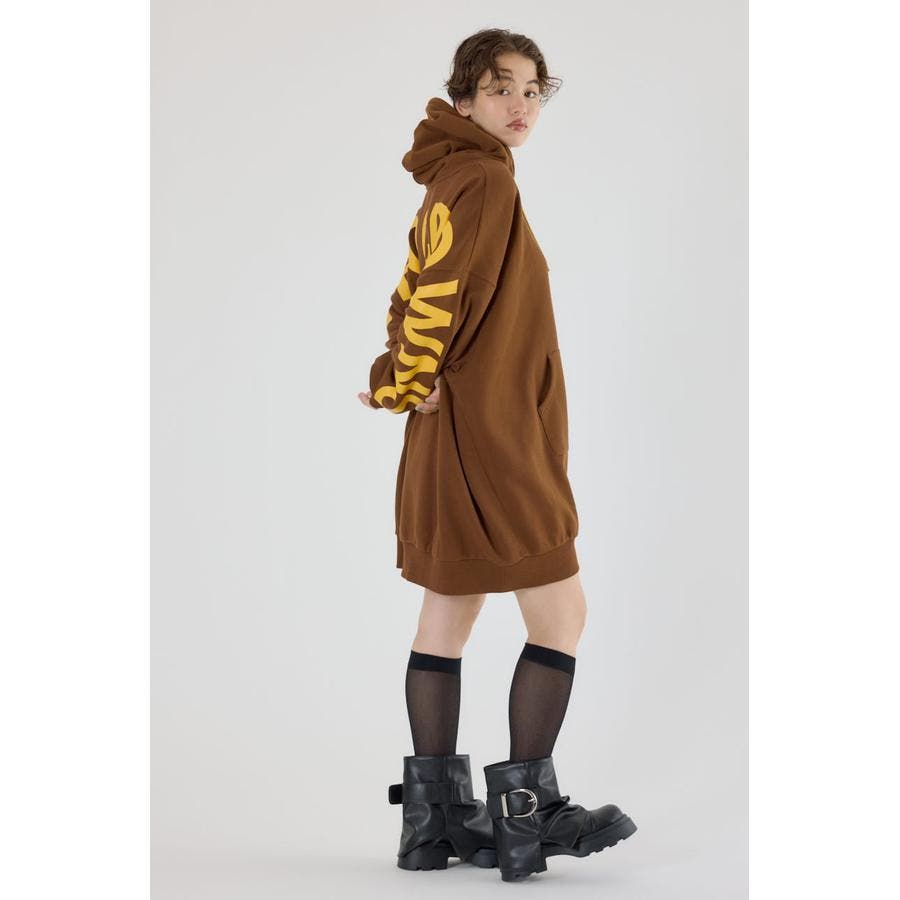 袖から袖にかけ大胆にロゴデザインプリントが施されているスウェットワンピース。
