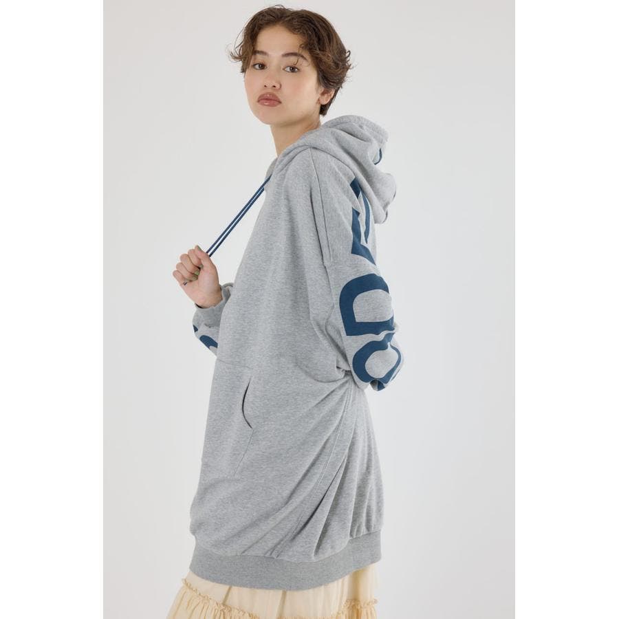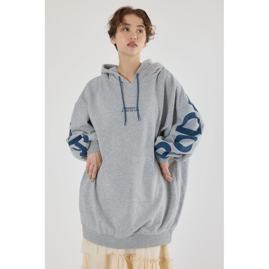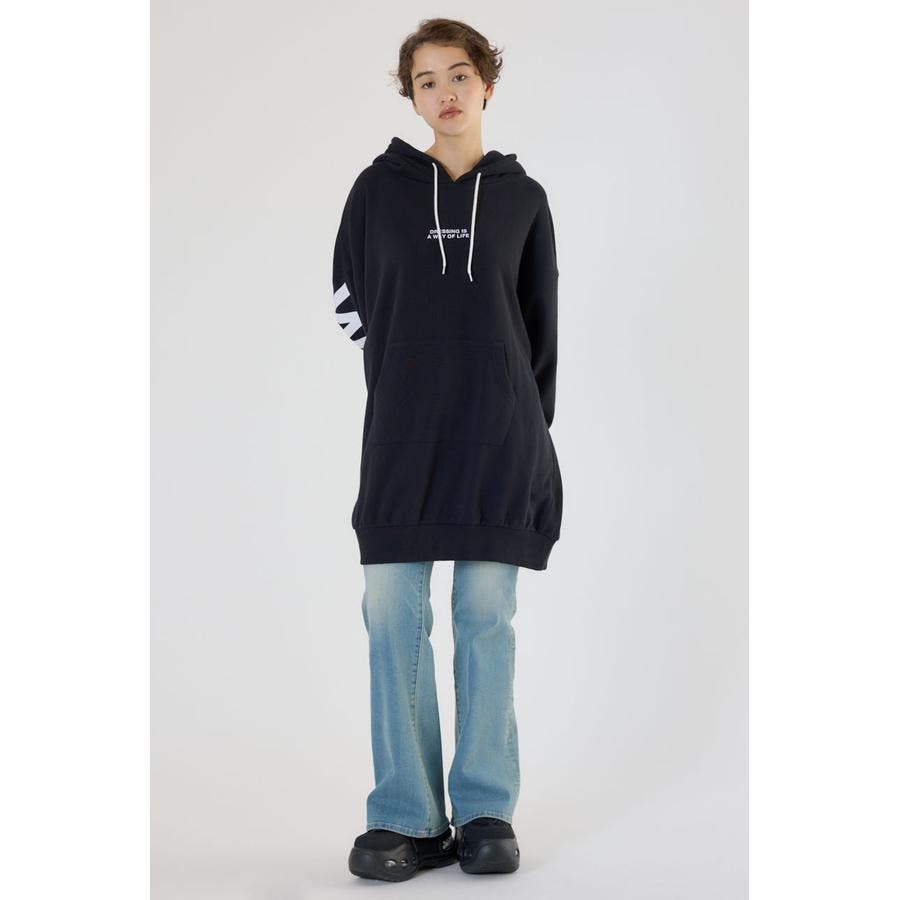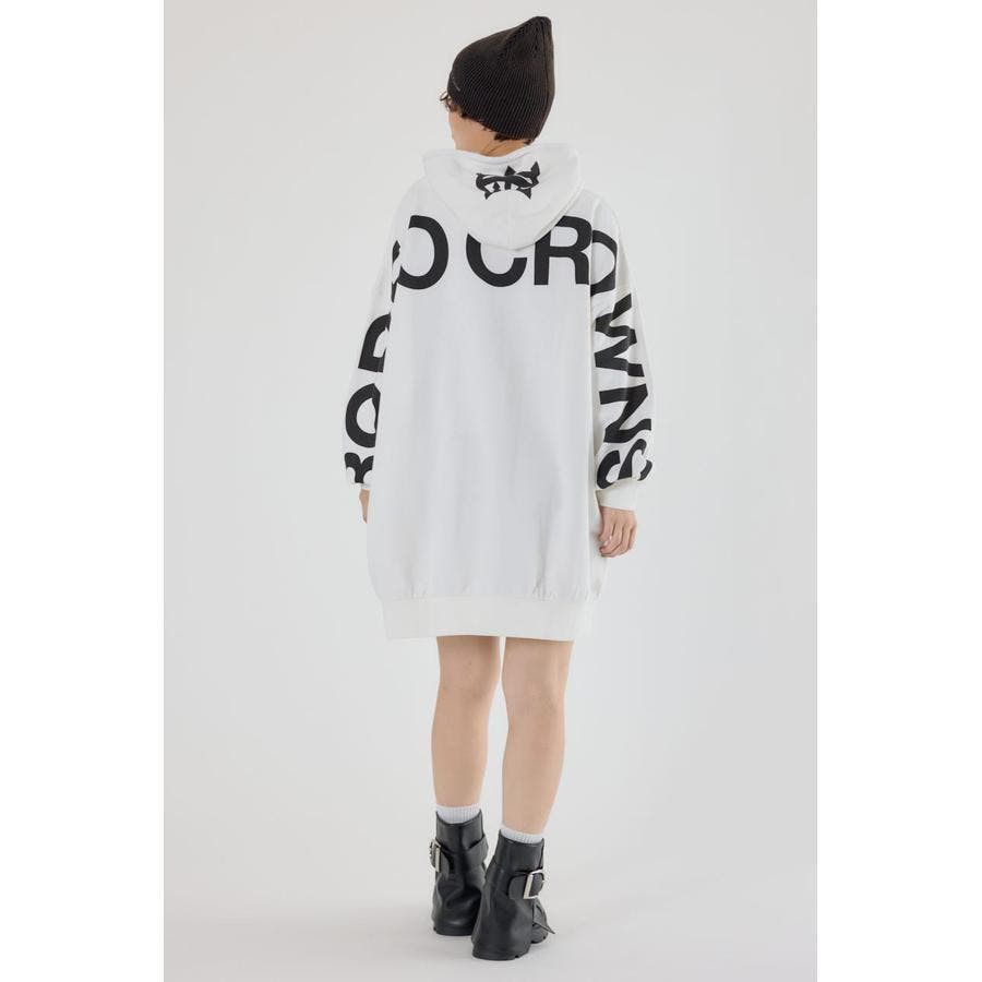 袖から袖にかけ大胆にロゴデザインプリントが施されているスウェットワンピース。