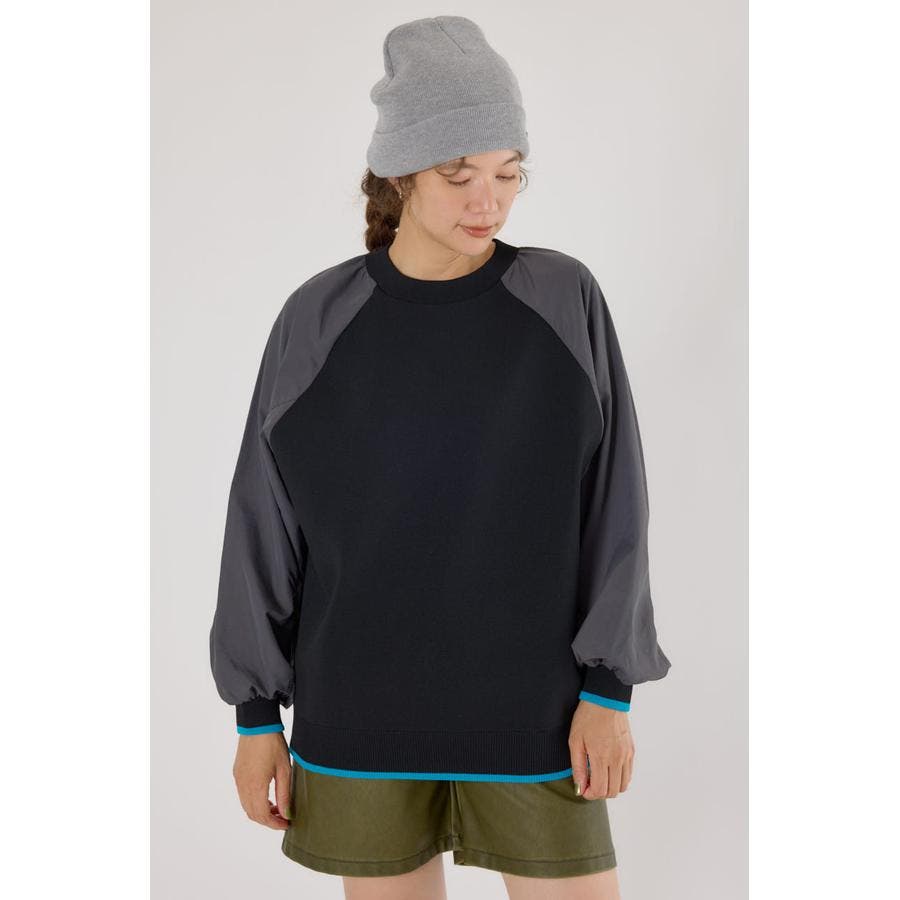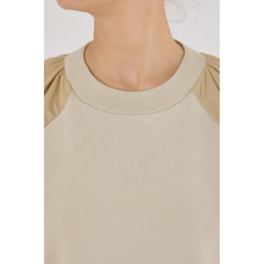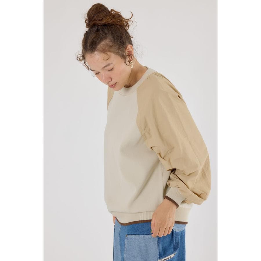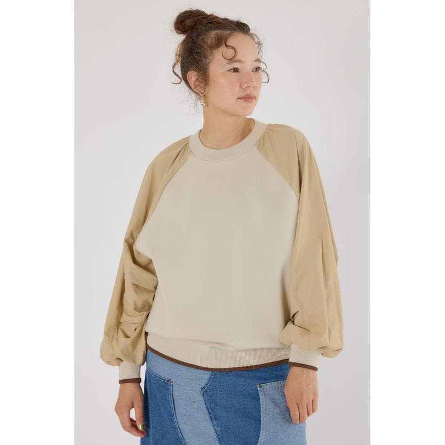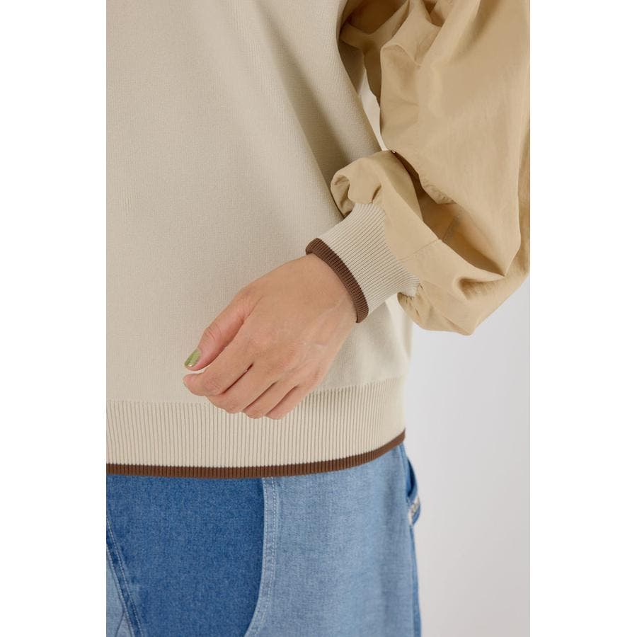 ボディはニット、スリーブは布帛の異素材が旬なプルオーバー。