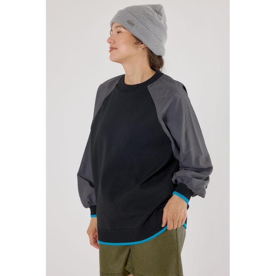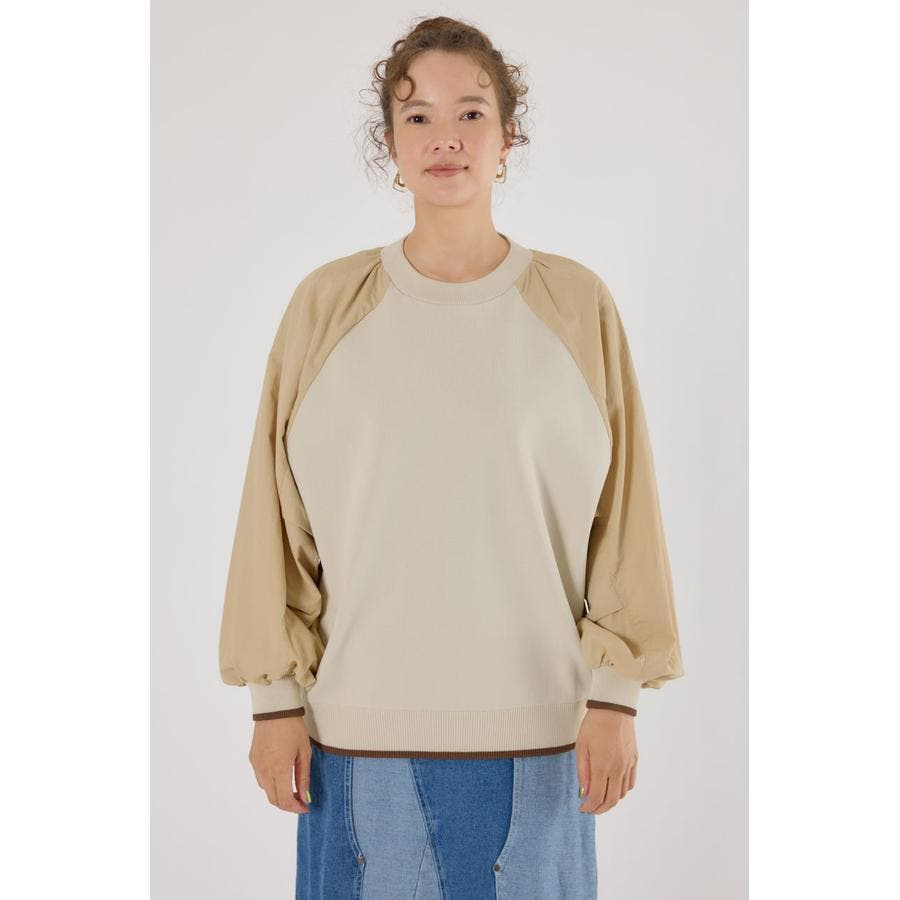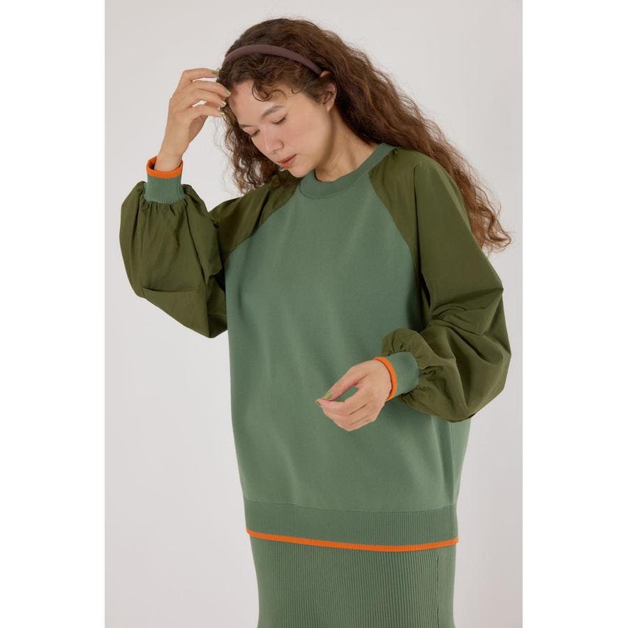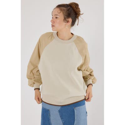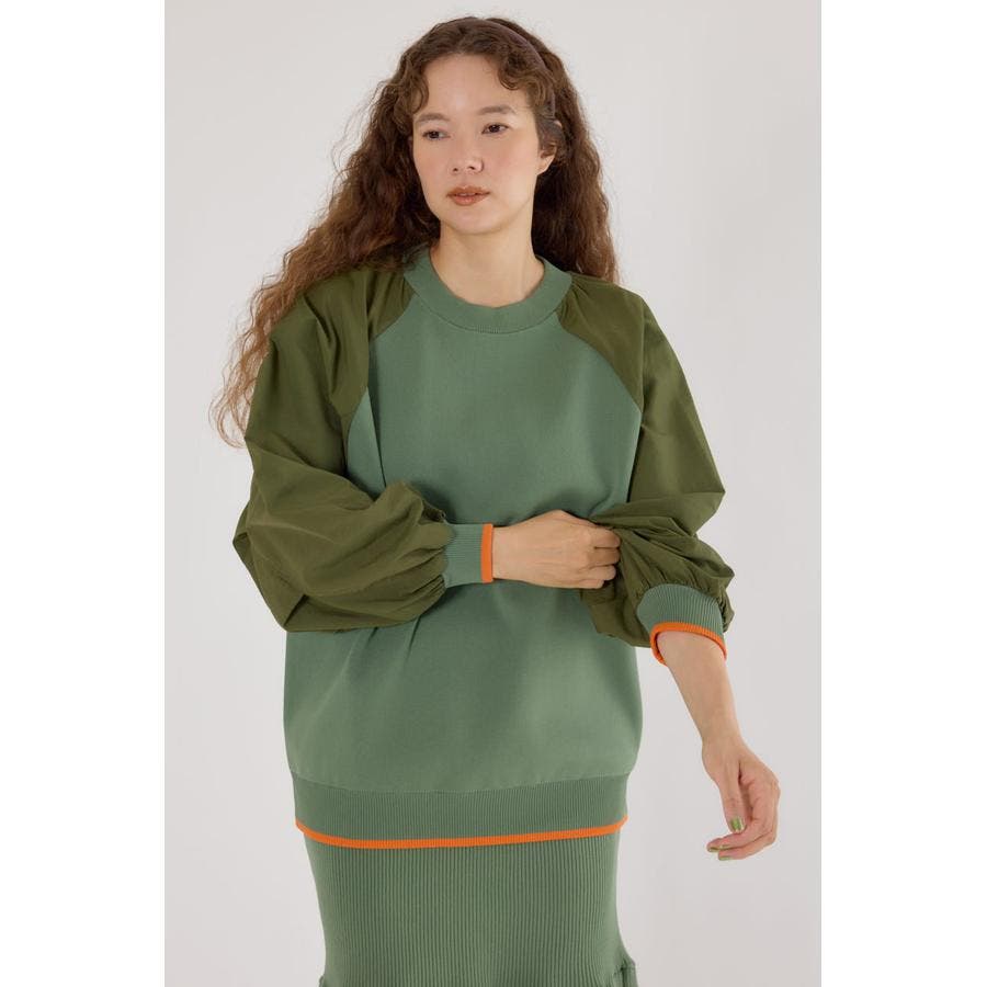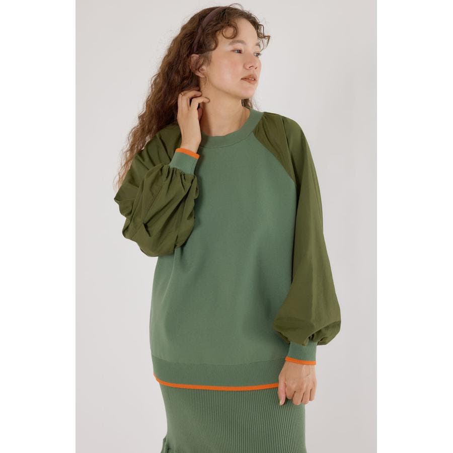ボディはニット、スリーブは布帛の異素材が旬なプルオーバー。