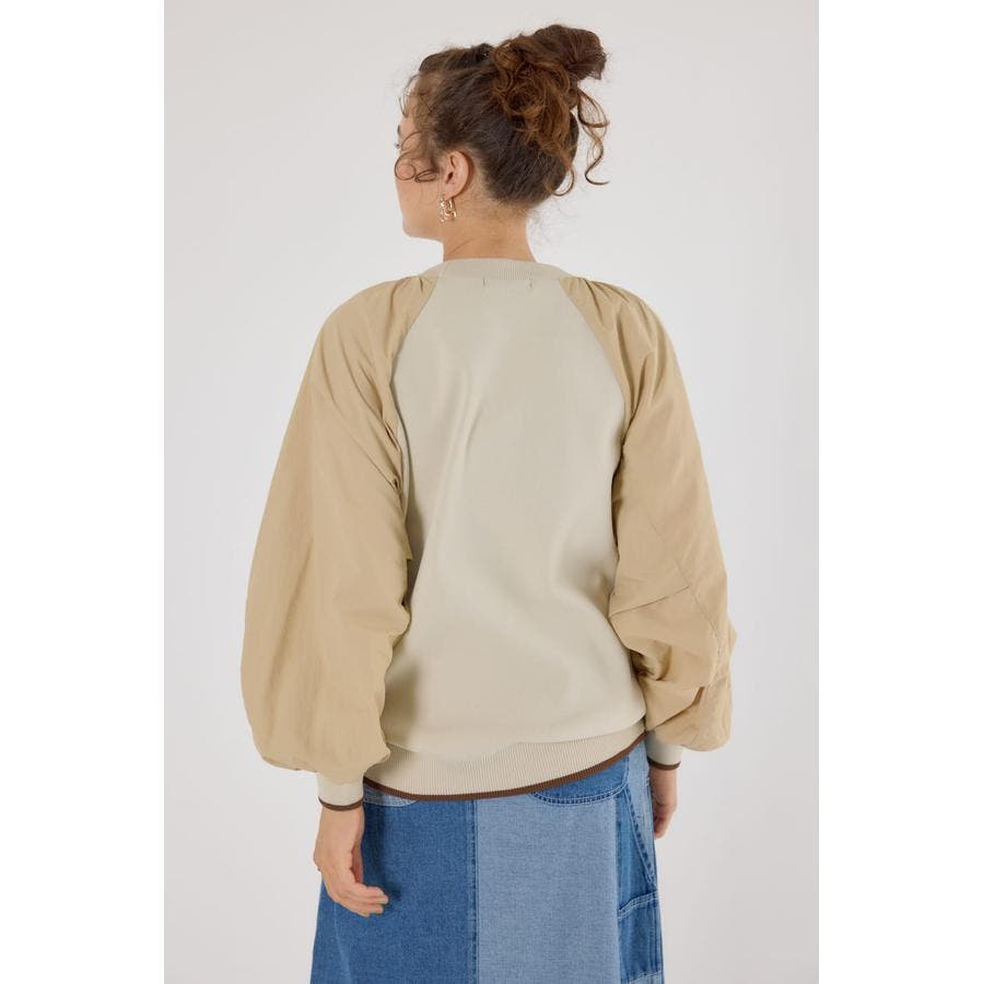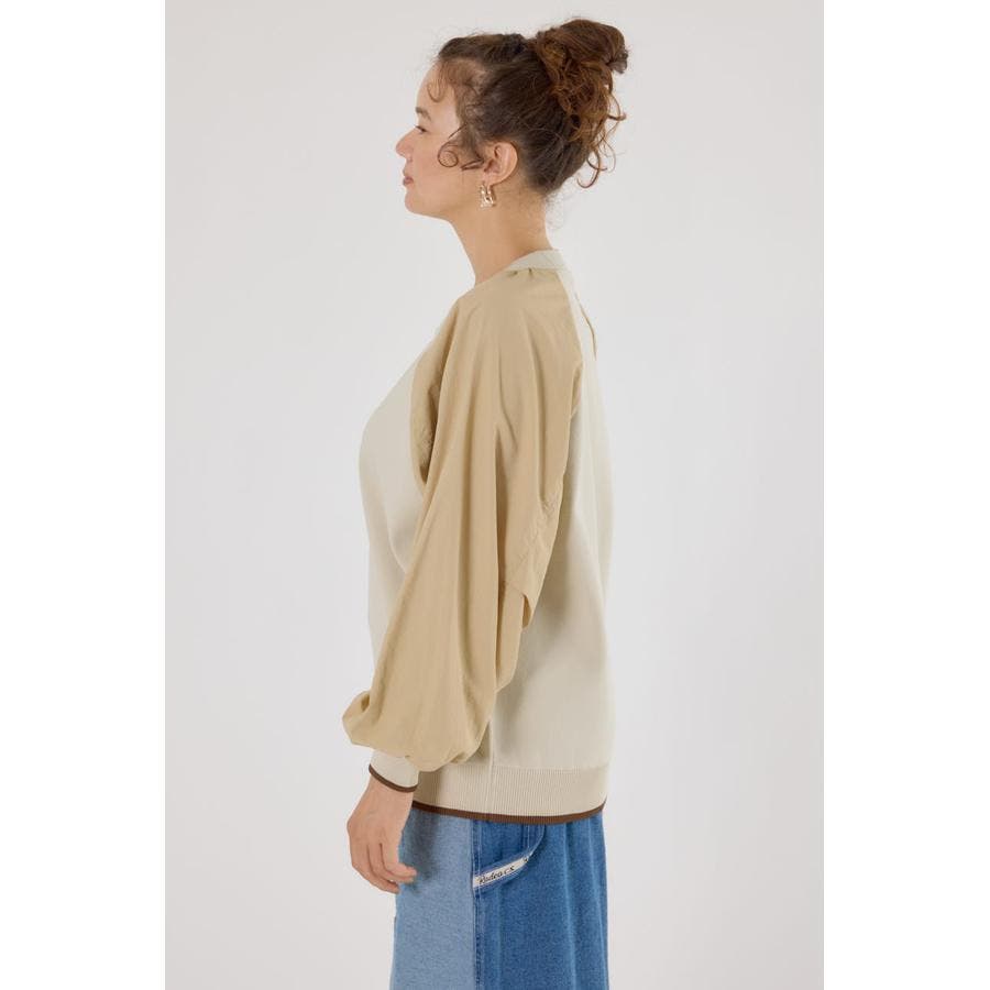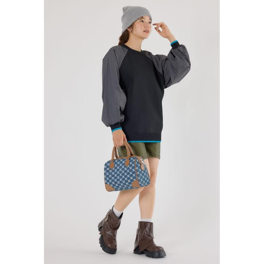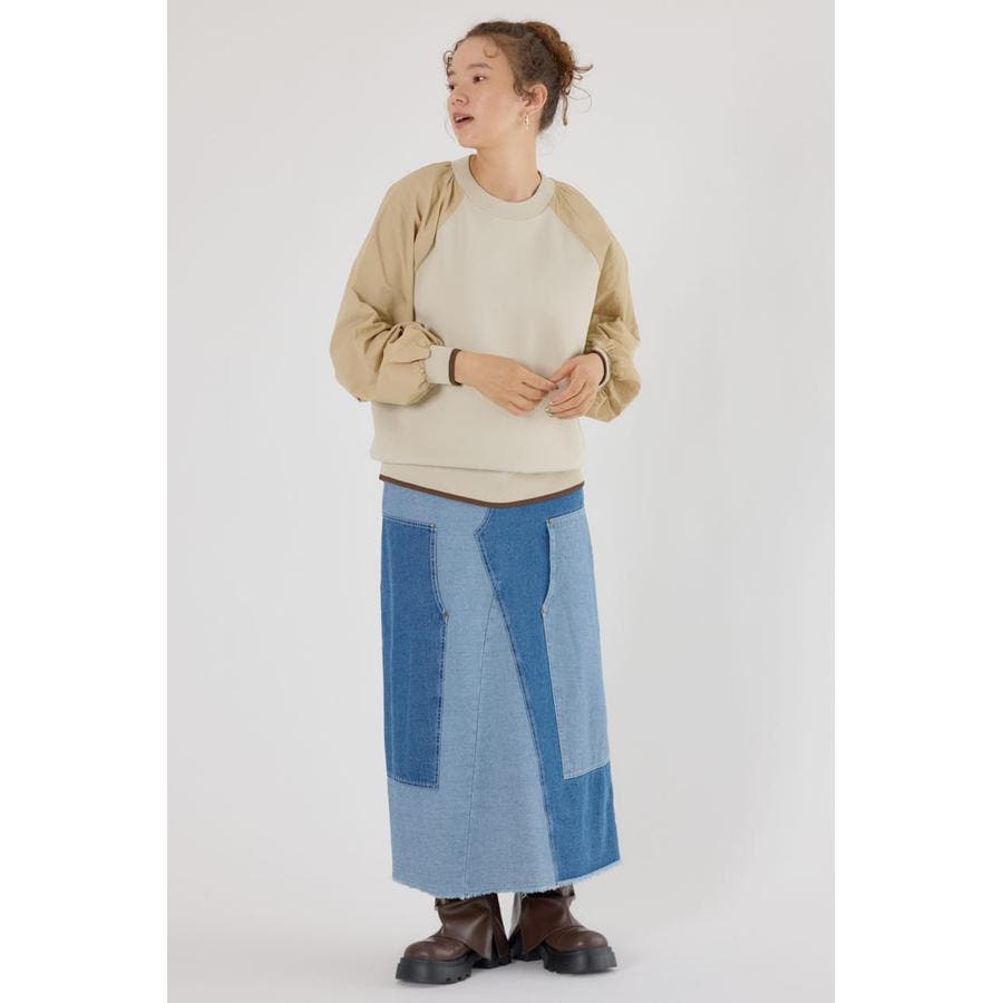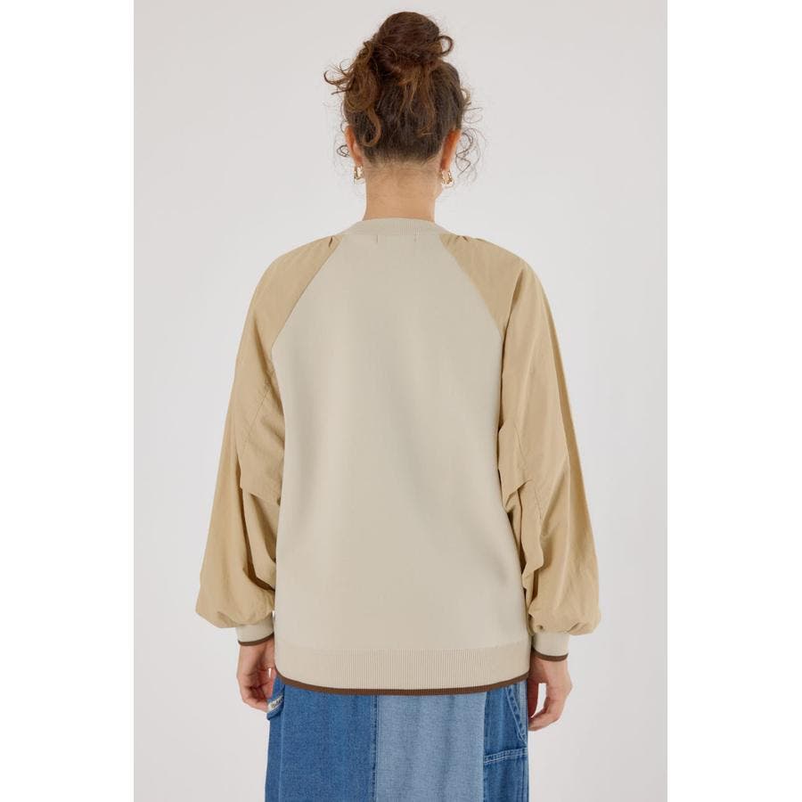 ボディはニット、スリーブは布帛の異素材が旬なプルオーバー。