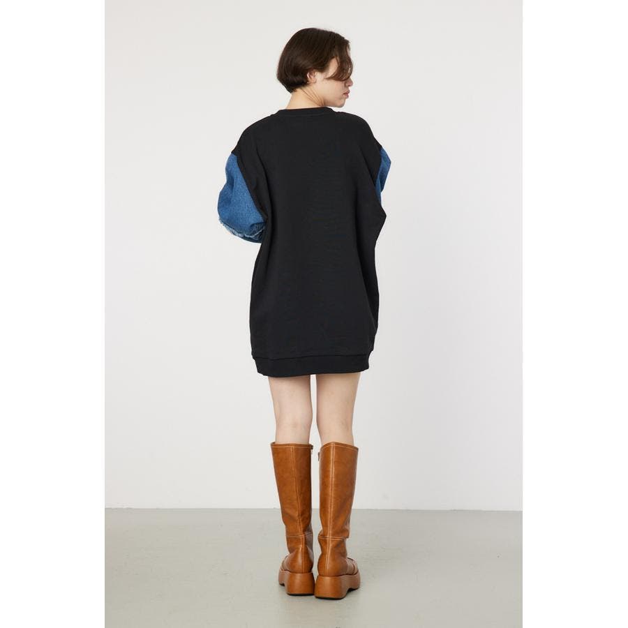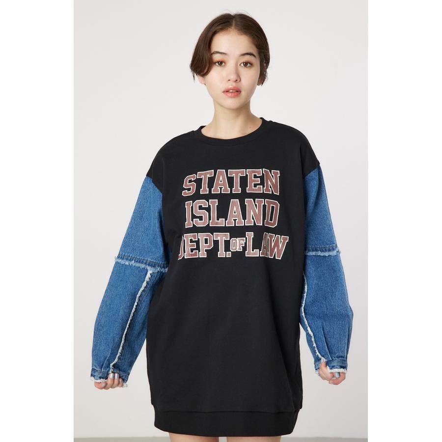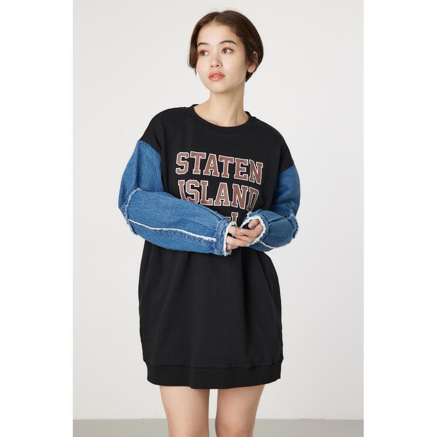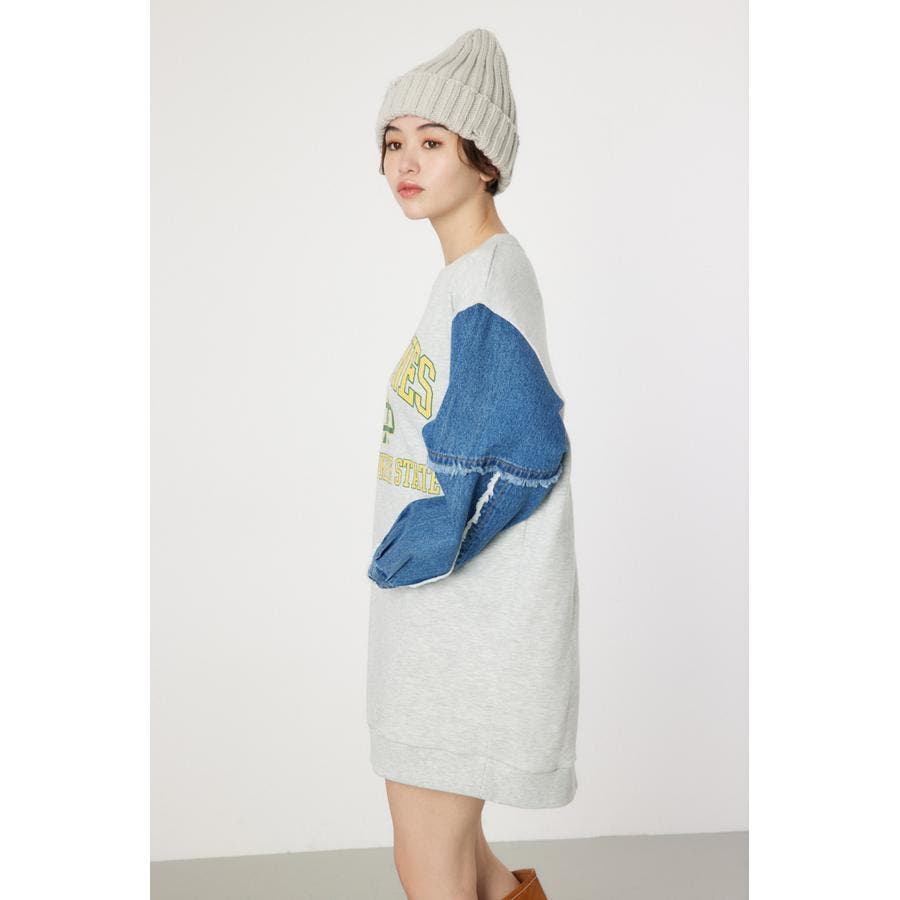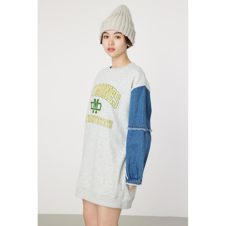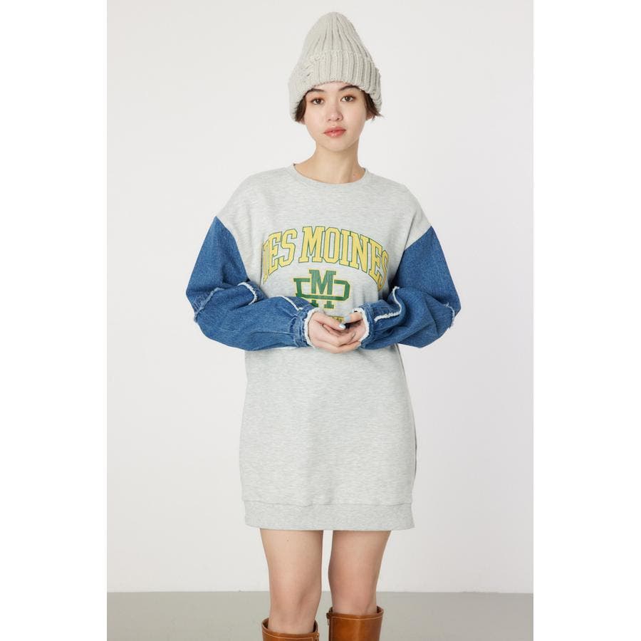 大人気のデニムドッキングアイテムが登場。スウェットワンピースとデニムジャケットをドッキングしたようなデザインのワンピース。カラーによって異なるカレッジデザインがポイント。