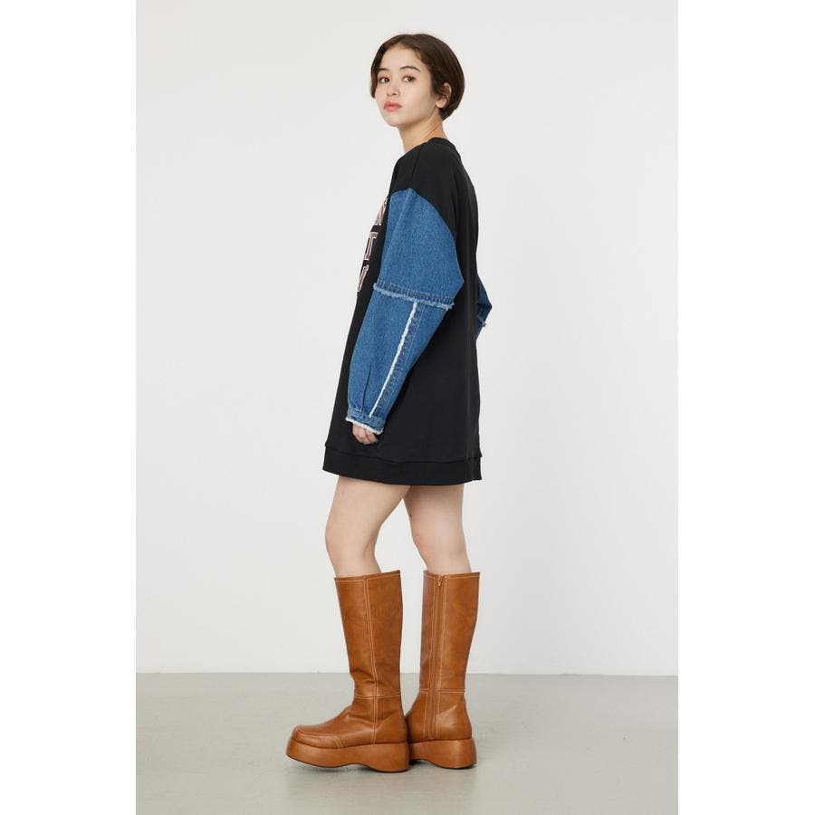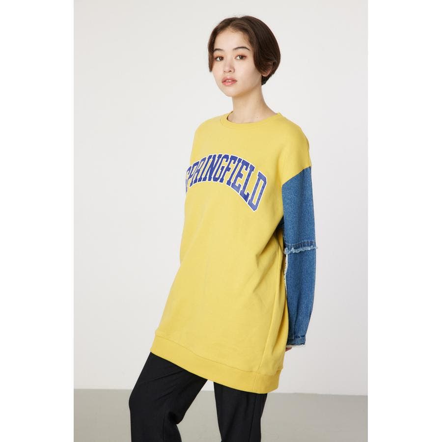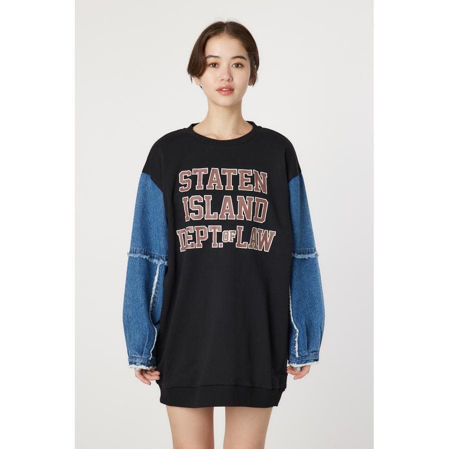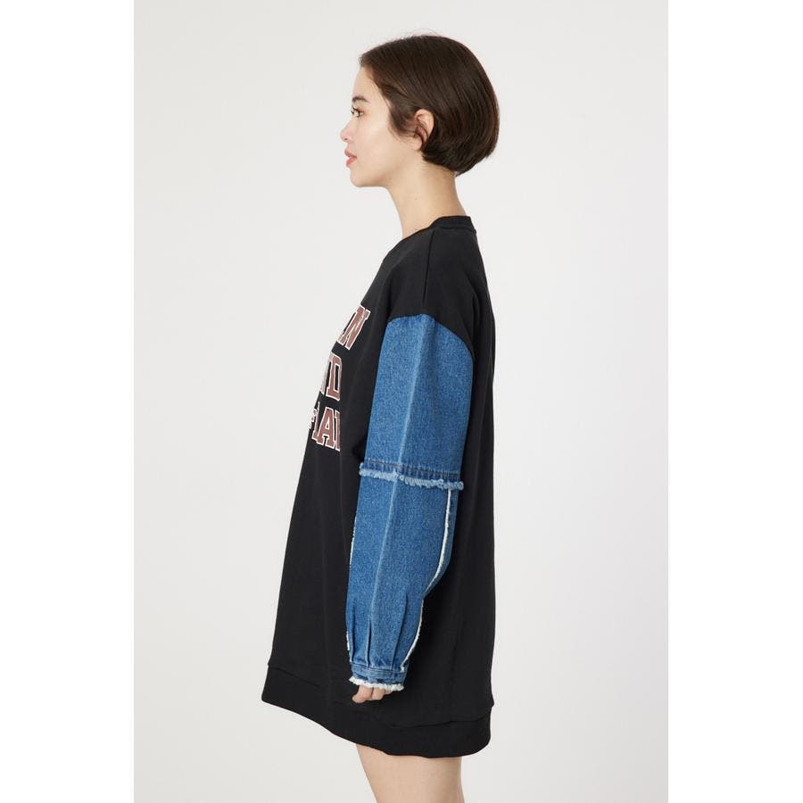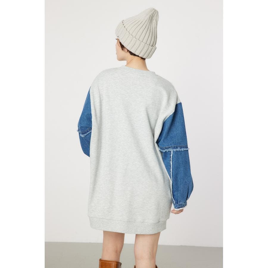 大人気のデニムドッキングアイテムが登場。スウェットワンピースとデニムジャケットをドッキングしたようなデザインのワンピース。カラーによって異なるカレッジデザインがポイント。
