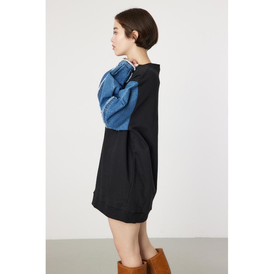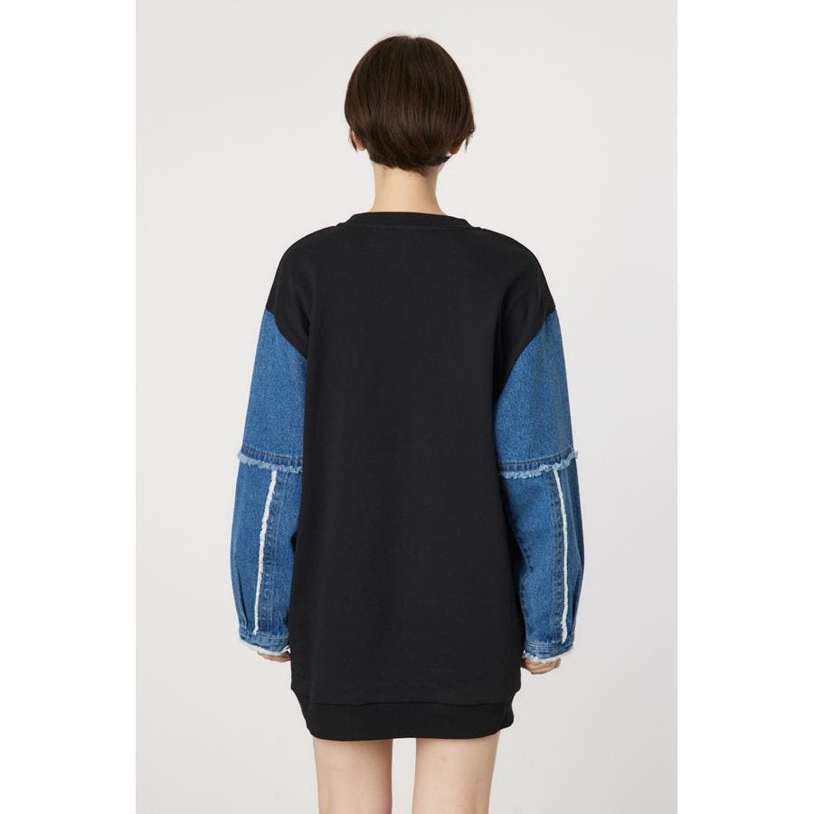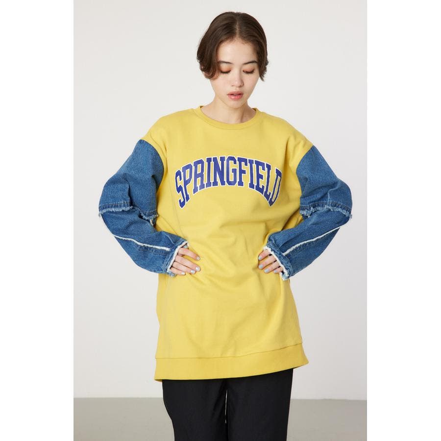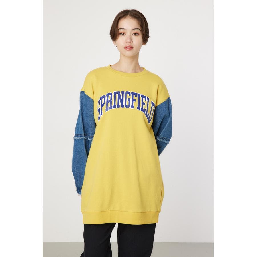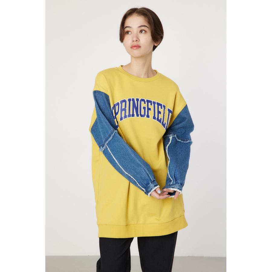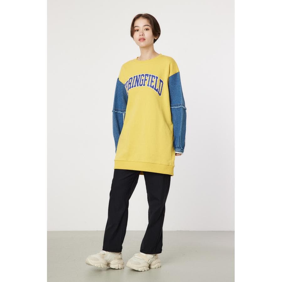 大人気のデニムドッキングアイテムが登場。スウェットワンピースとデニムジャケットをドッキングしたようなデザインのワンピース。カラーによって異なるカレッジデザインがポイント。