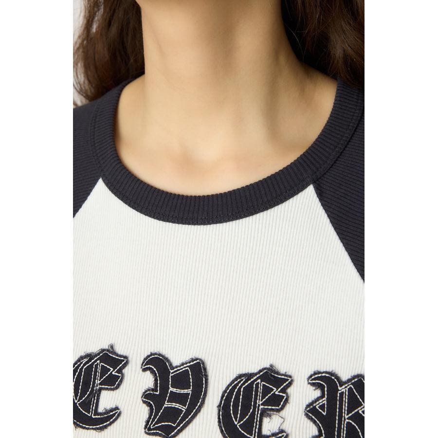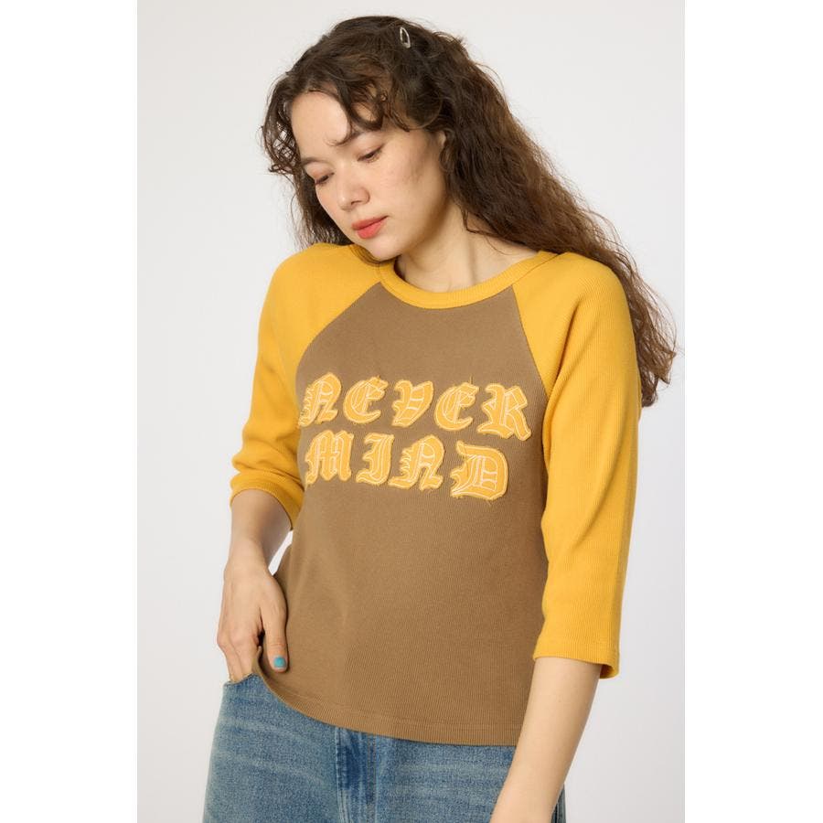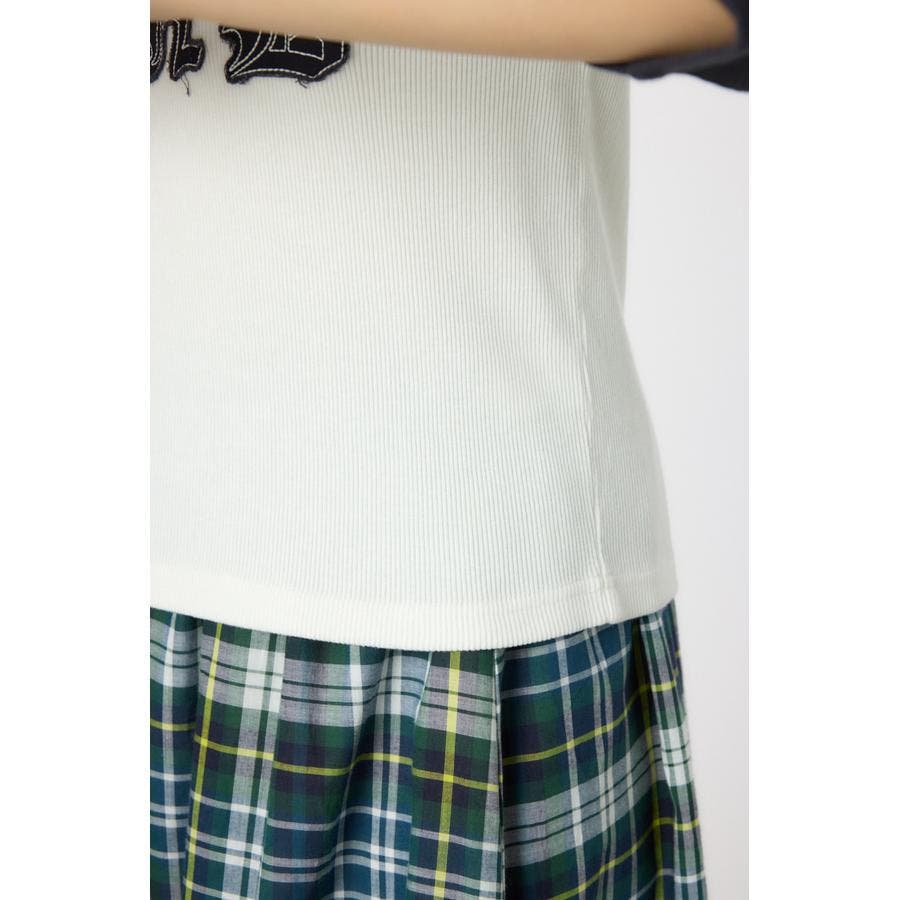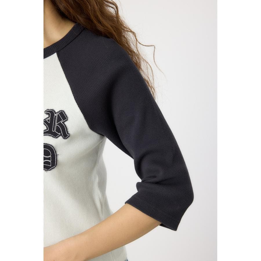 タイトめなサイズ感と、ダメージを加えたオールドイングリッシュのレタリングアップリケがヴィンテージ感たっぷりなリブ生地のTシャツです。