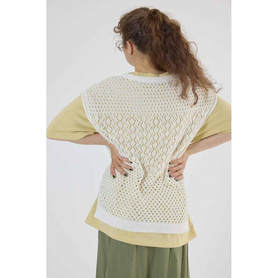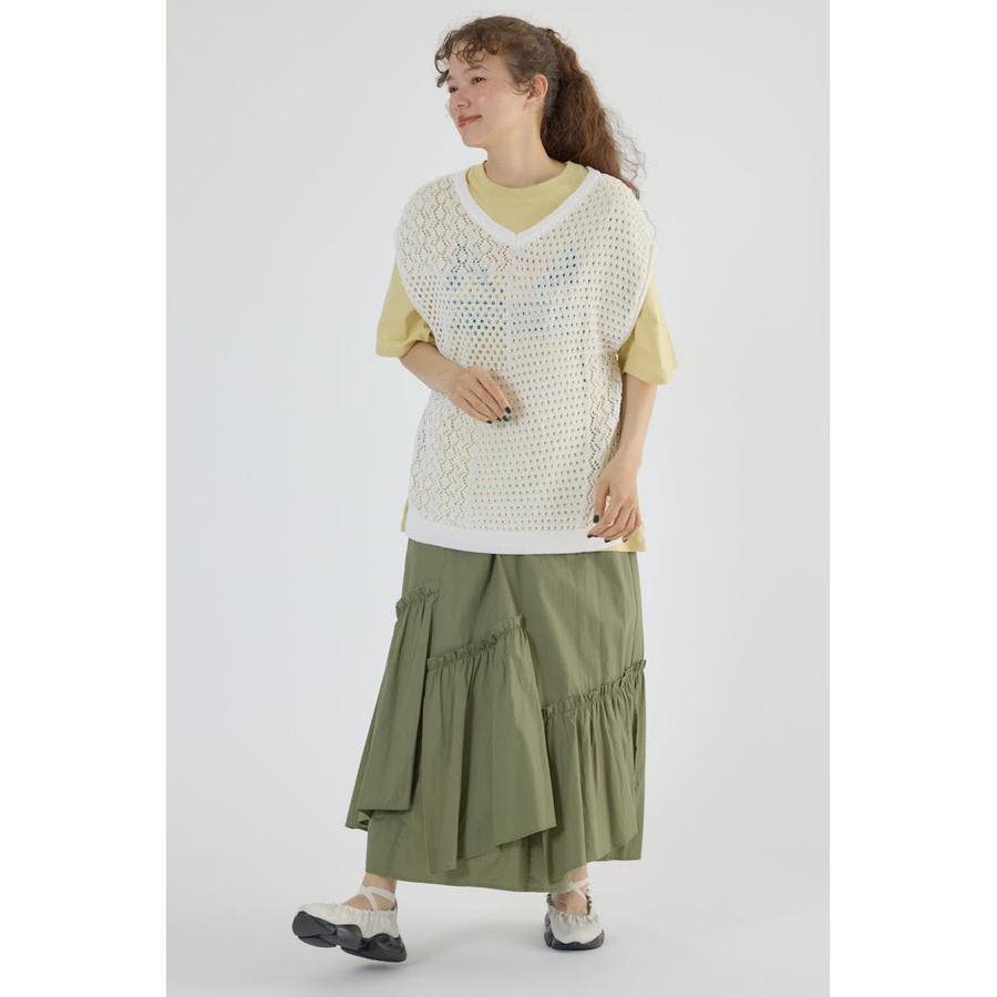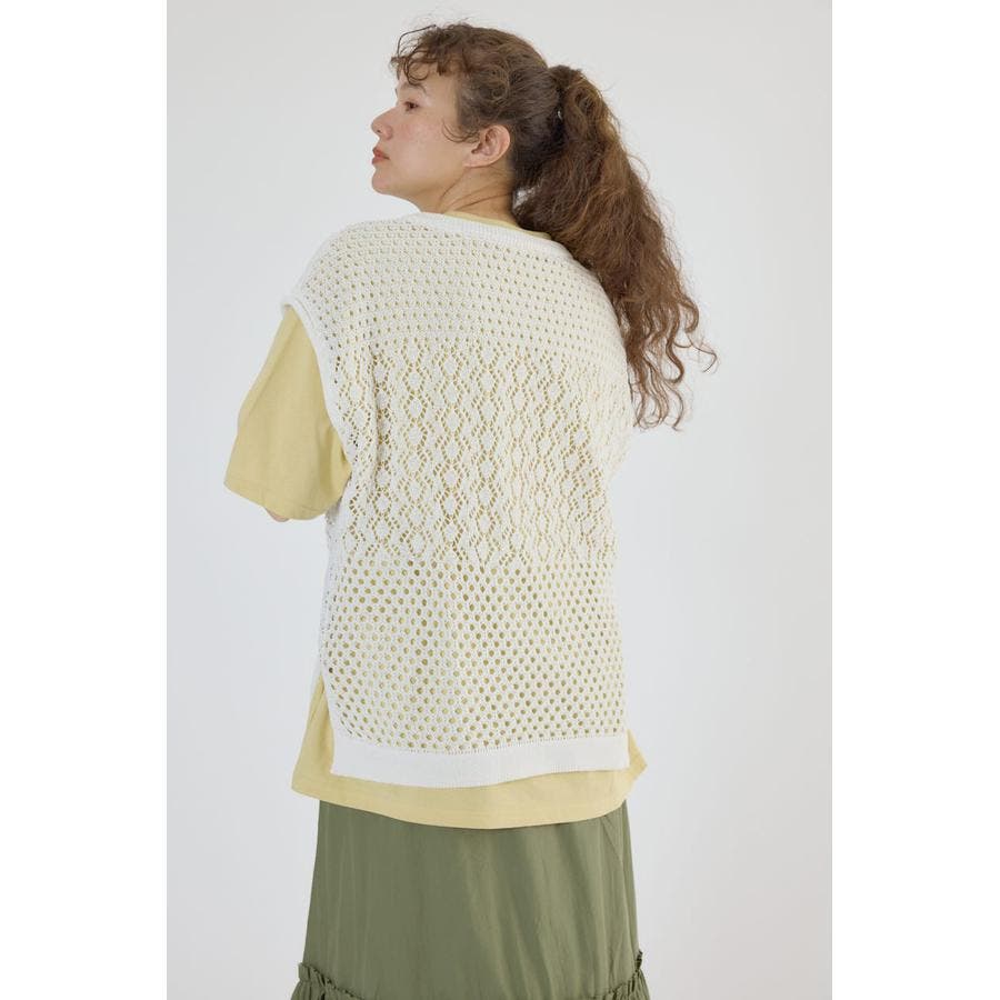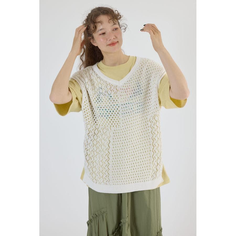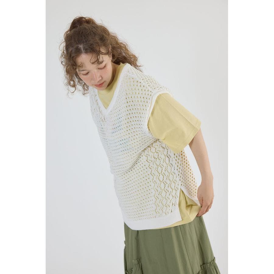 グラフィックTシャツを着て透けデザインをさらに活かし、ベストとしてのスタイリングも可愛いです。