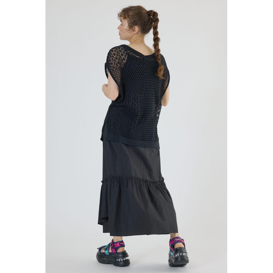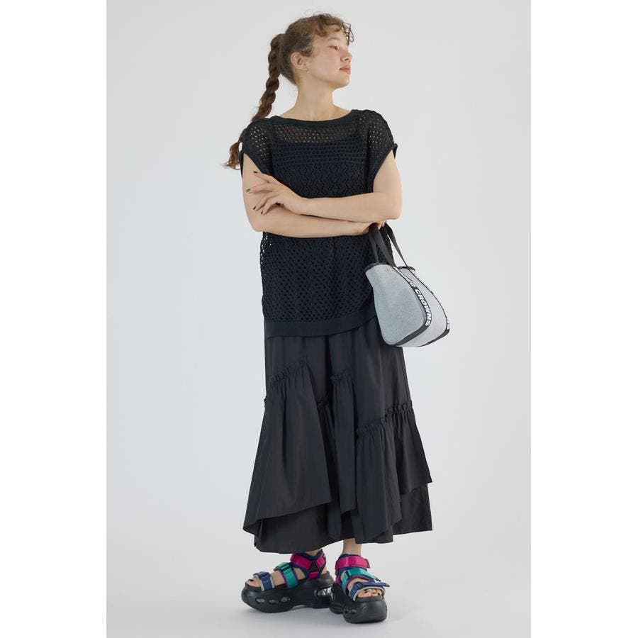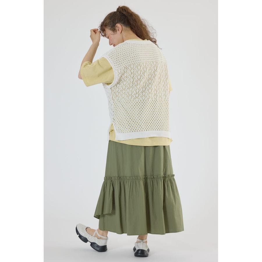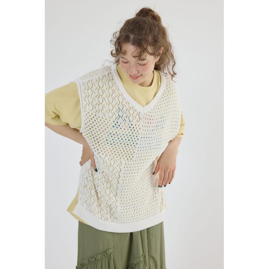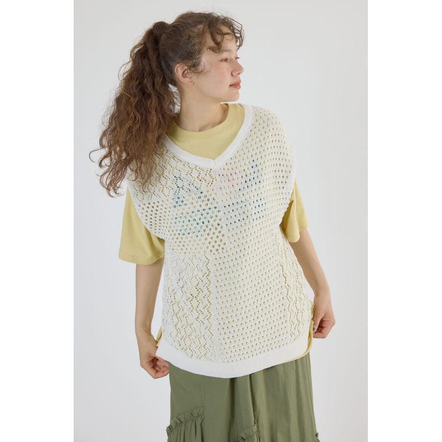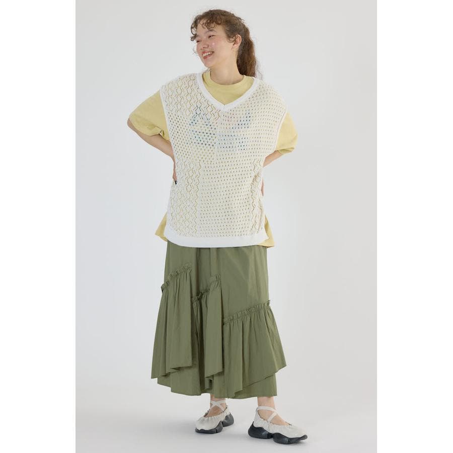 グラフィックTシャツを着て透けデザインをさらに活かし、ベストとしてのスタイリングも可愛いです。