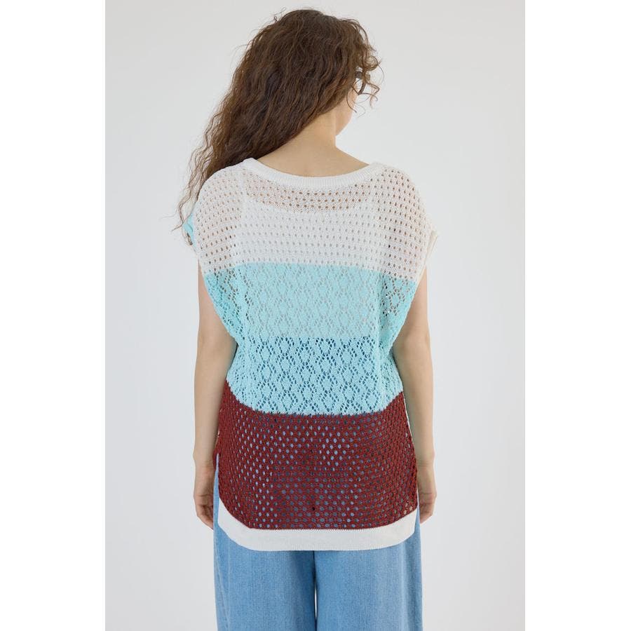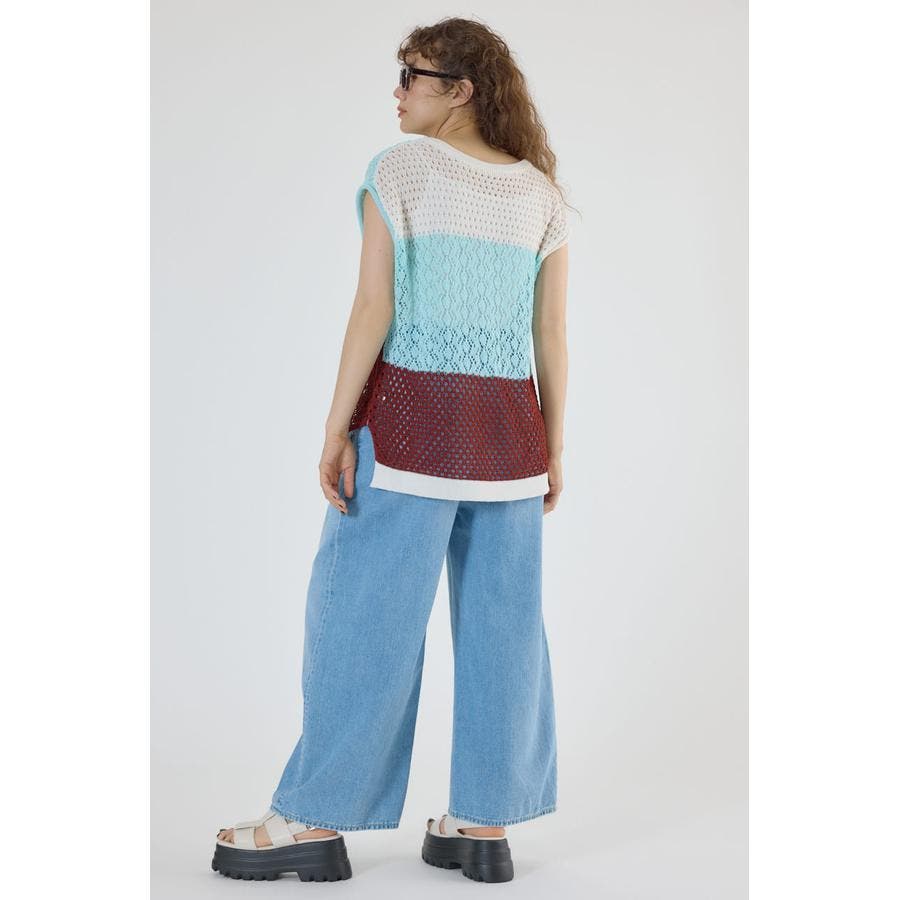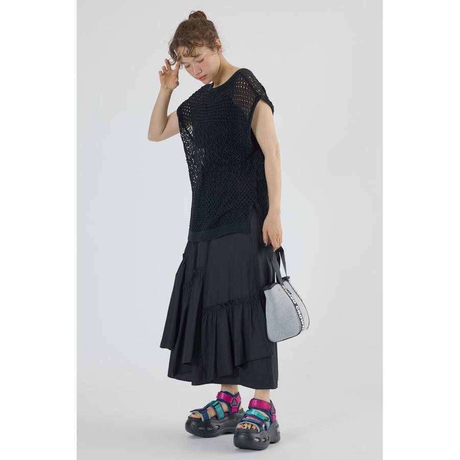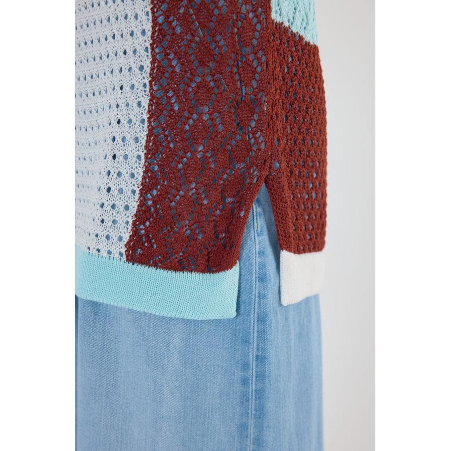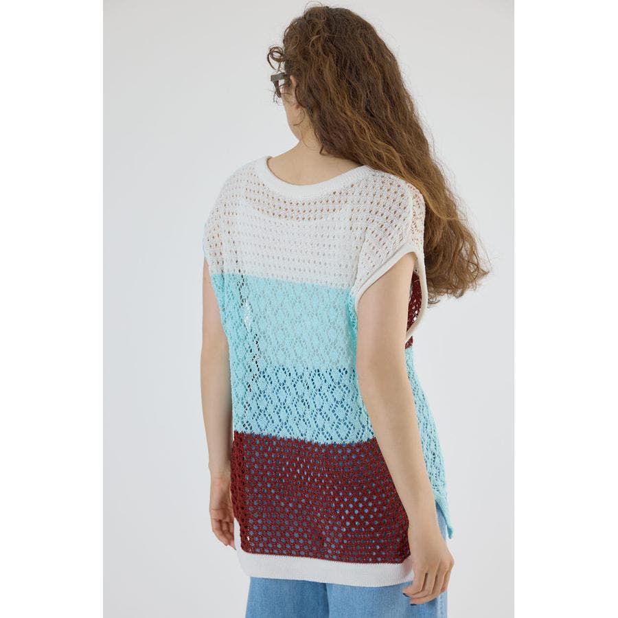 フロントとバックの表情が違う前後で着用できる透かしニット。