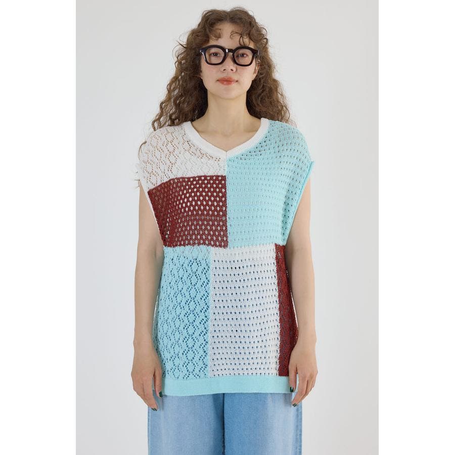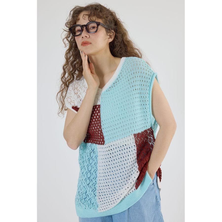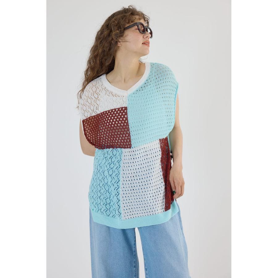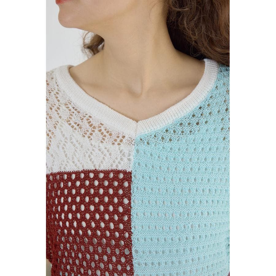 パッチワークしたようなデザインは三種類の編地をミックスしています。