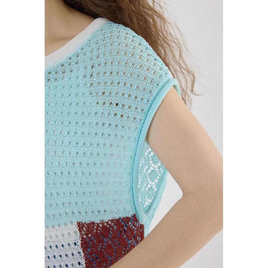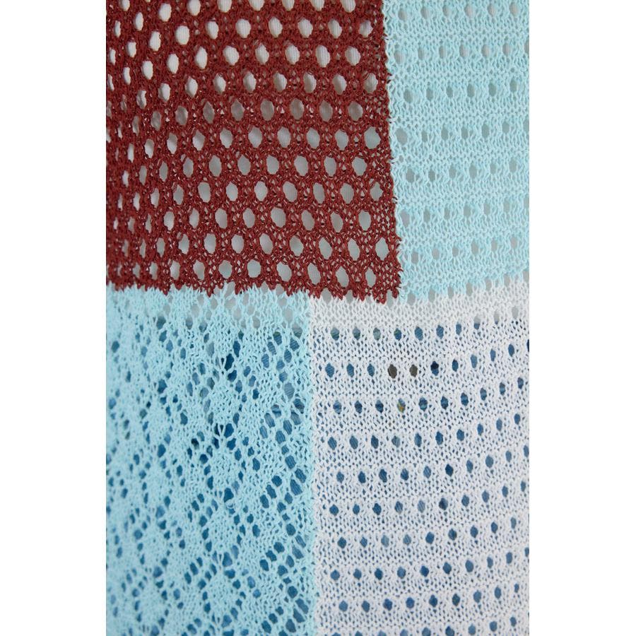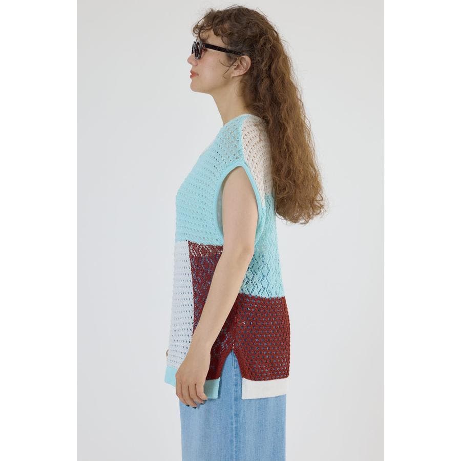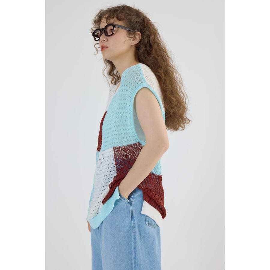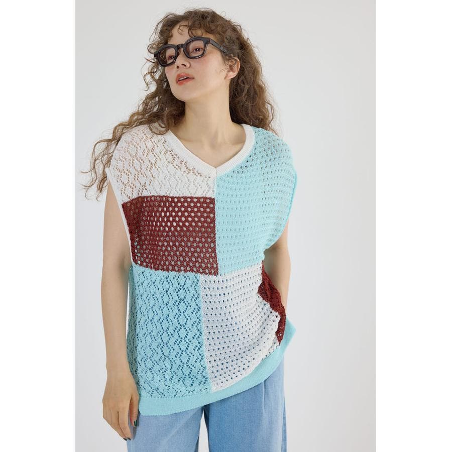 パッチワークしたようなデザインは三種類の編地をミックスしています。