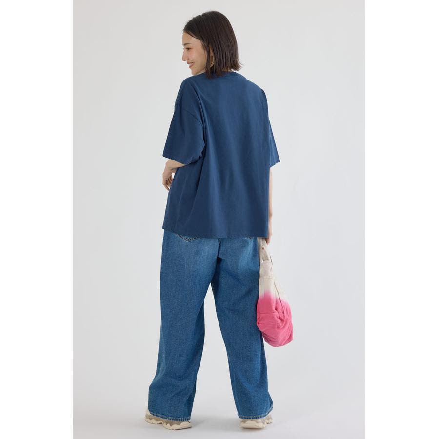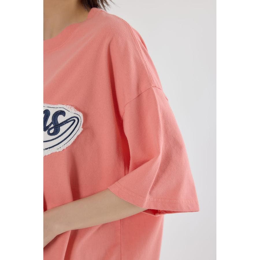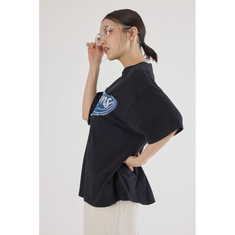 WHTとBLKにはデニム生地、PNKとNVYにはツイルのロゴアップリケが入るキャッチーなTシャツ。