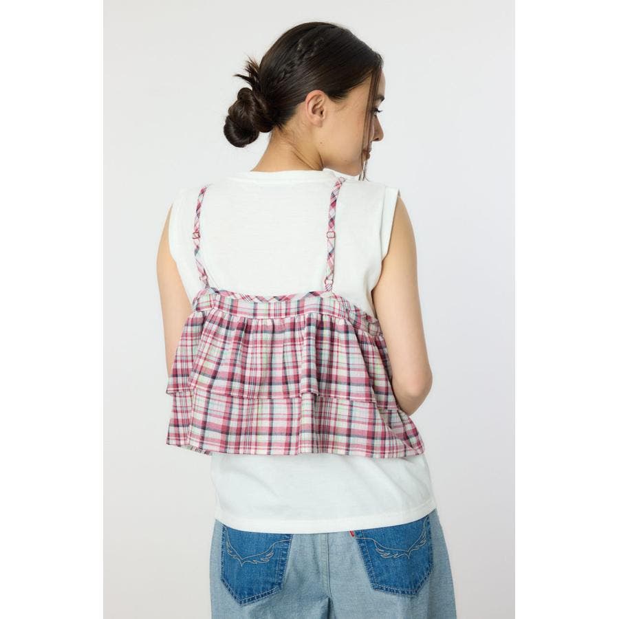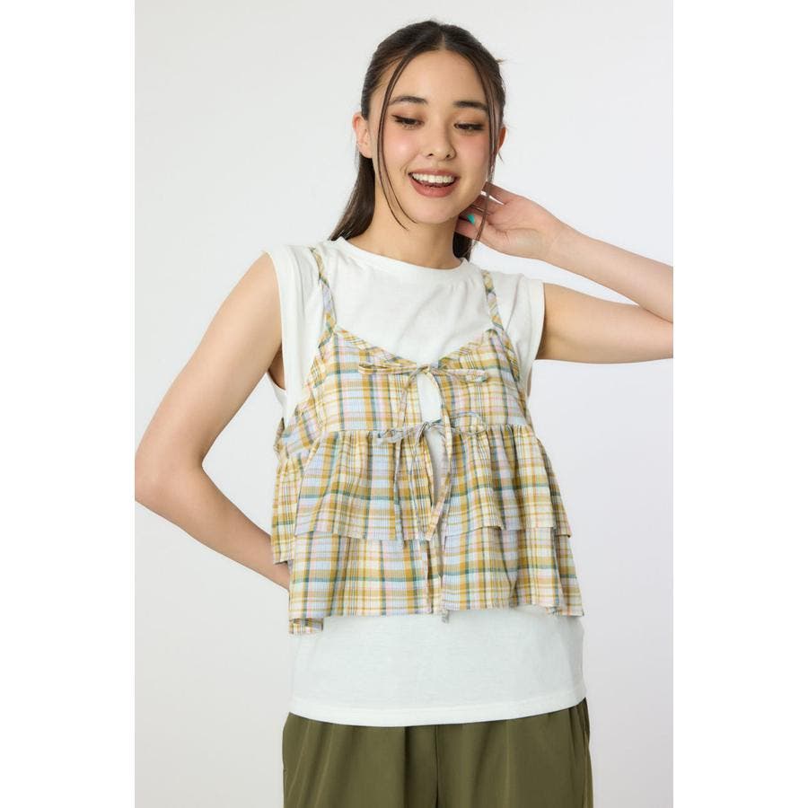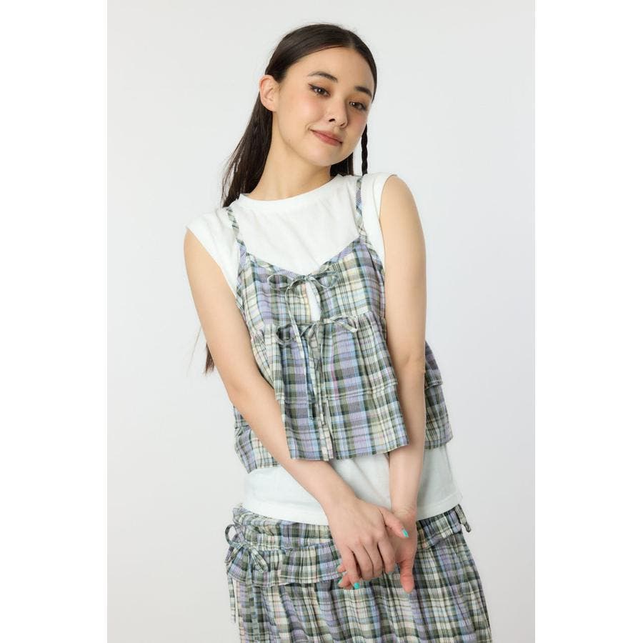 ネオンカラーがポイントになったチェック柄キャミソールと、無地で使い勝手の良いタンクトップがセットになったアイテム。