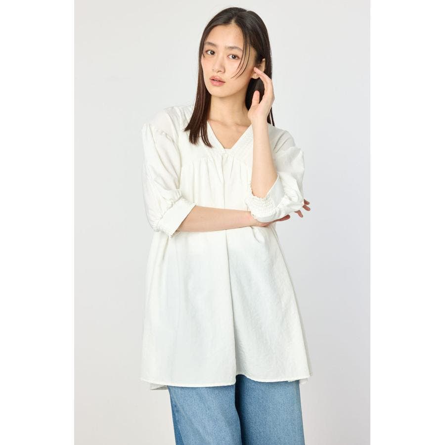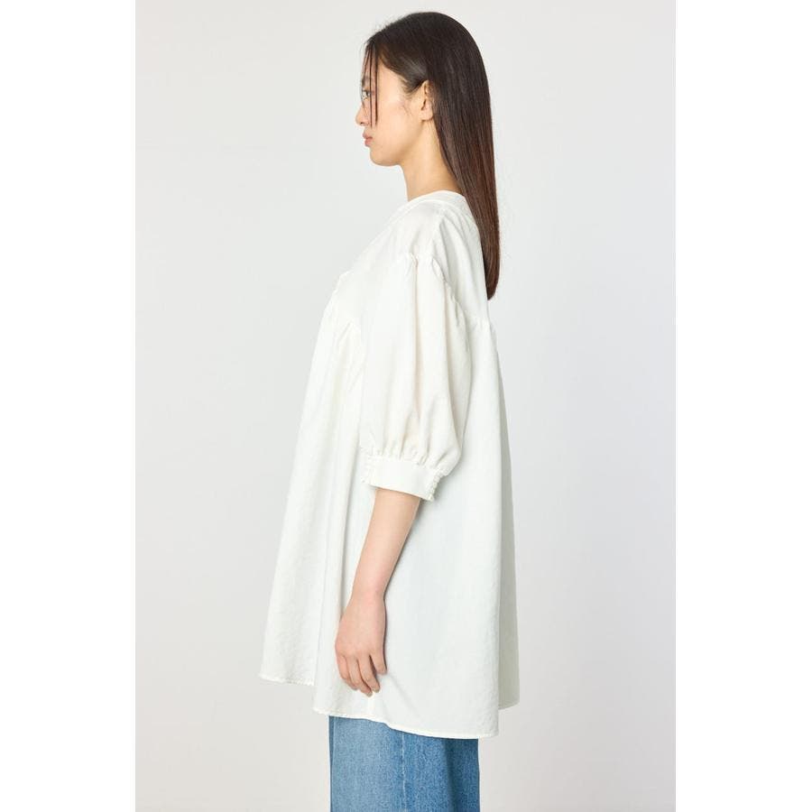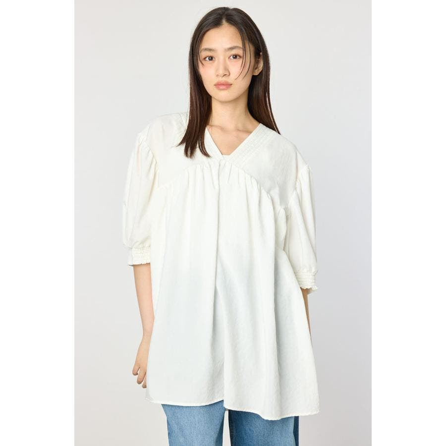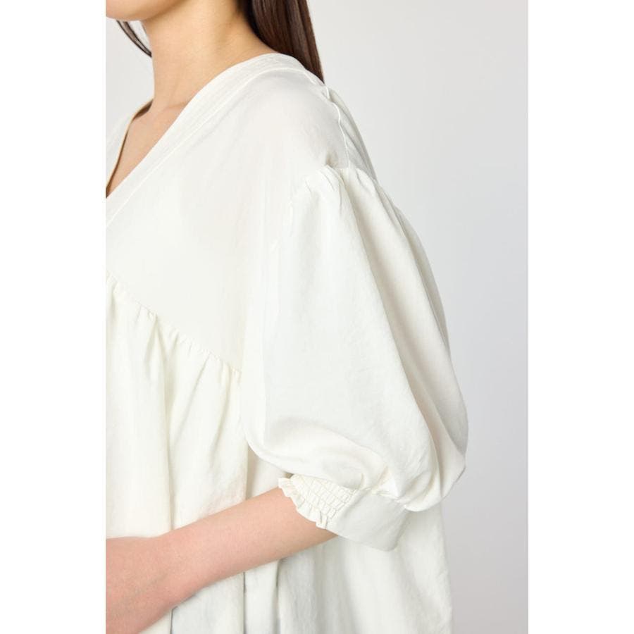 Vネックですっきりした印象と丸襟のボタンのかわいい印象を前後2WAYで着用できるブラウス。