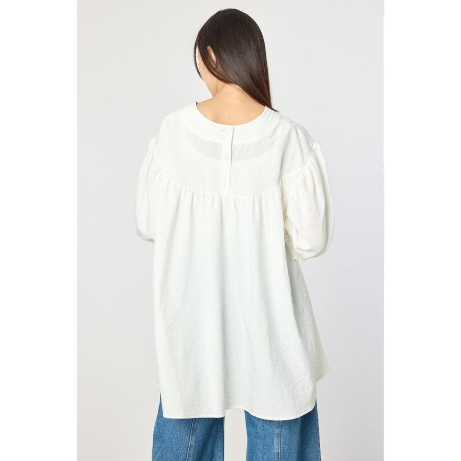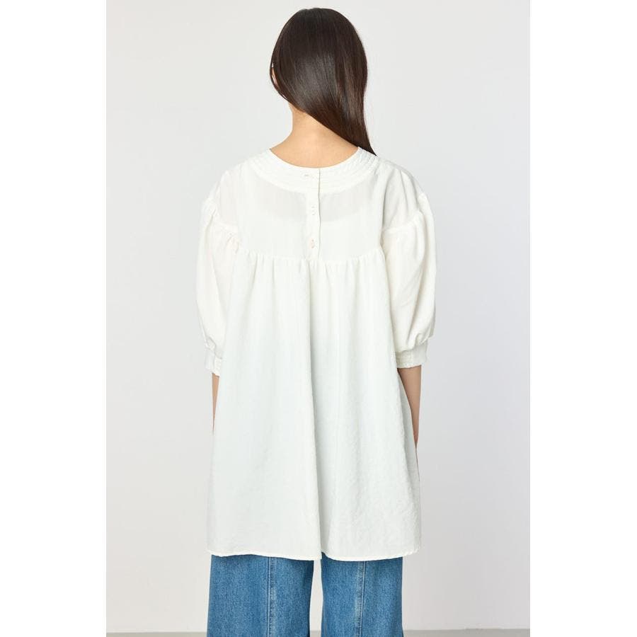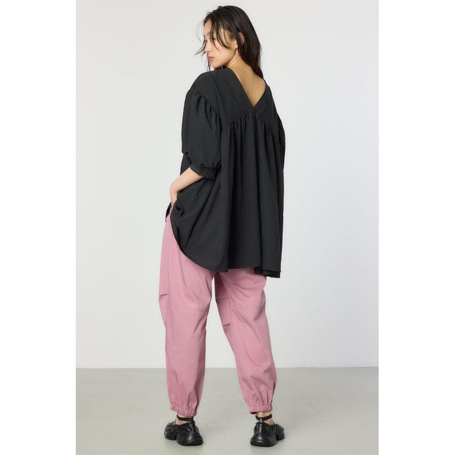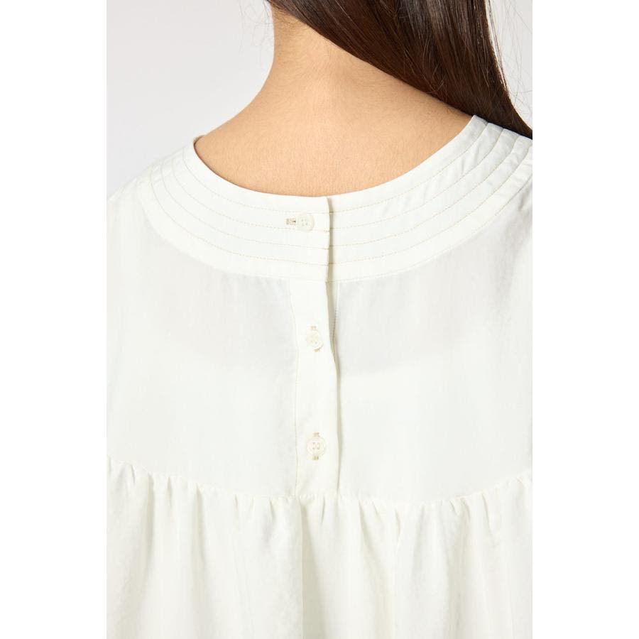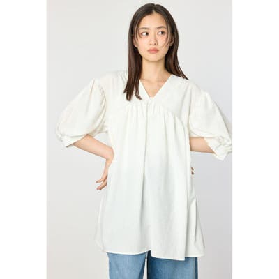 Vネックですっきりした印象と丸襟のボタンのかわいい印象を前後2WAYで着用できるブラウス。