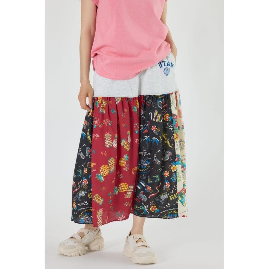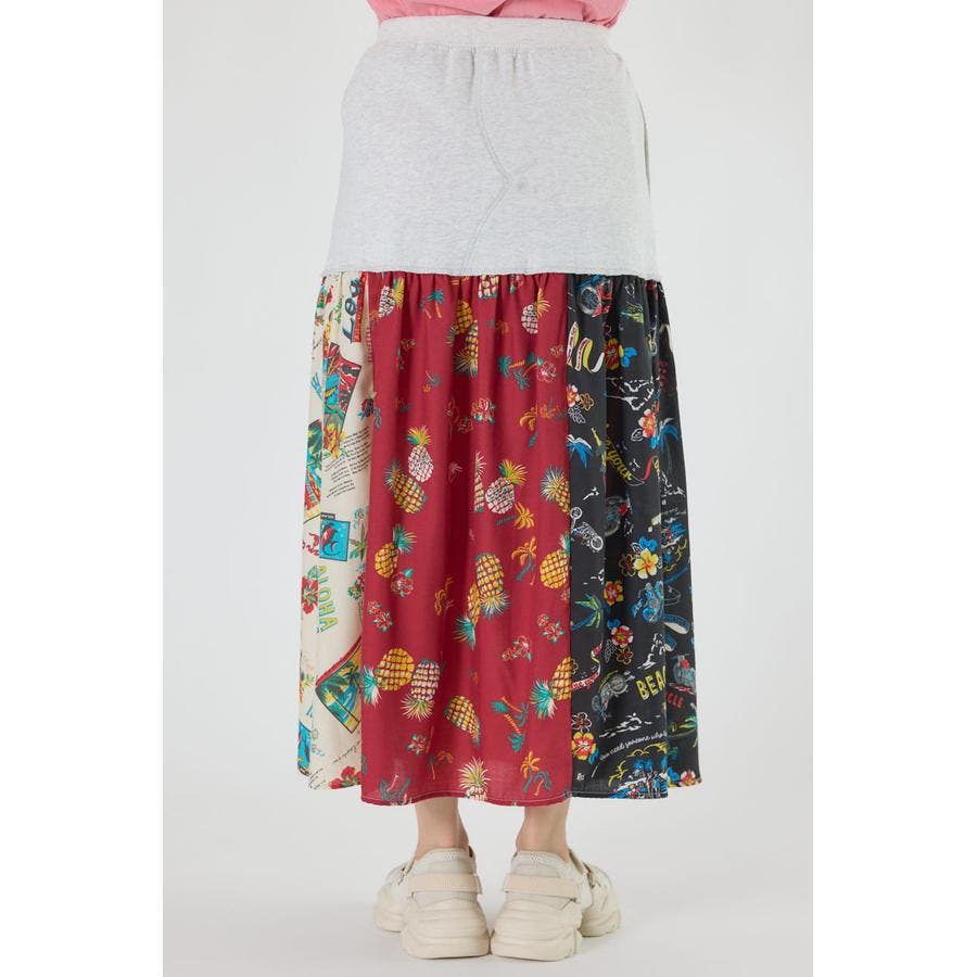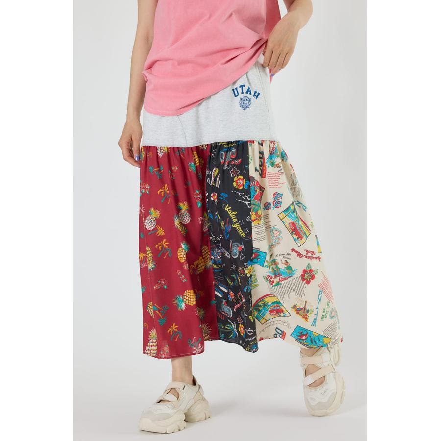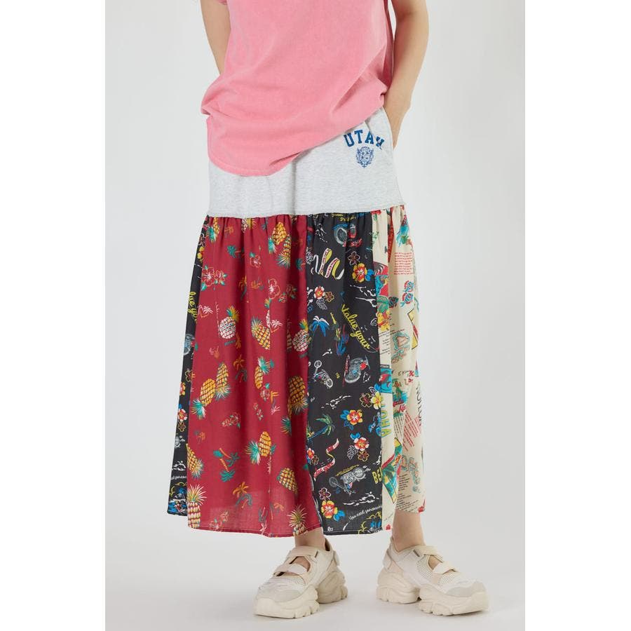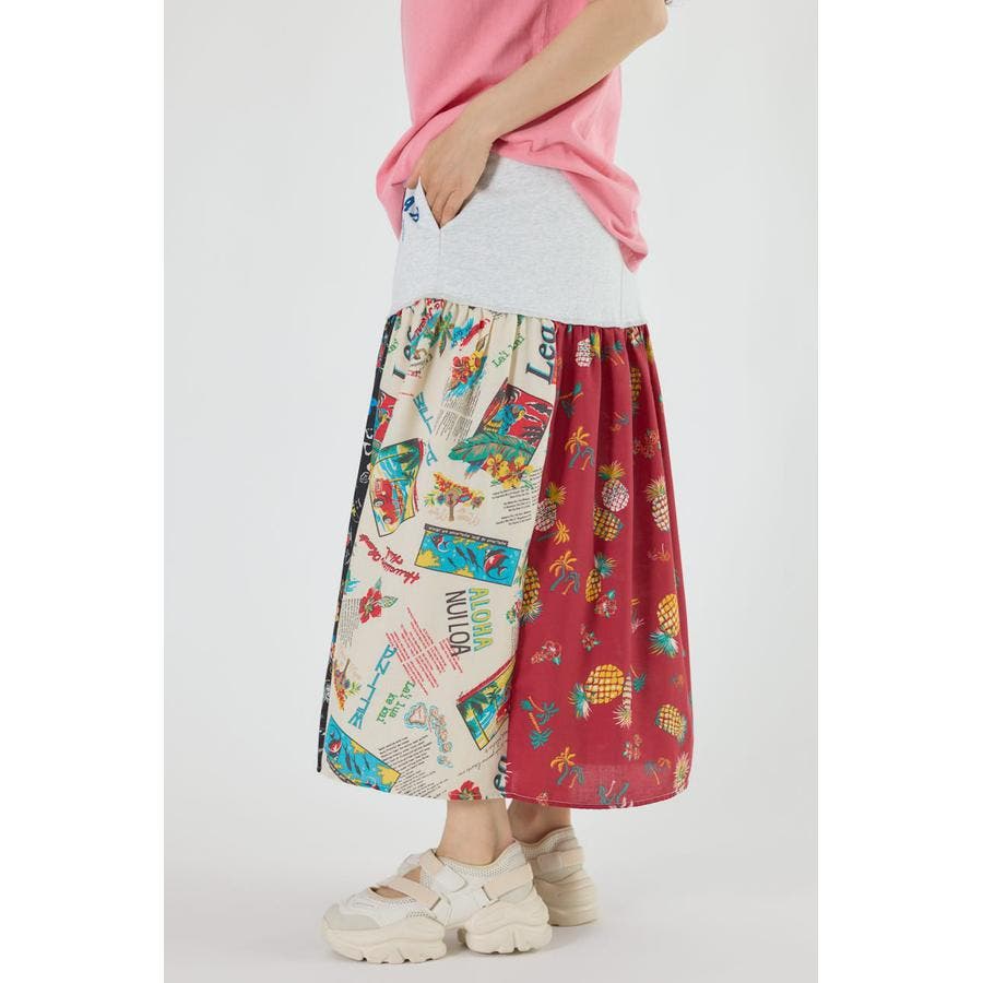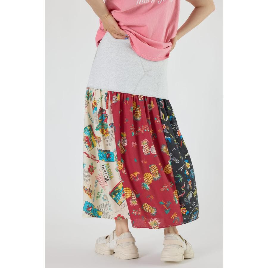 三種のアロハ柄を、パッチワークにして裏毛とドッキングしたトレンドライクなスカート。