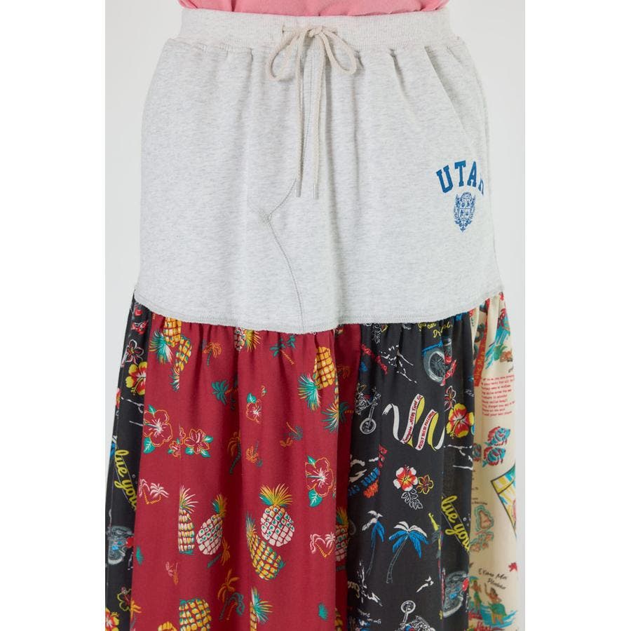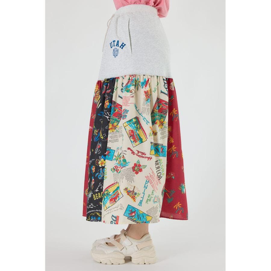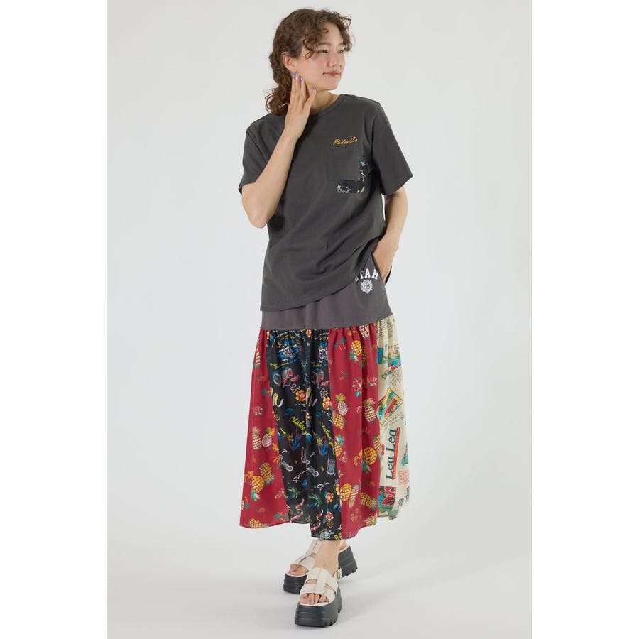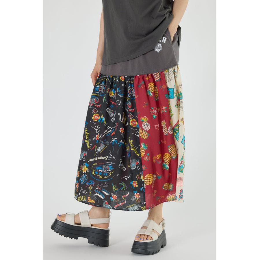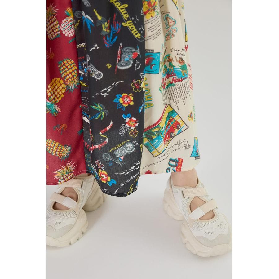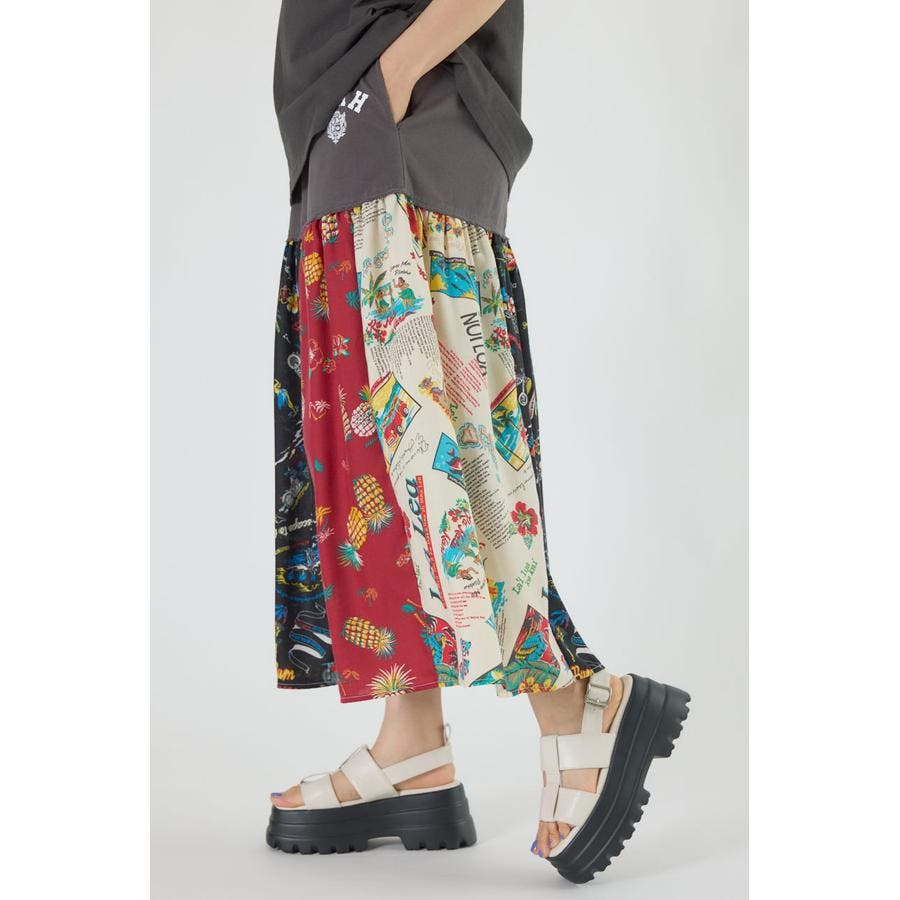 三種のアロハ柄を、パッチワークにして裏毛とドッキングしたトレンドライクなスカート。