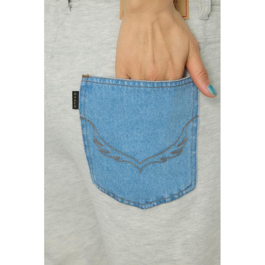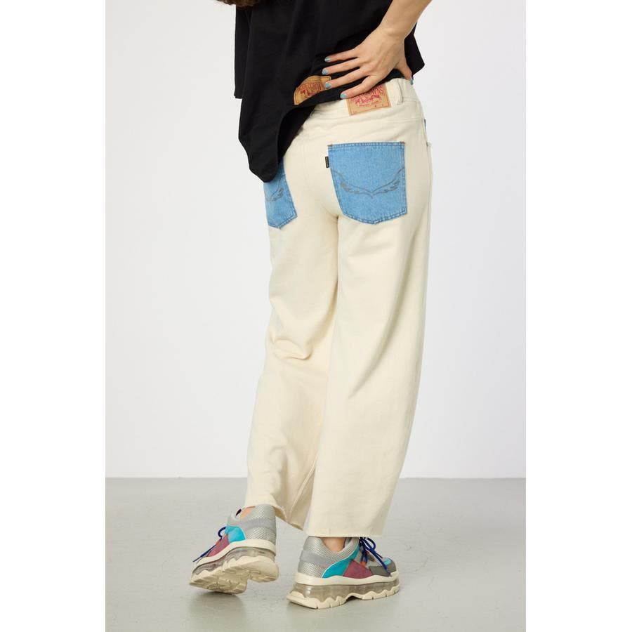 重ね着のようなダブルウエストデザインになっており、ウエストにはスピンドルを通し、後ウエストにはデニムと同様の紙パッチ、後ポケットには刺繍入りピスネームを付けました。