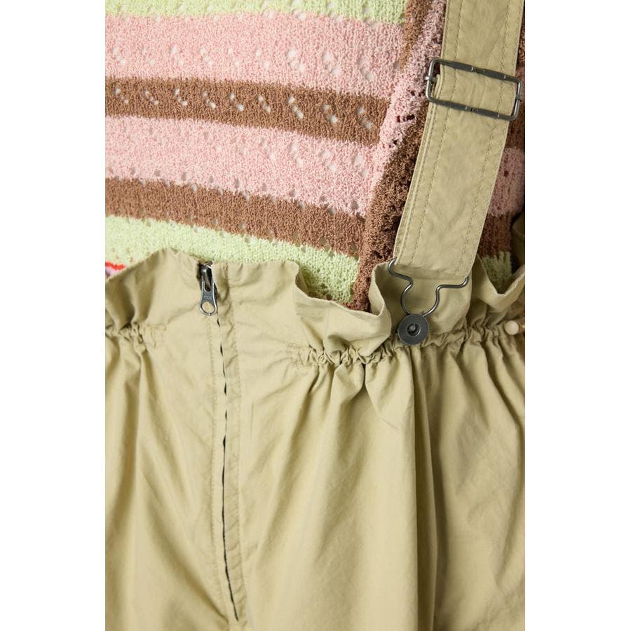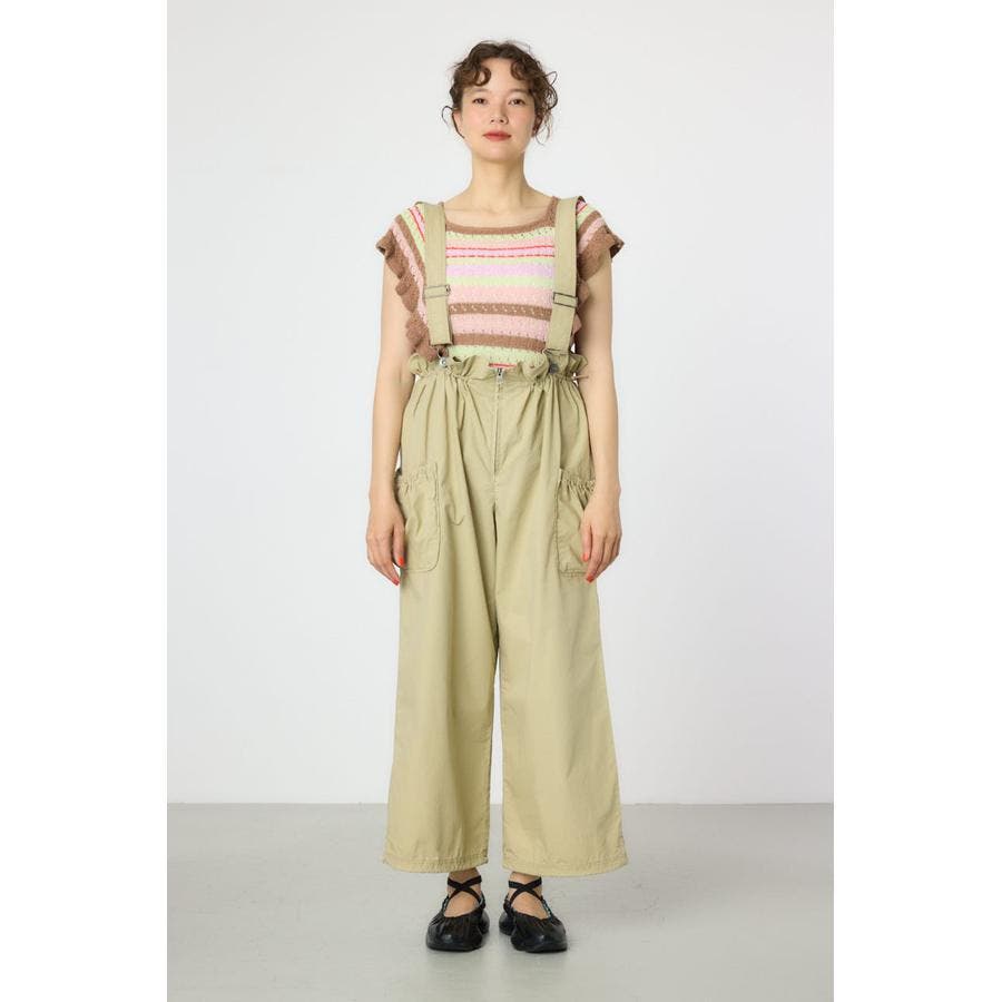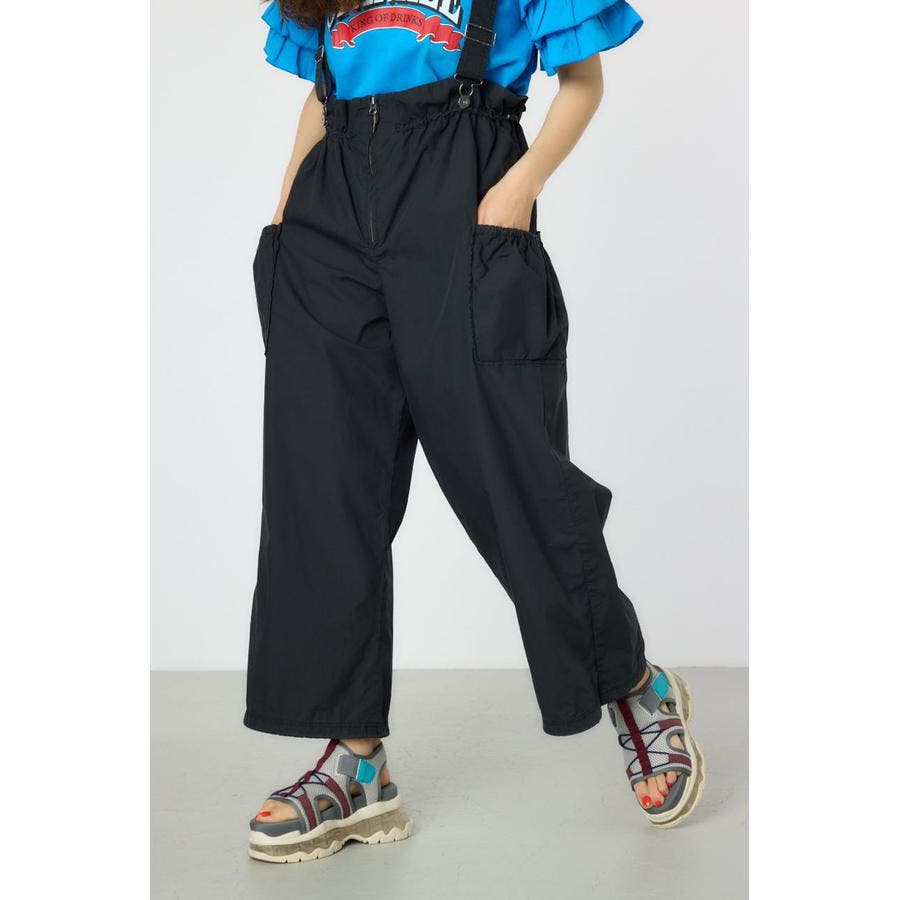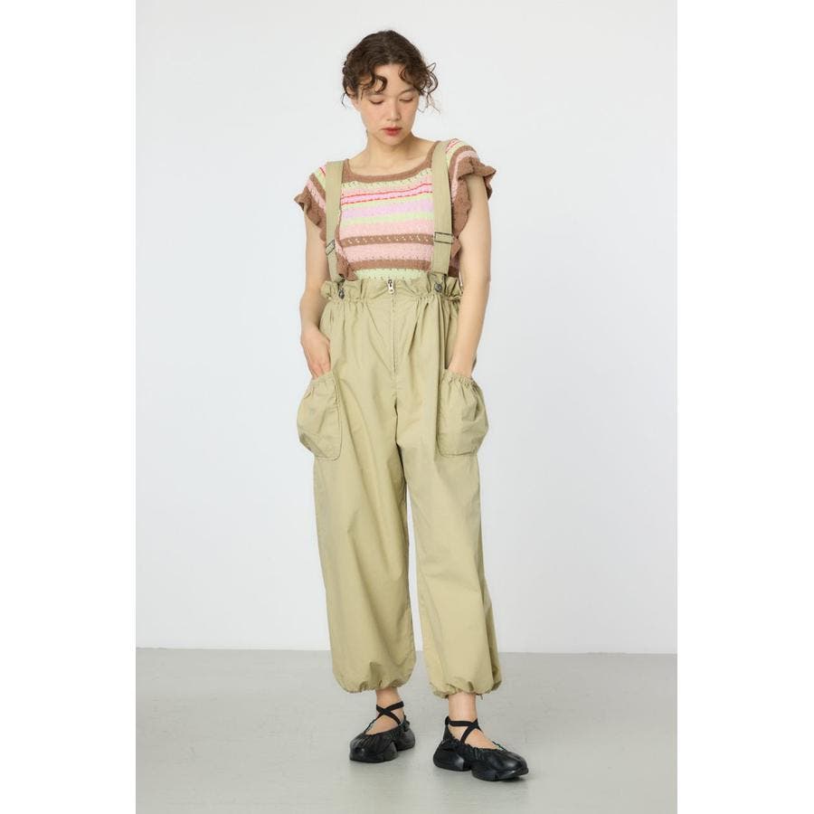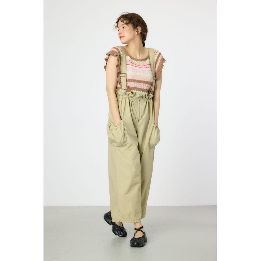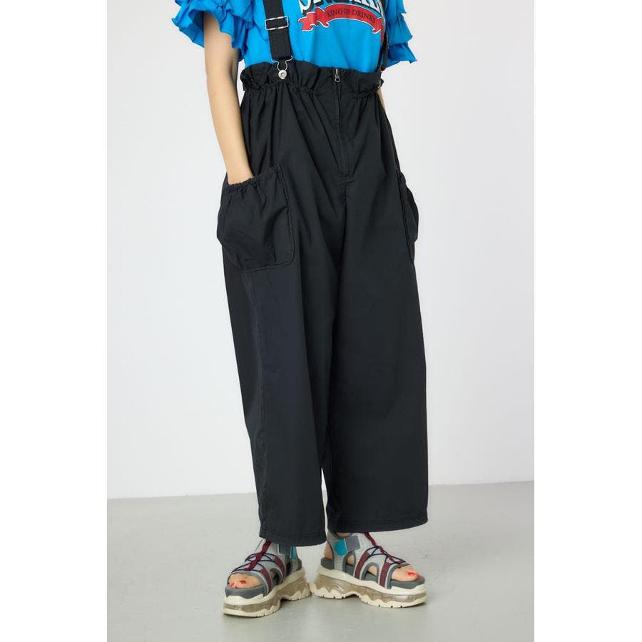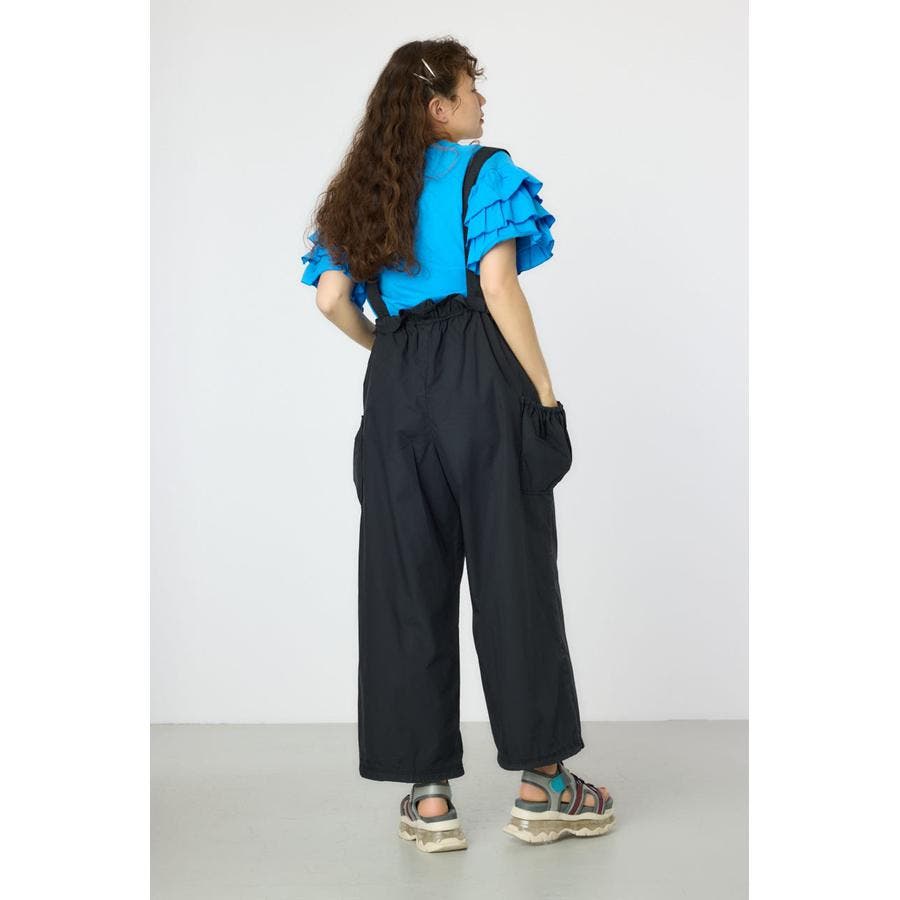 ウエストのフリルがポイントになるサス付きパンツ。