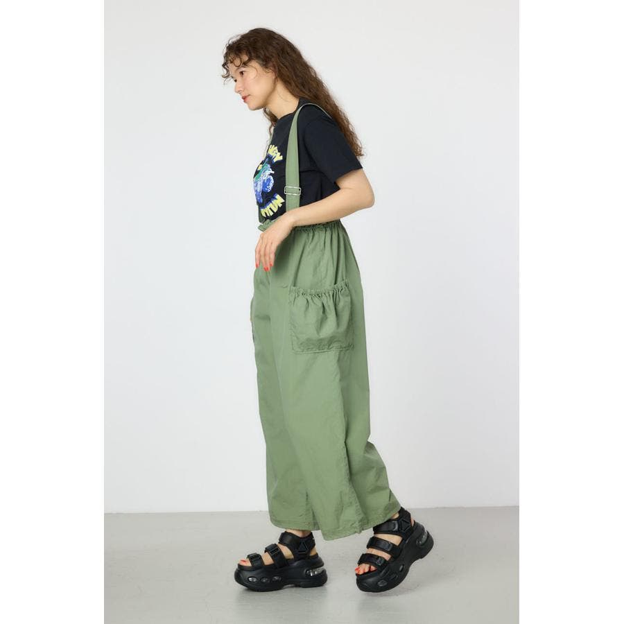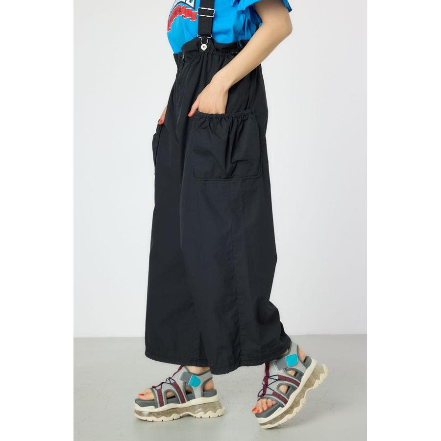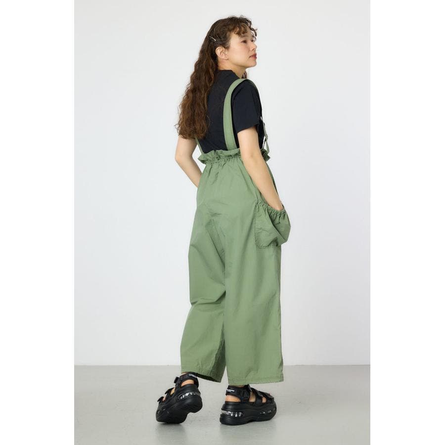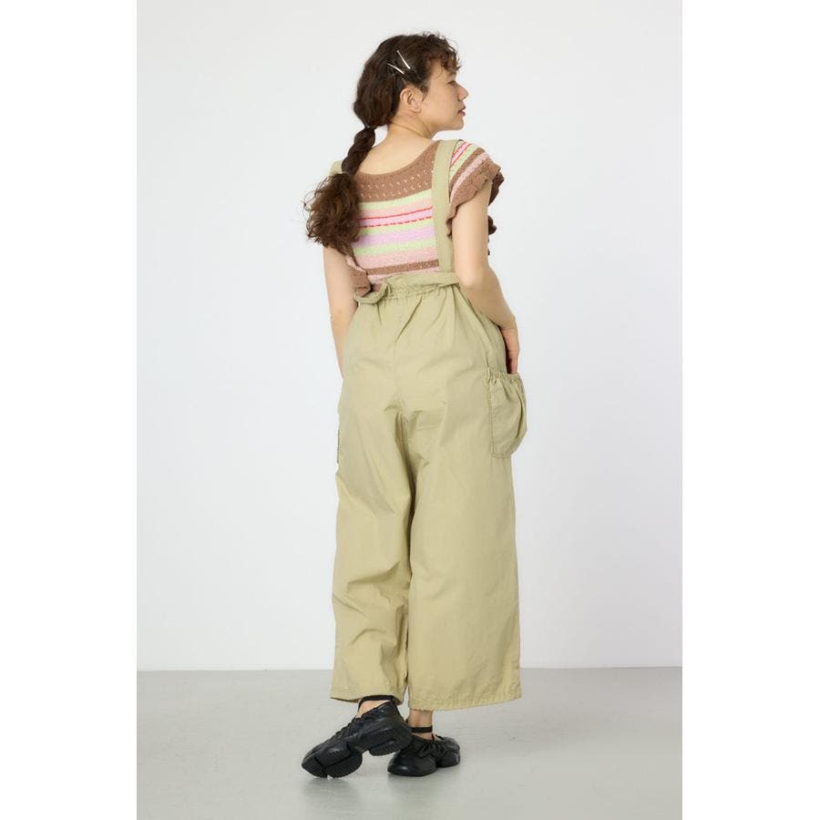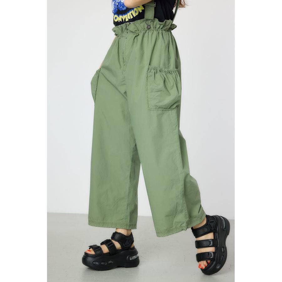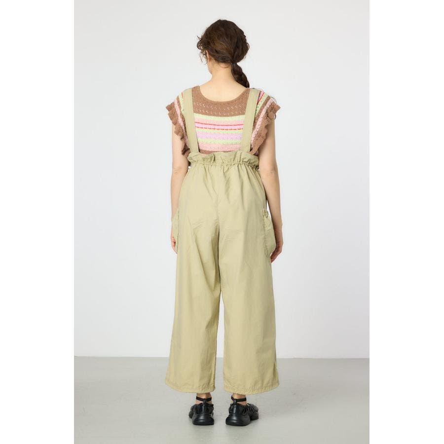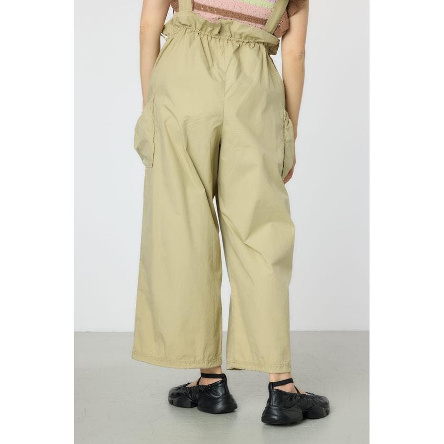 ウエストのフリルがポイントになるサス付きパンツ。