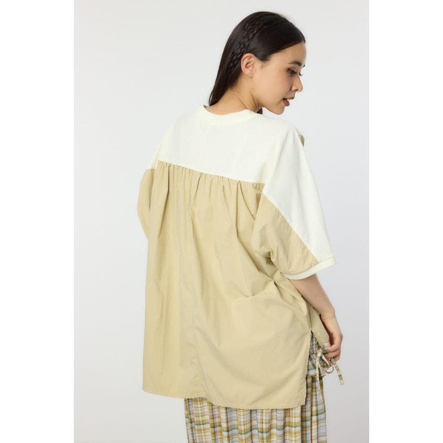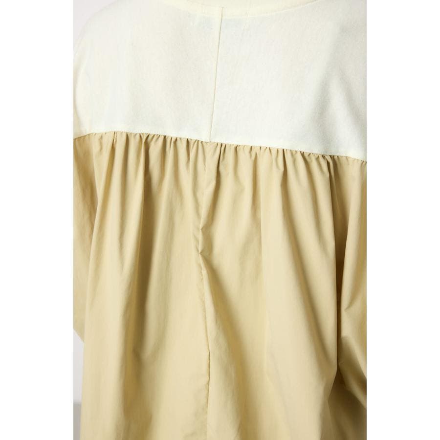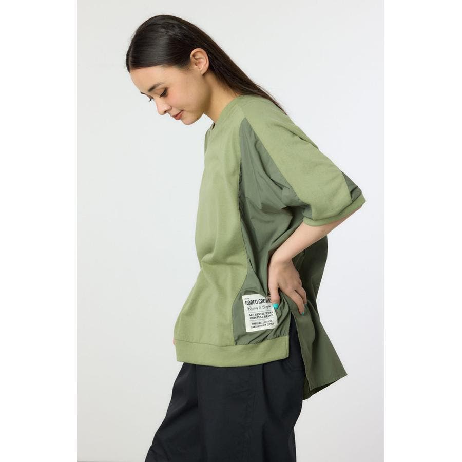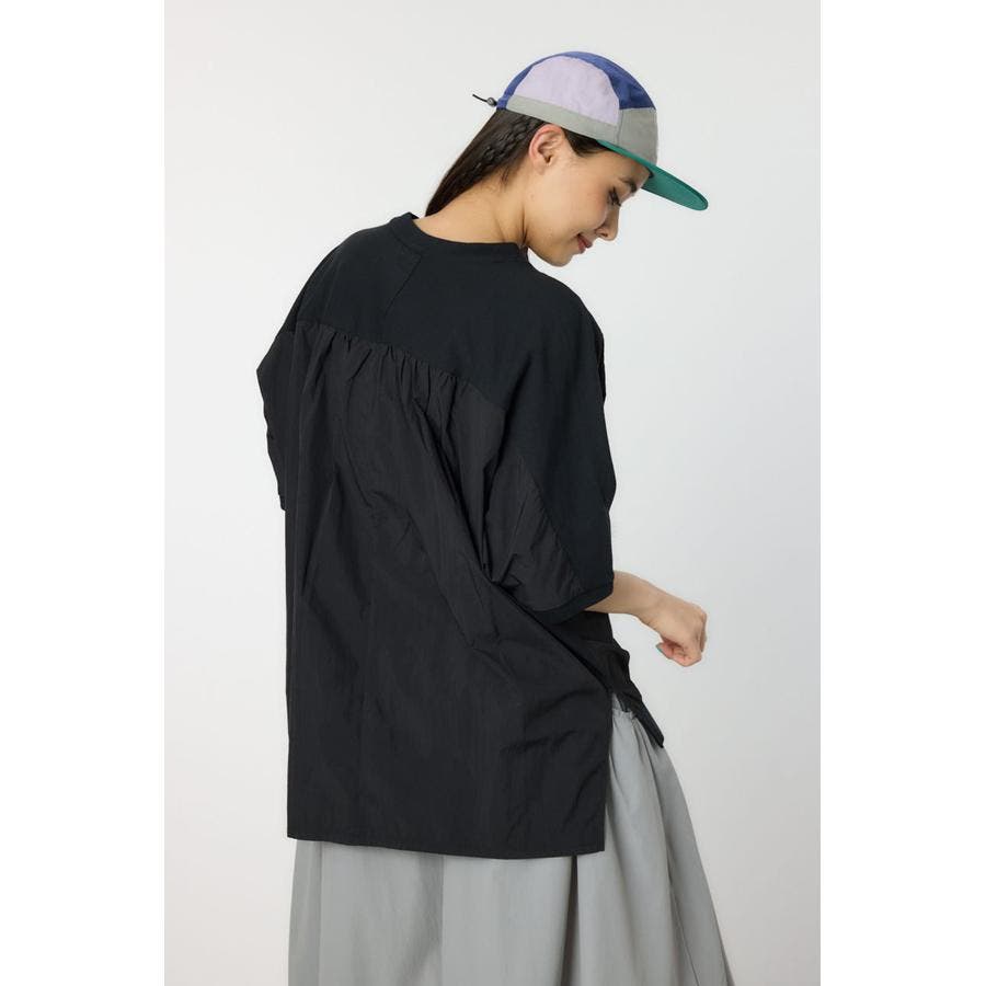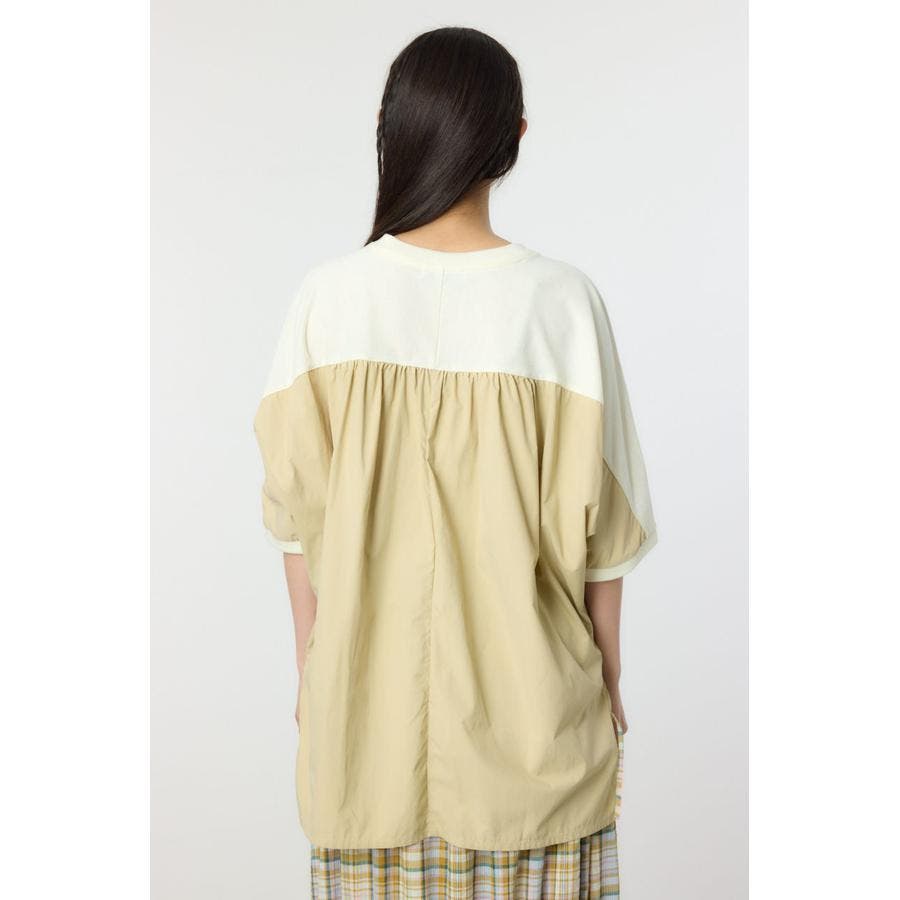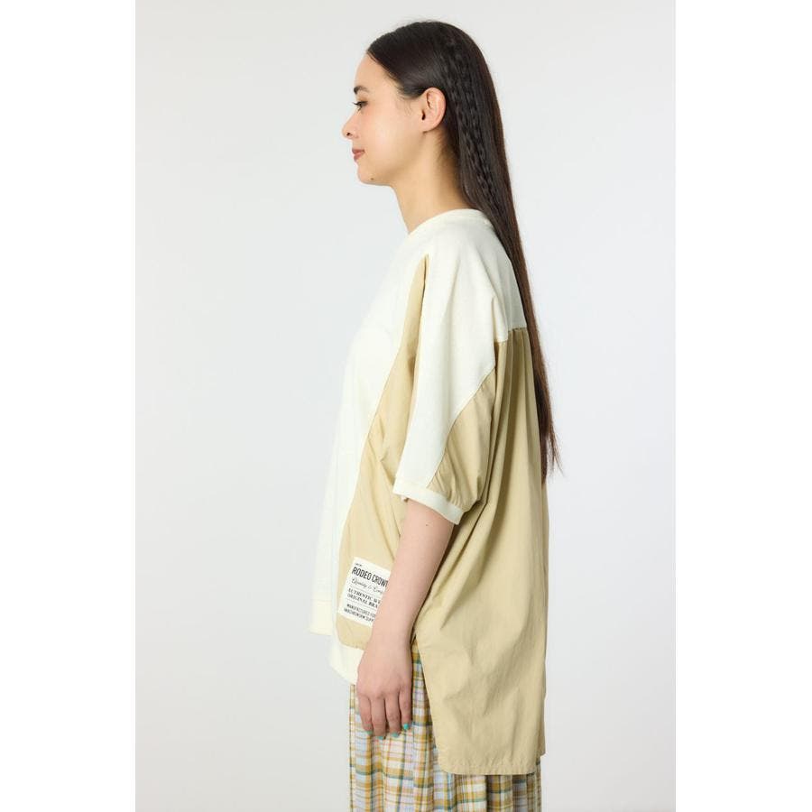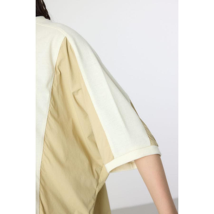 フロントはカットソー素材、脇と後ろ側は布帛素材で切り替えているトップス。