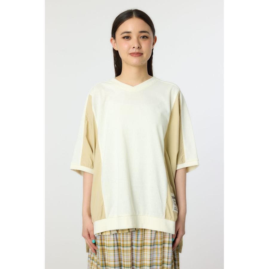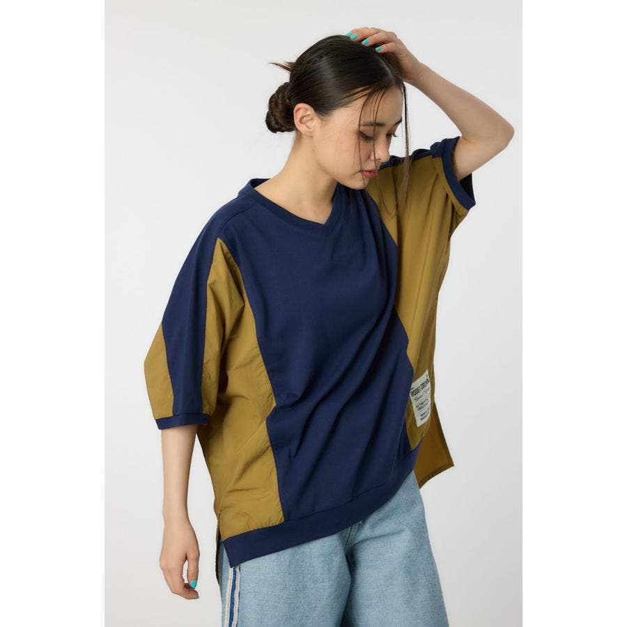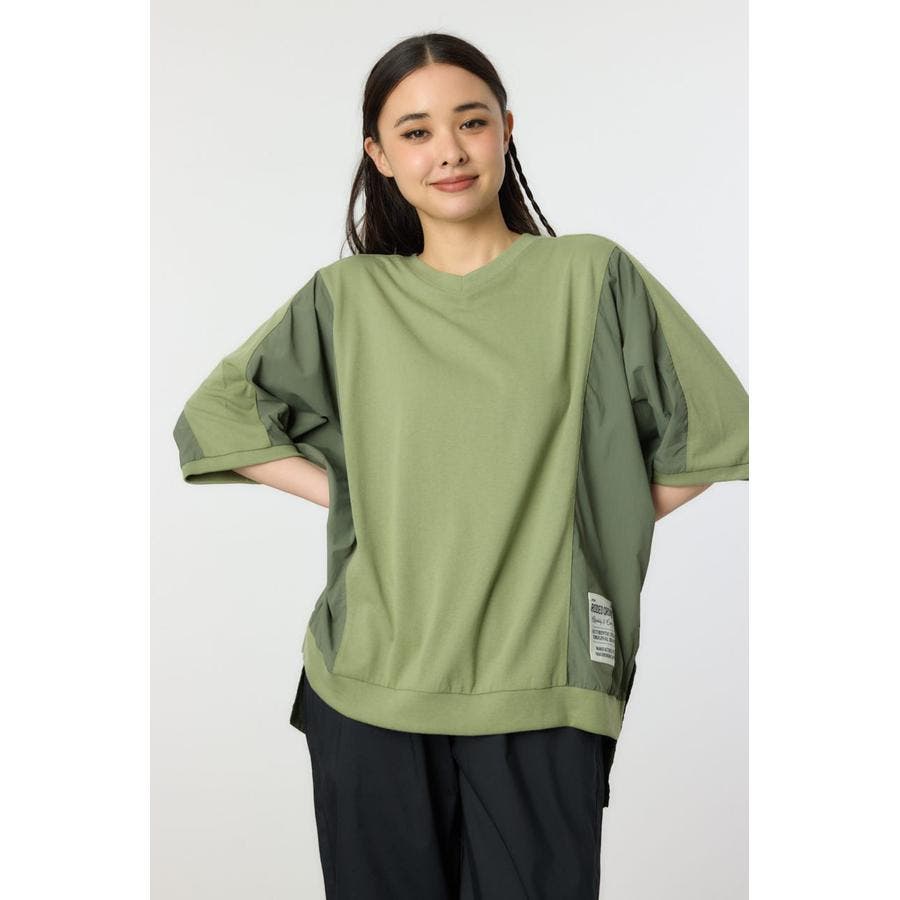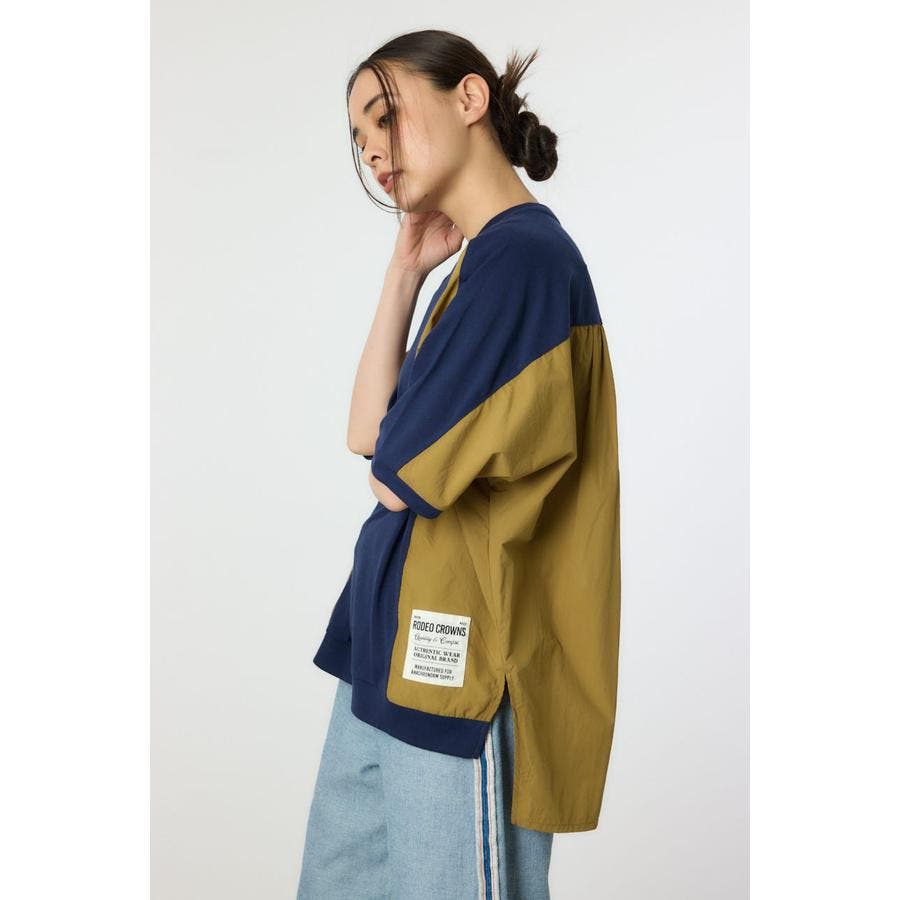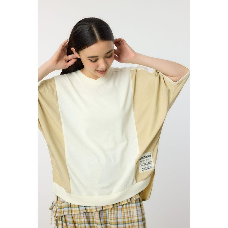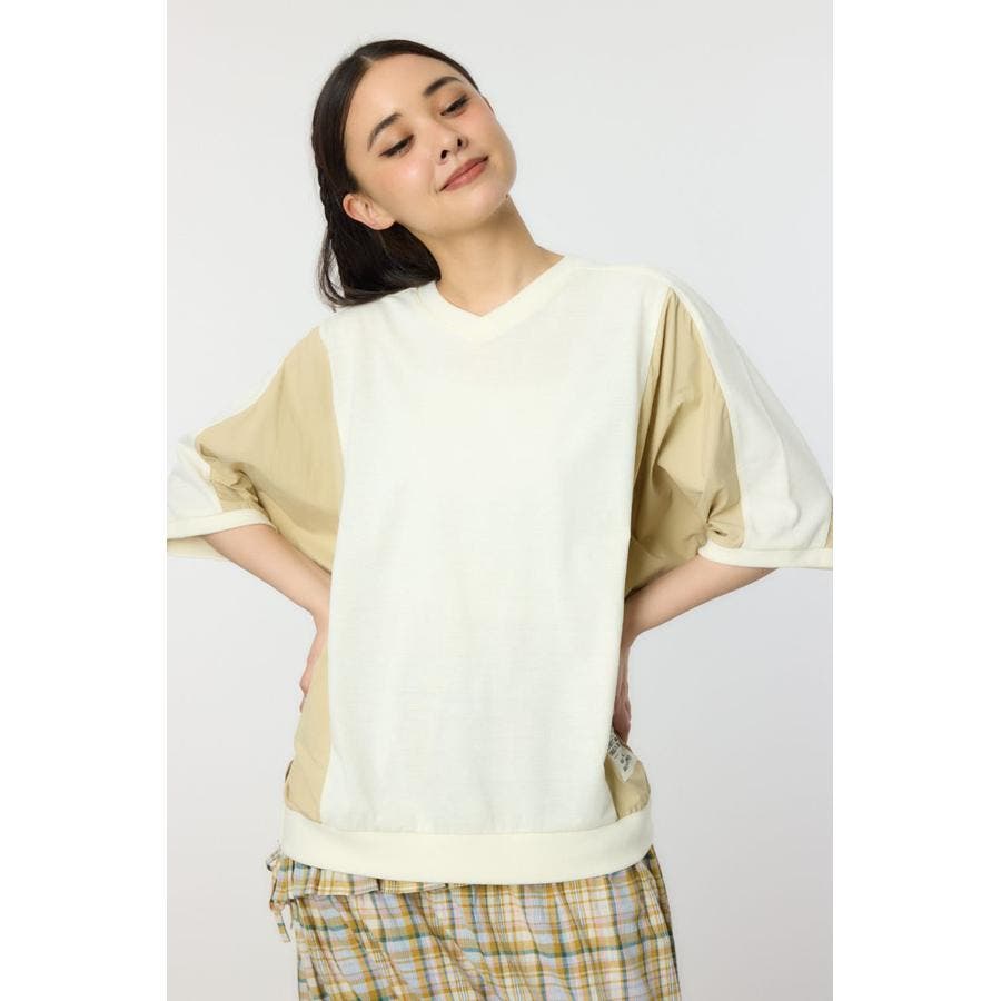 フロントはカットソー素材、脇と後ろ側は布帛素材で切り替えているトップス。