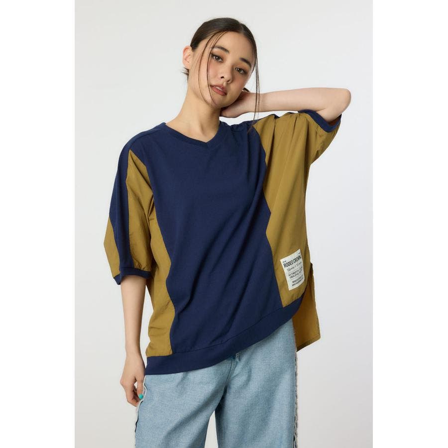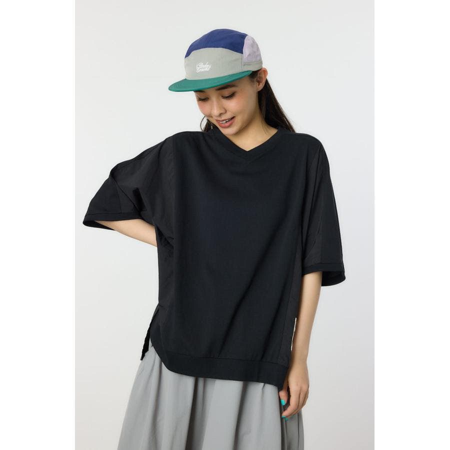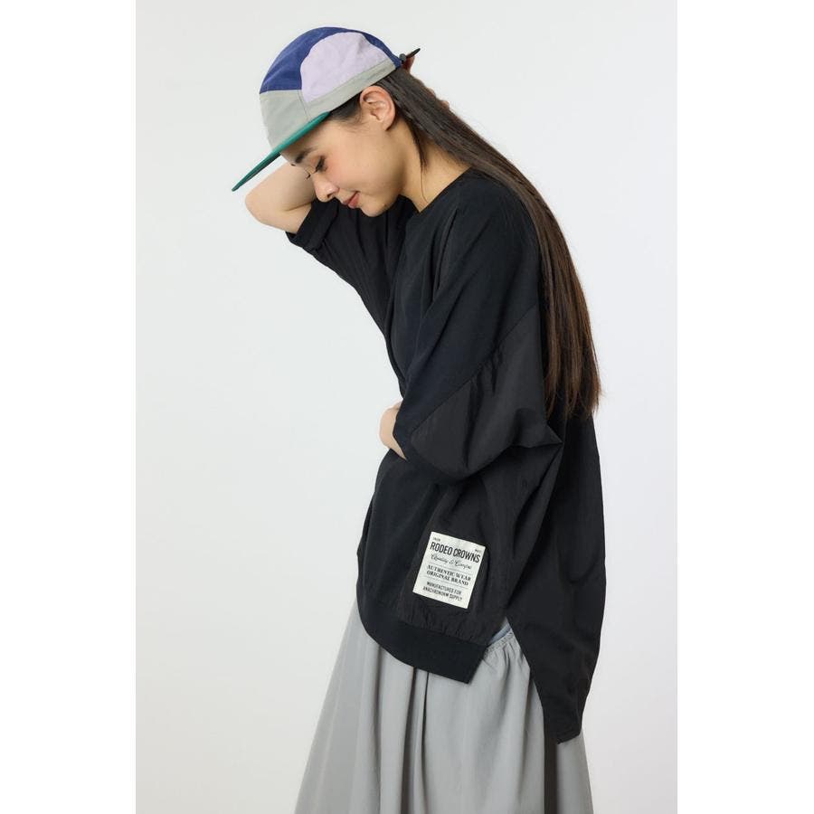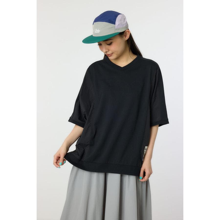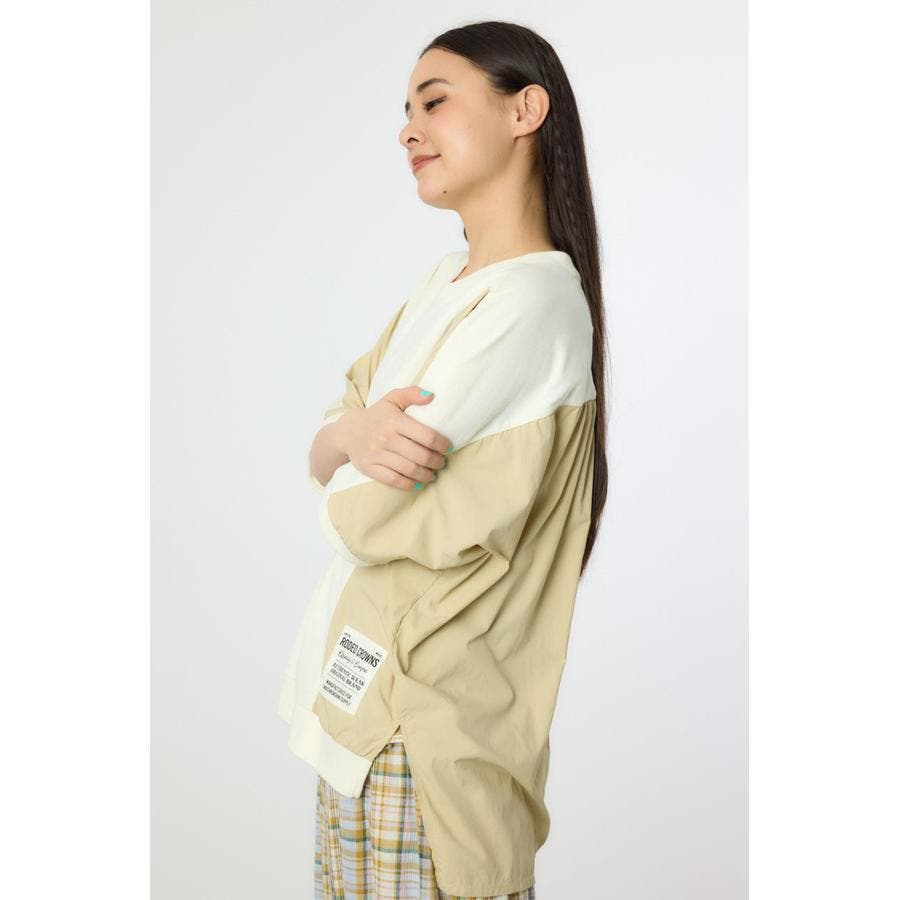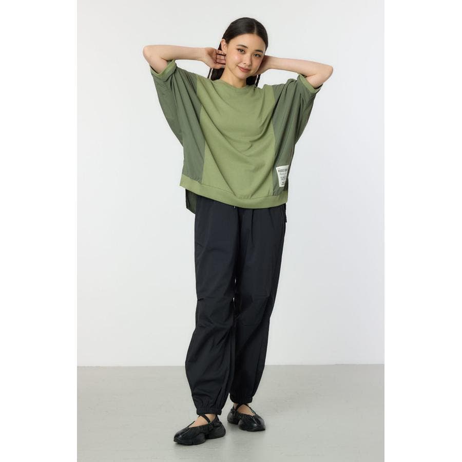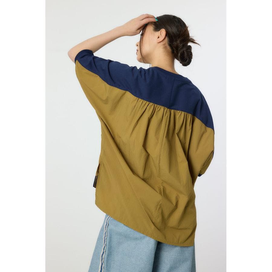 フロントはカットソー素材、脇と後ろ側は布帛素材で切り替えているトップス。