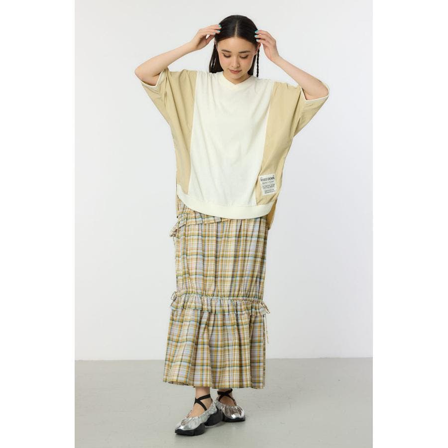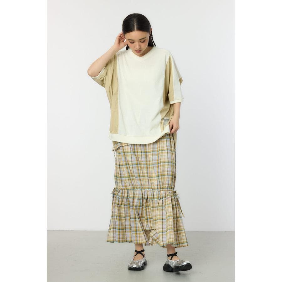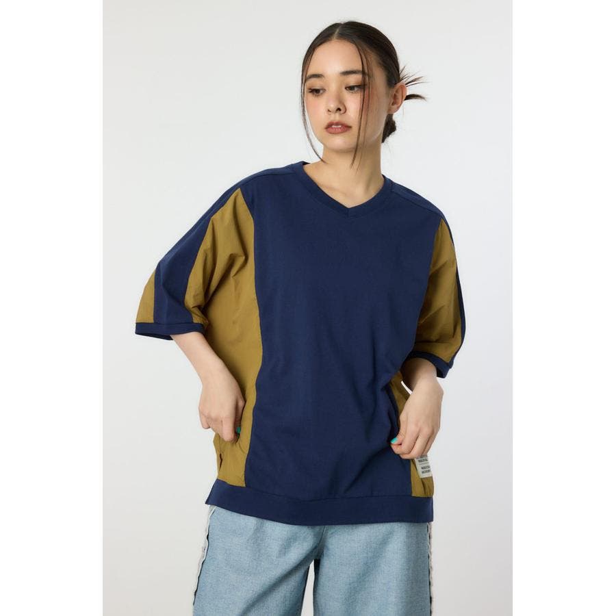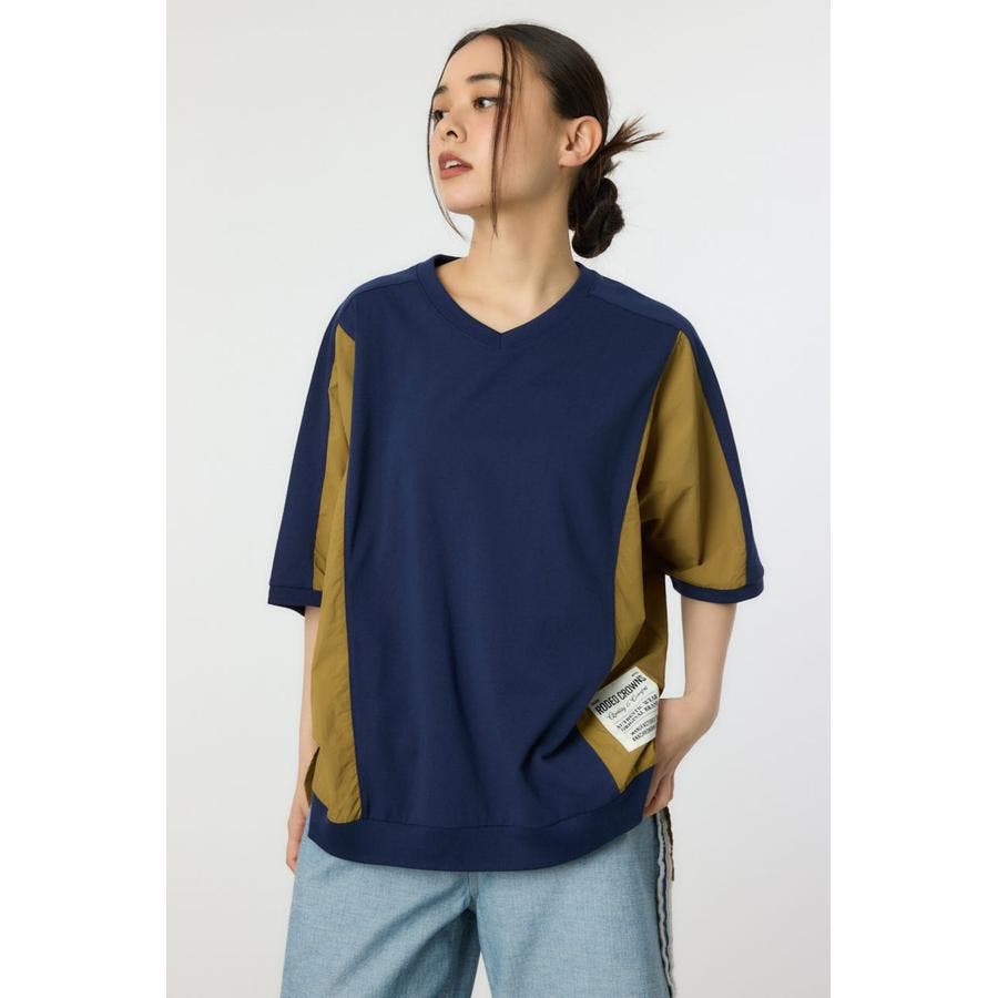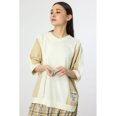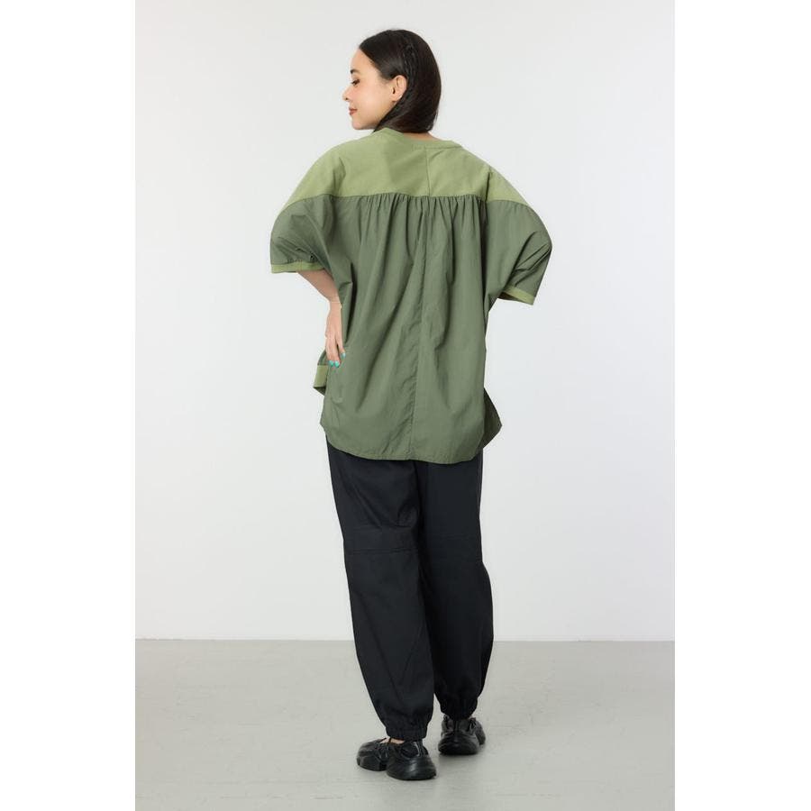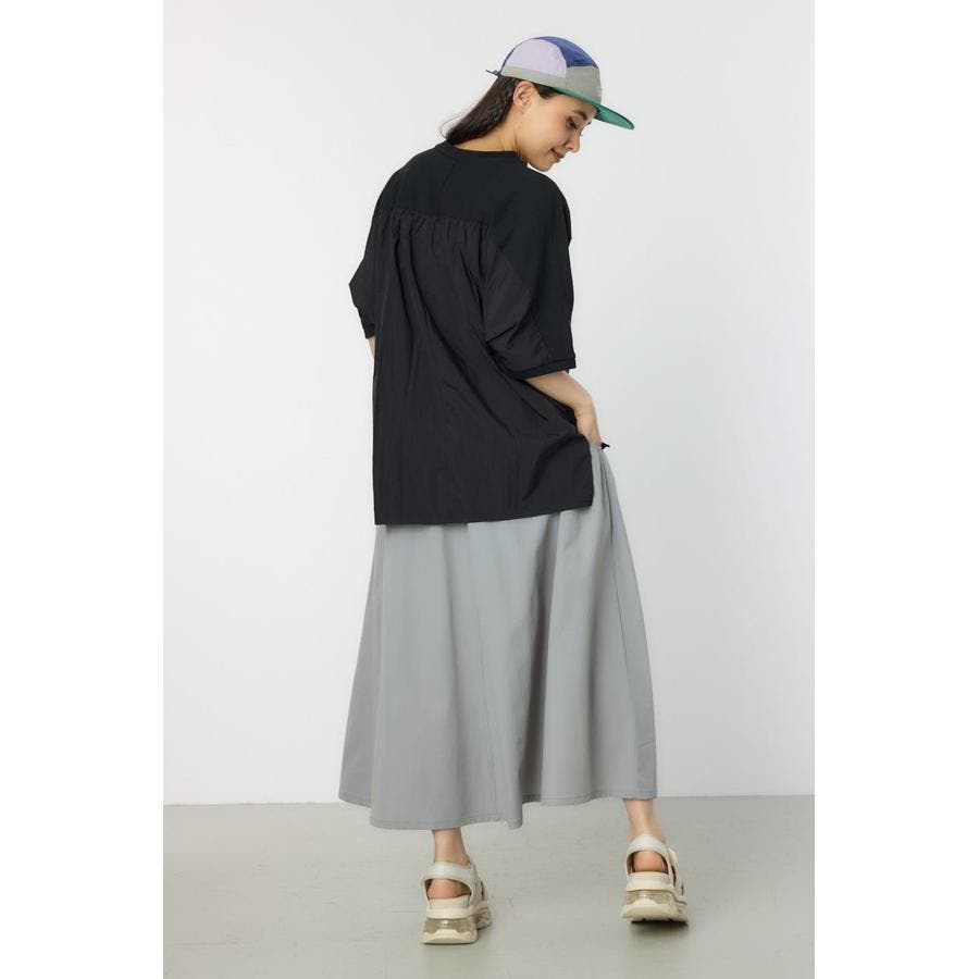 フロントはカットソー素材、脇と後ろ側は布帛素材で切り替えているトップス。