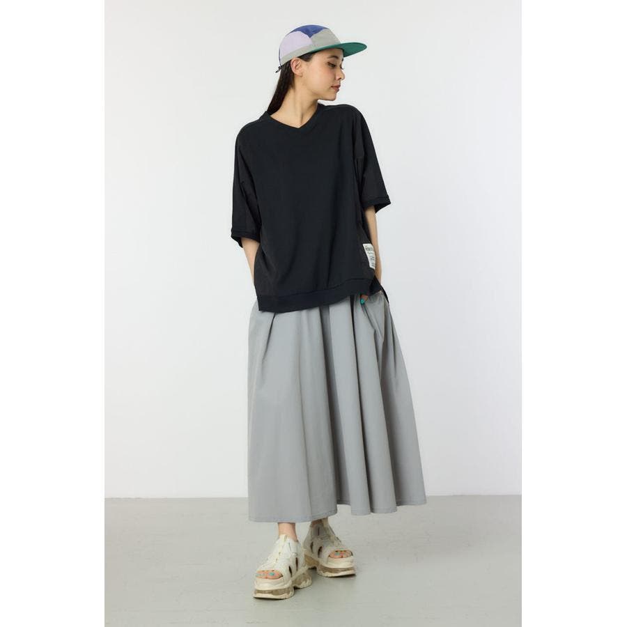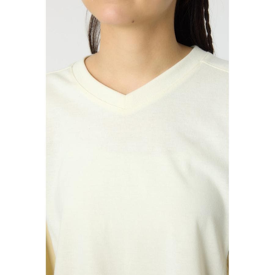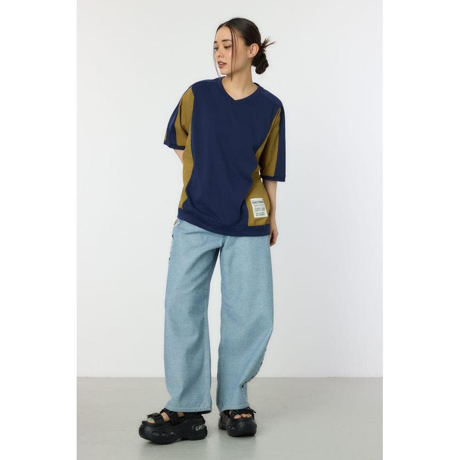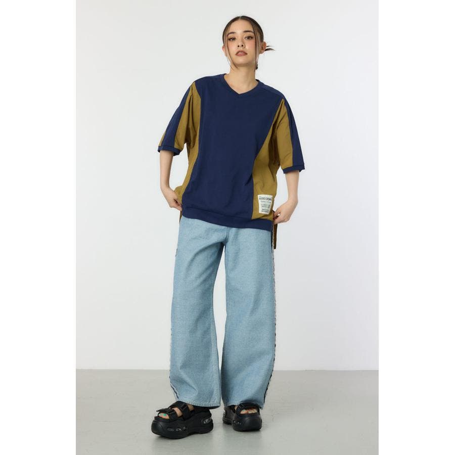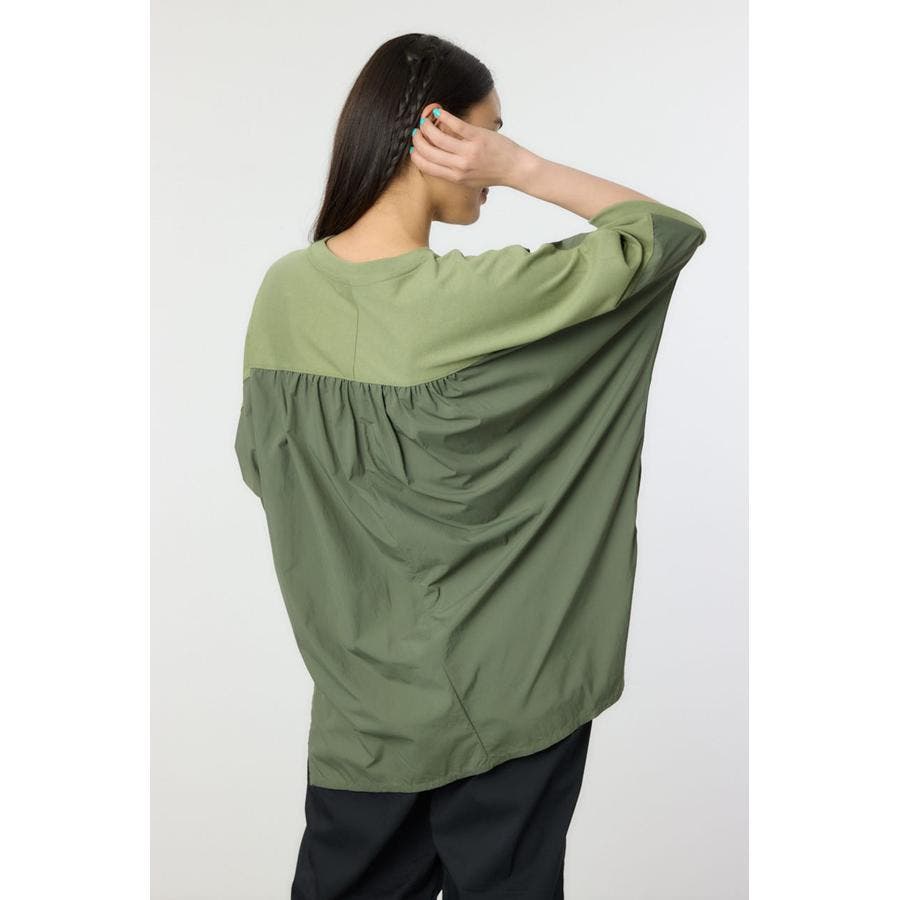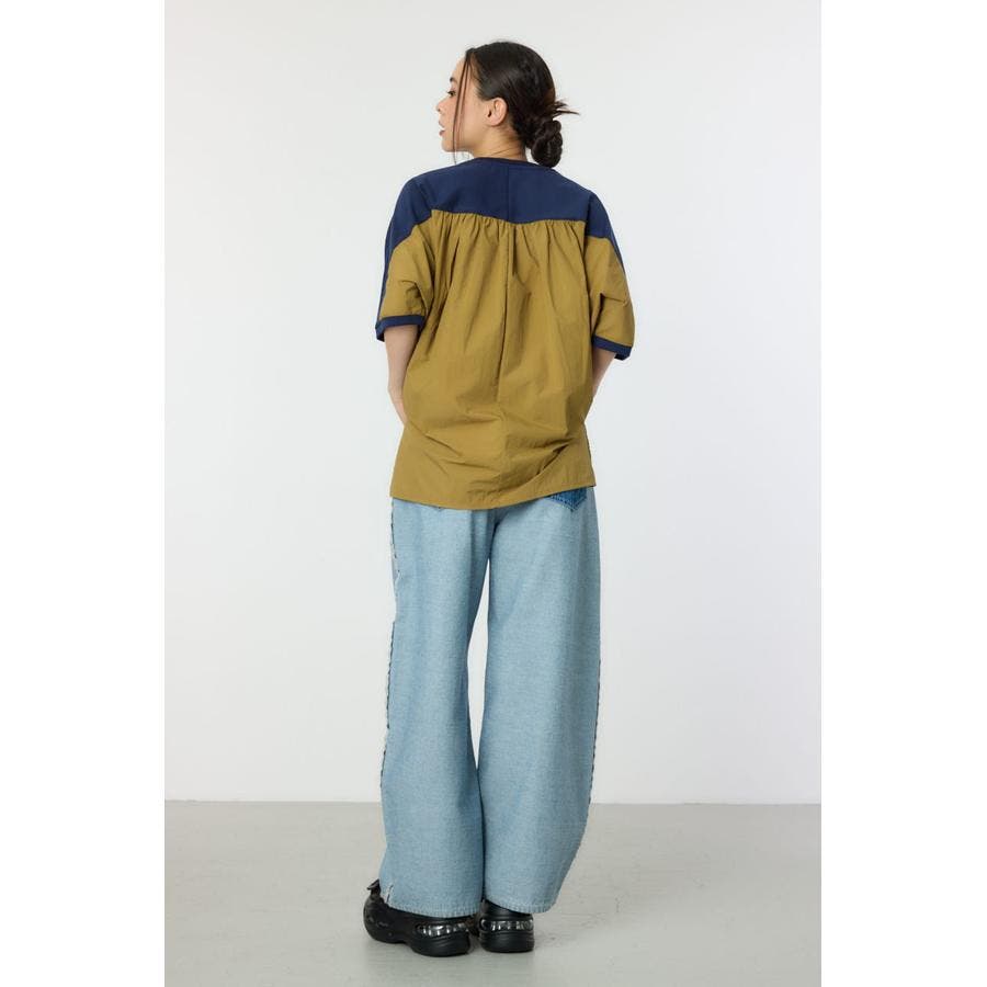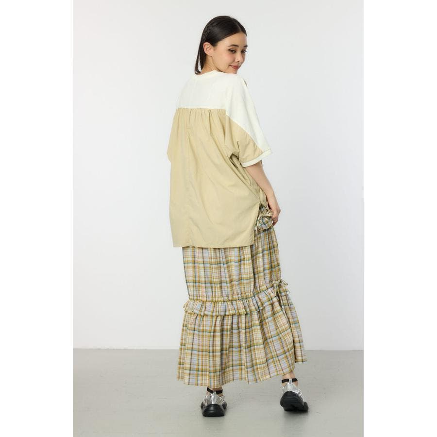 フロントはカットソー素材、脇と後ろ側は布帛素材で切り替えているトップス。