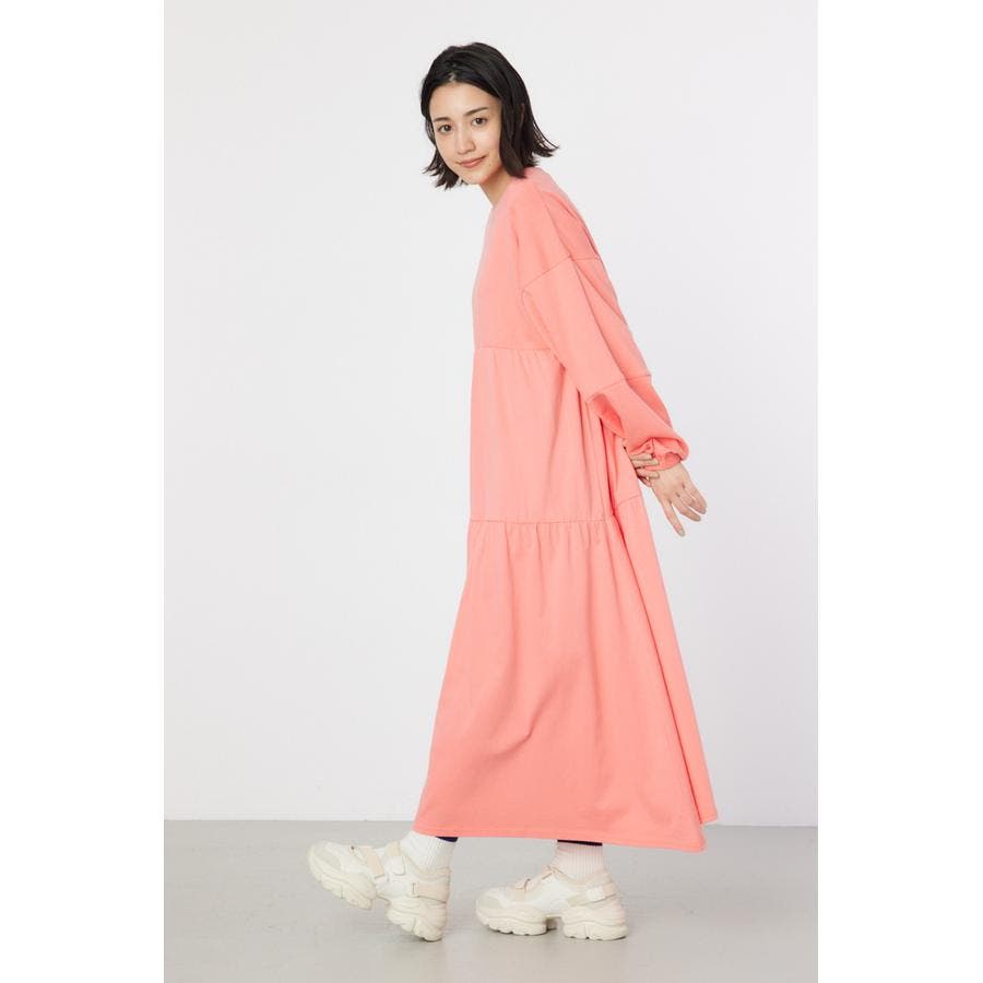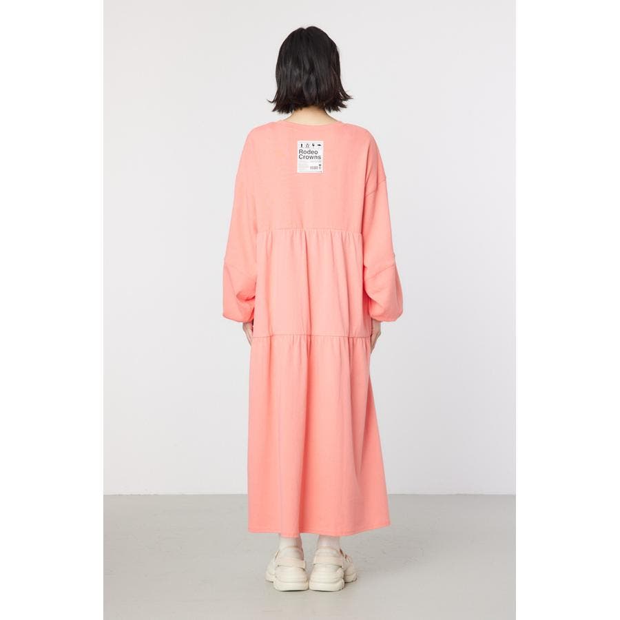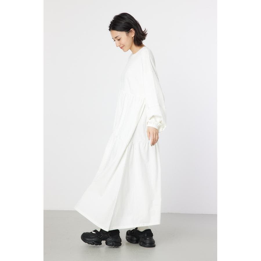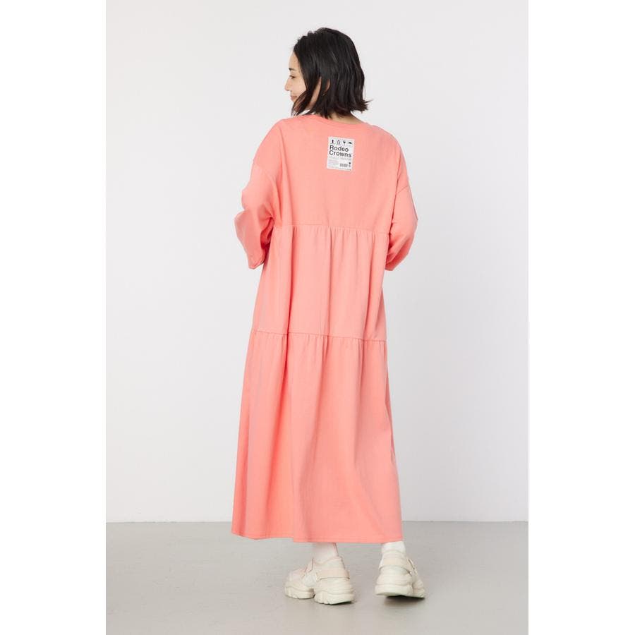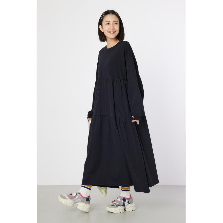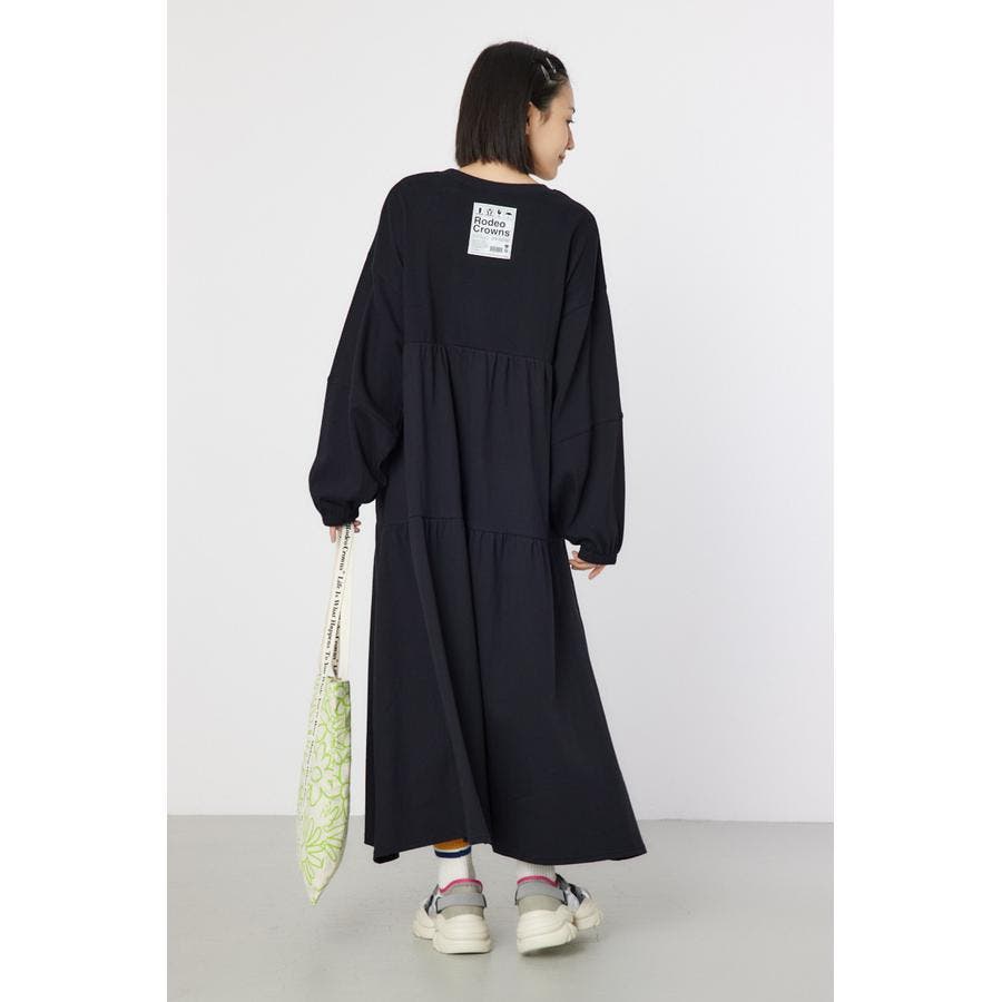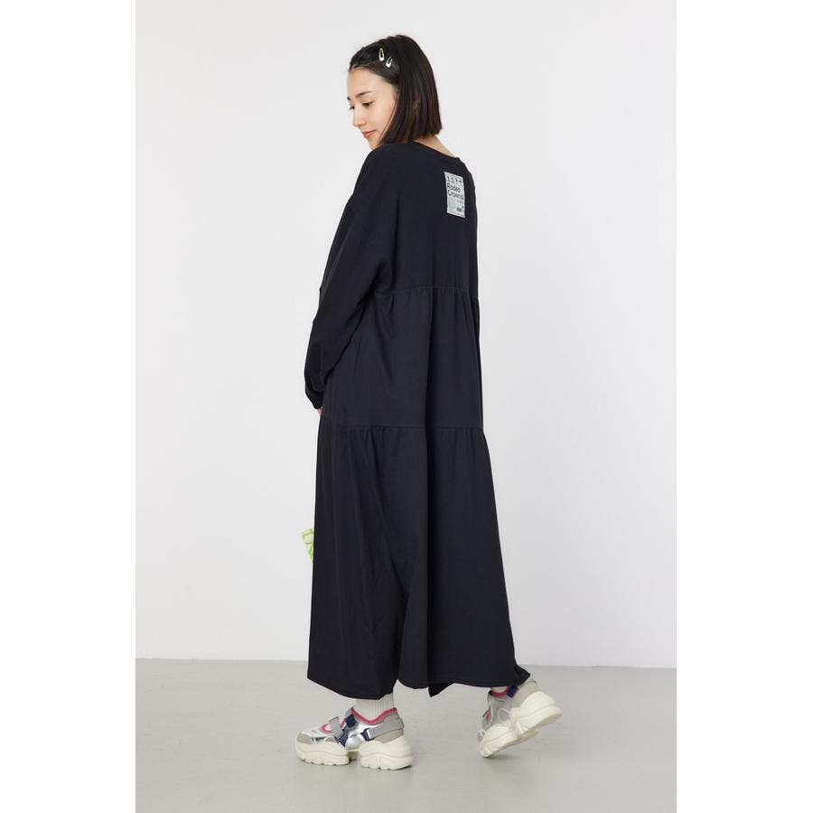 ボリュームたっぷりなティアードデザインが可愛いワンピース。ゆったりとしたシルエットでリラックスして着用できます。バックに付けたネームパッチがポイント。マキシ丈でボディラインを適度に隠してくれるので、体型カバーもできる優秀アイテムです。
