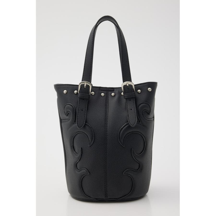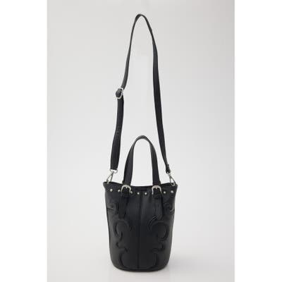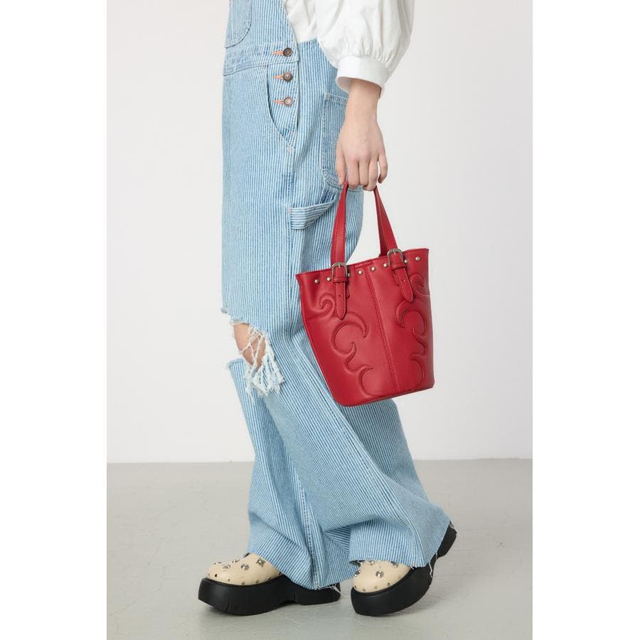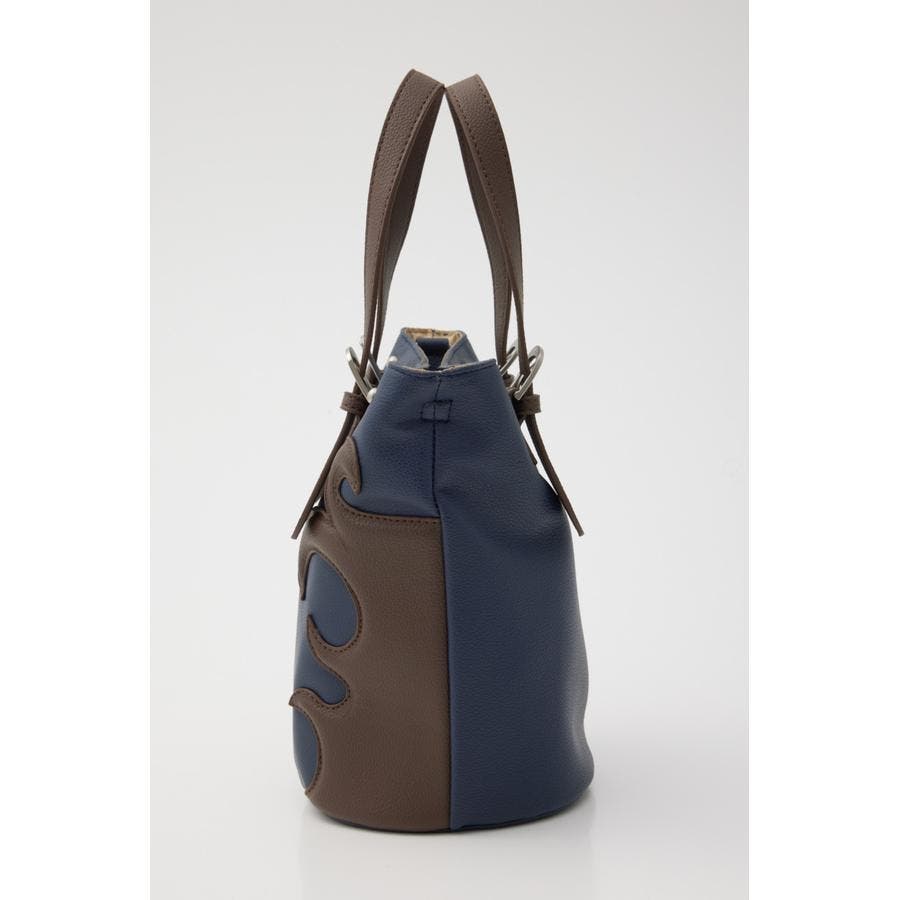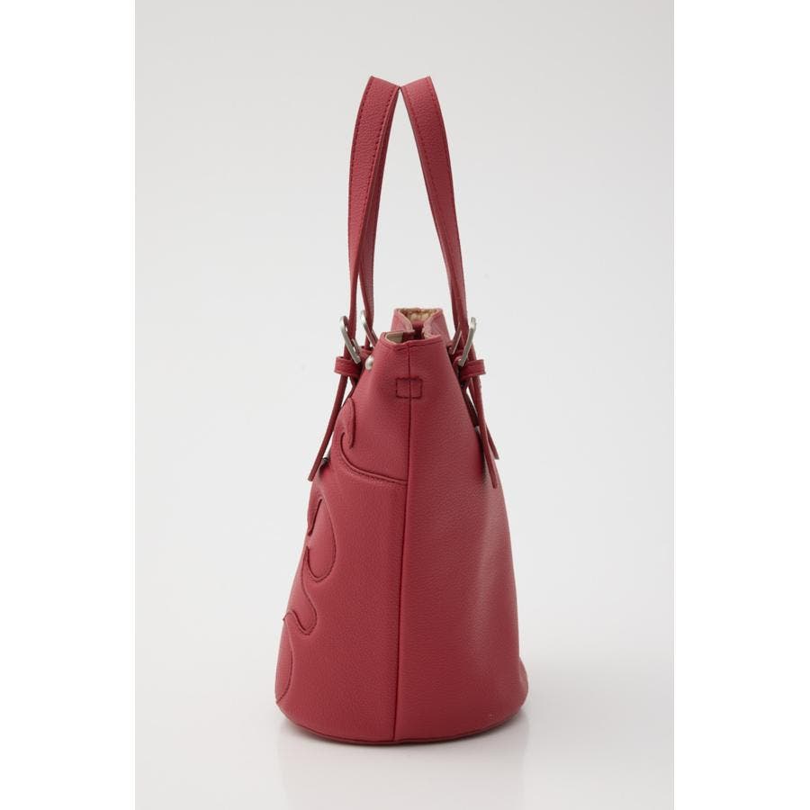 インパクトのあるファイヤーモチーフとスタッズが施されたバケツ型のショルダーバッグ。