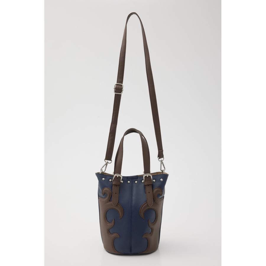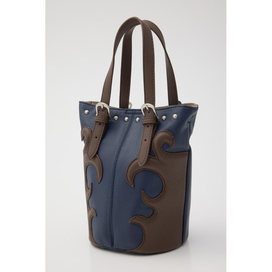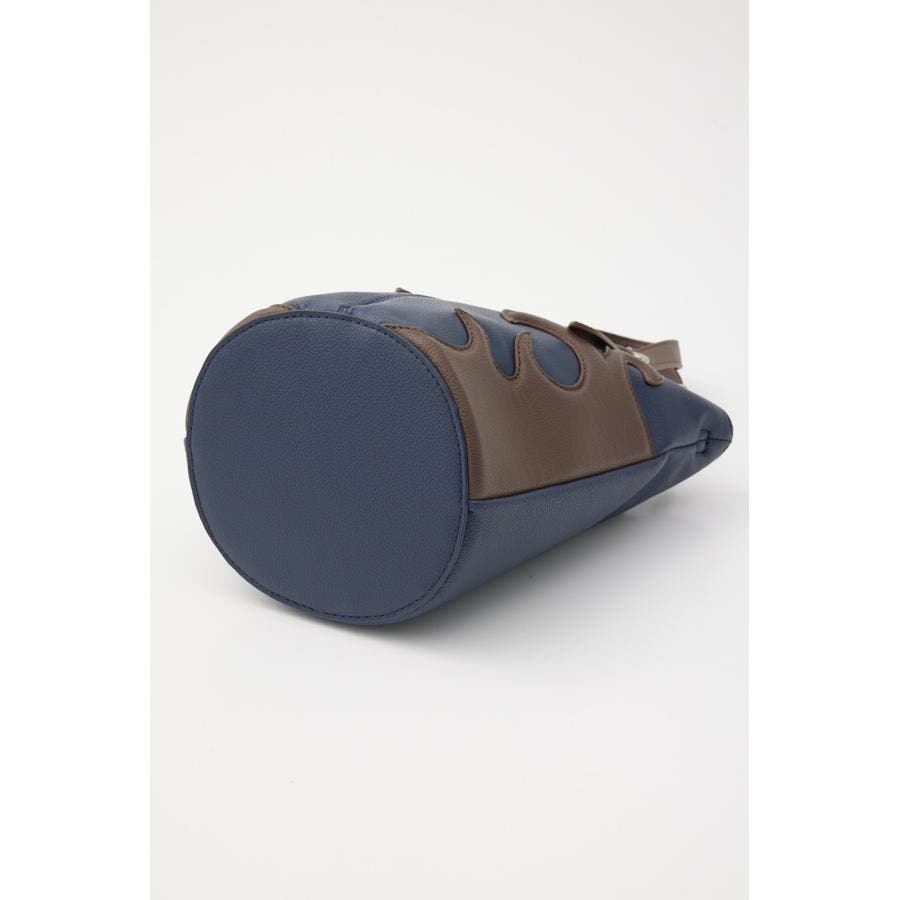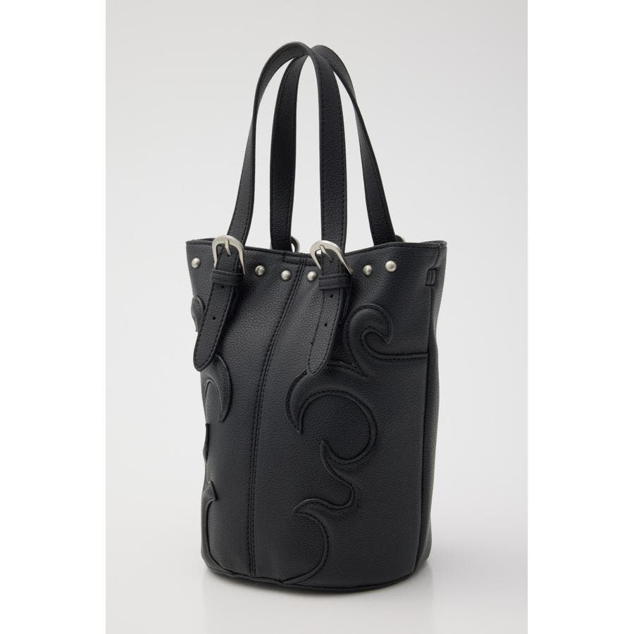 インパクトのあるファイヤーモチーフとスタッズが施されたバケツ型のショルダーバッグ。
