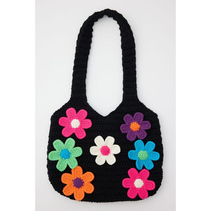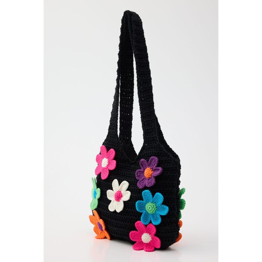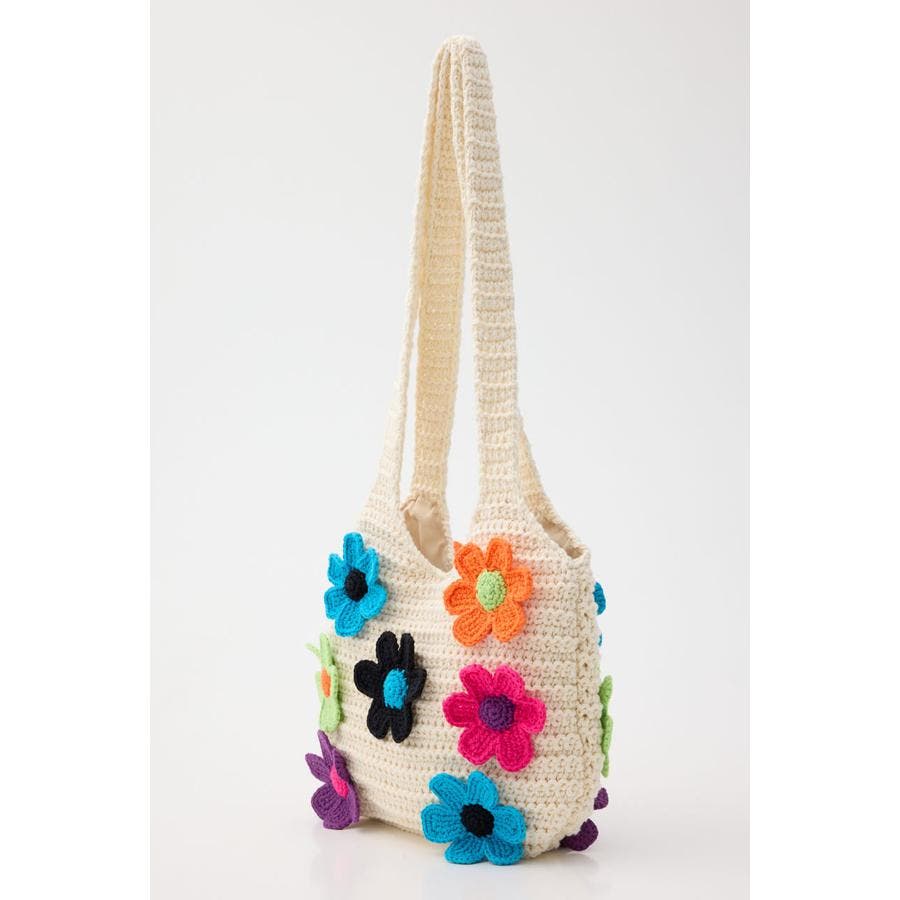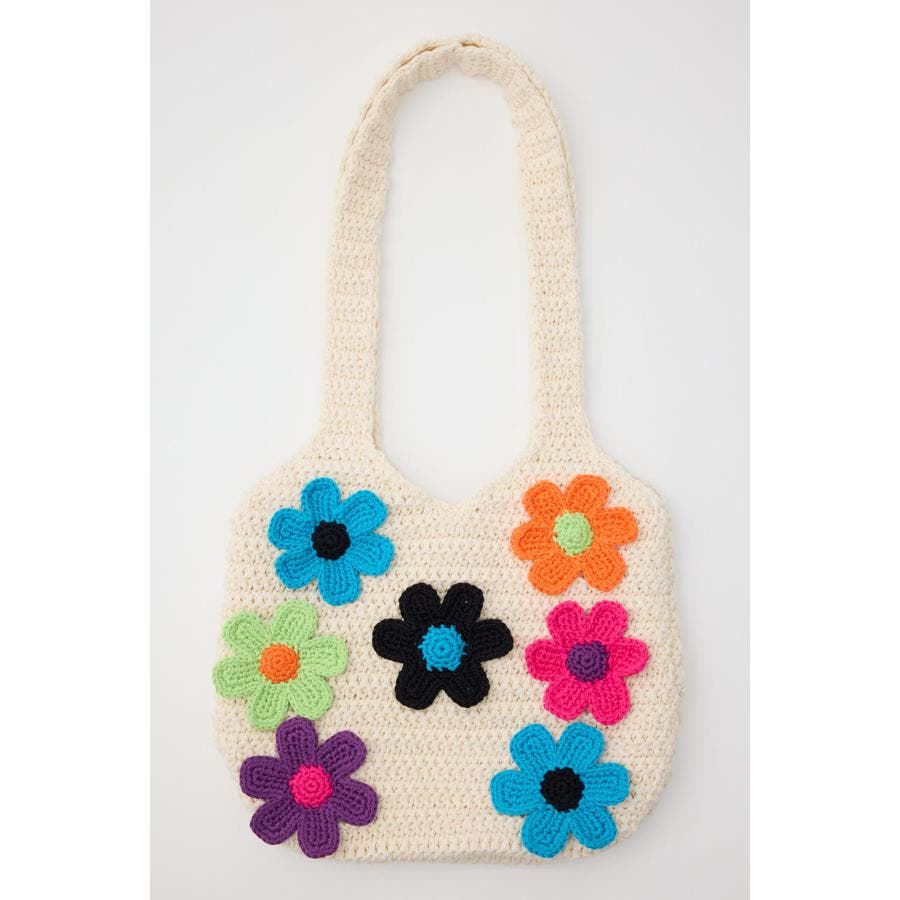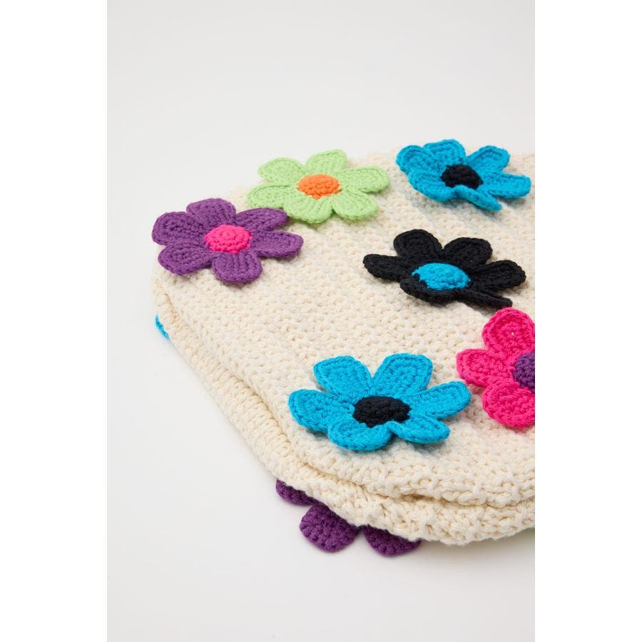 ビビットカラーのフラワーモチーフを、ふんだんにデザインしたニットバッグ。