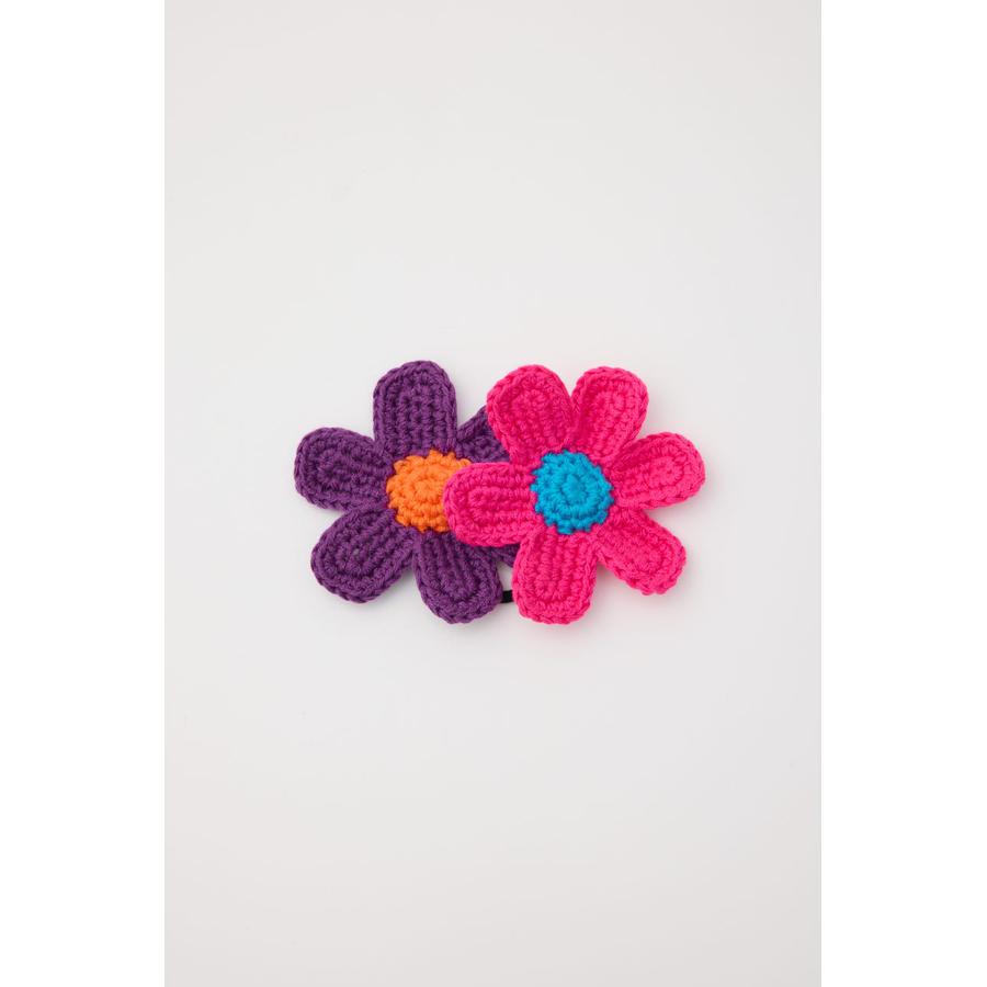 カラー配色のフラワーモチーフが2個セットになったヘアゴムです。