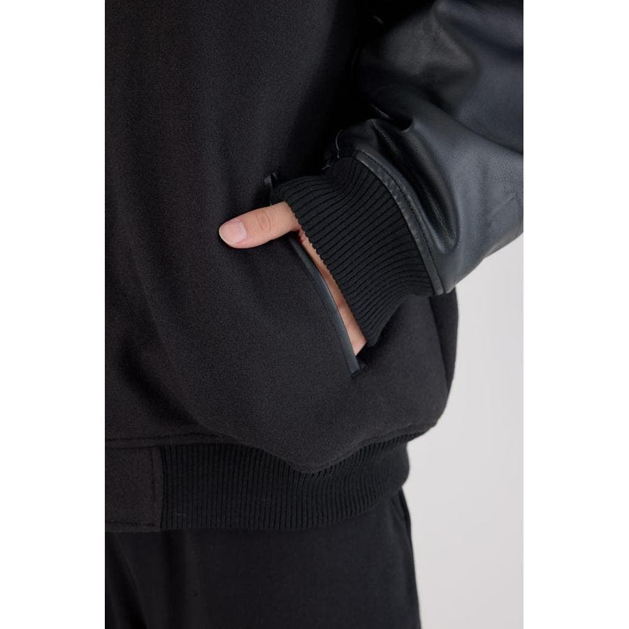 袖とアップリケ部分に使用されているフェイクレザー素材は、シボ感のあるマットな質感で、高級感を演出しています。