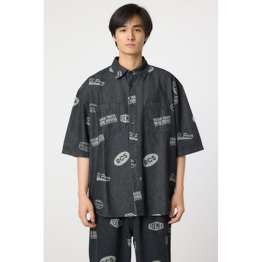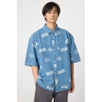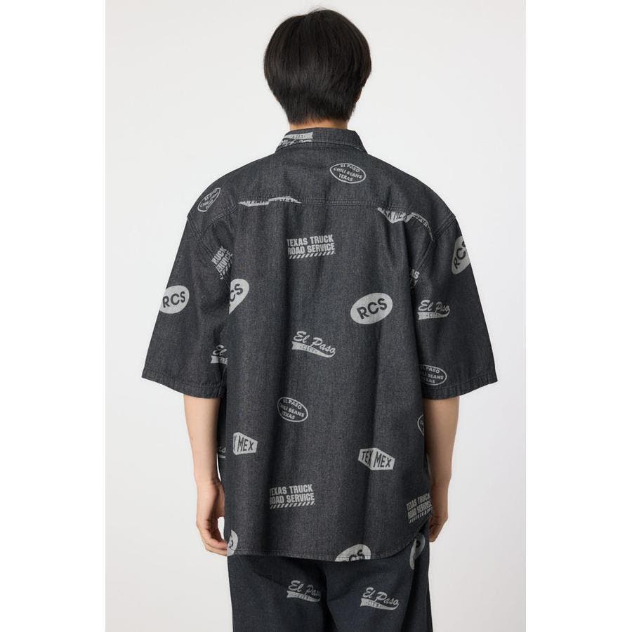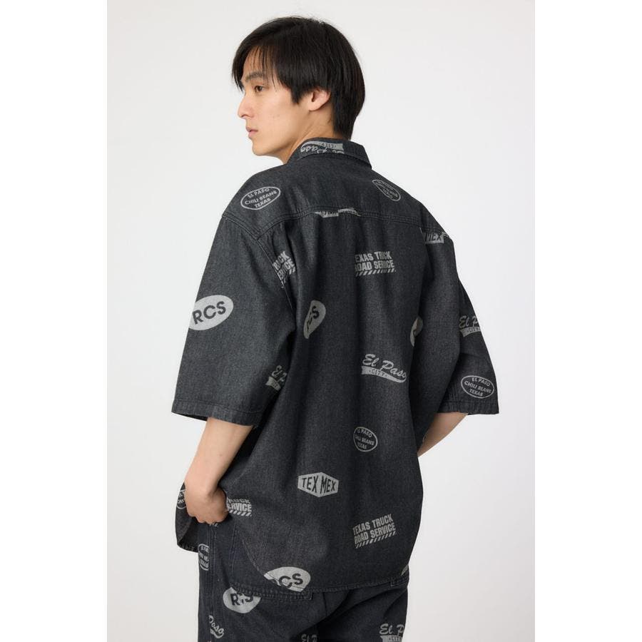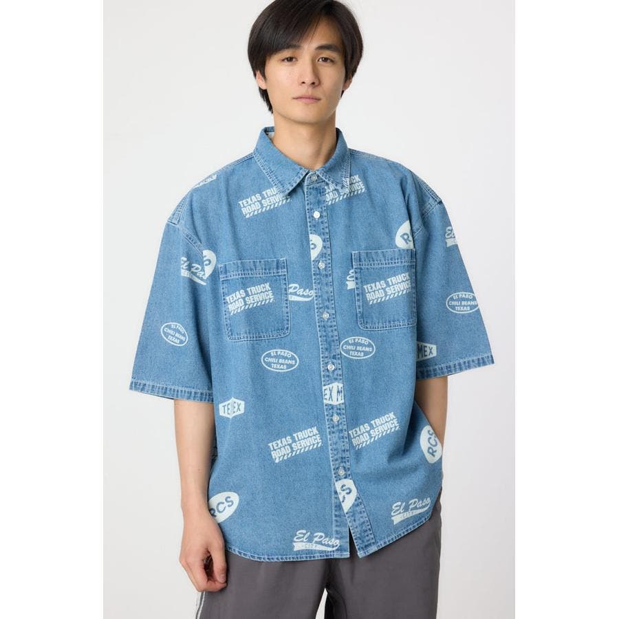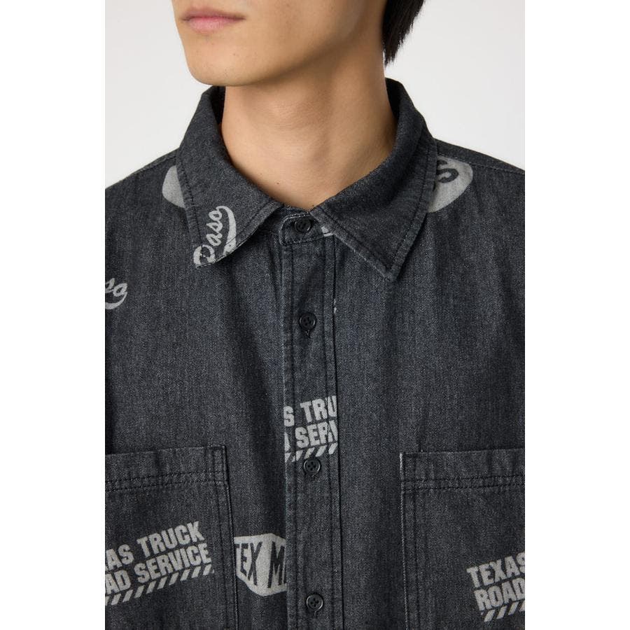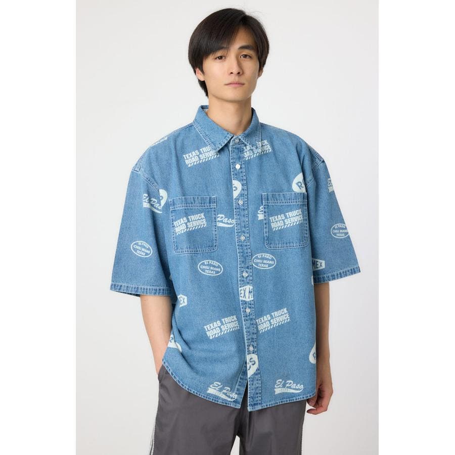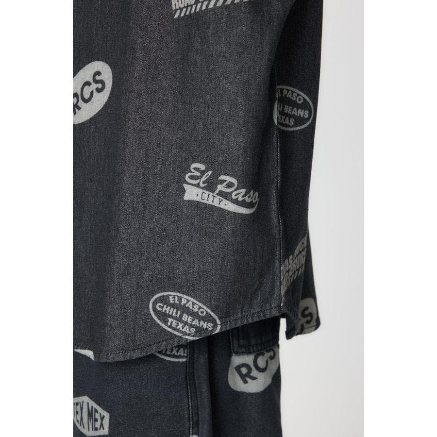 スタンプ調の総柄に抜染されたデザインが特徴的なデニムシャツ。