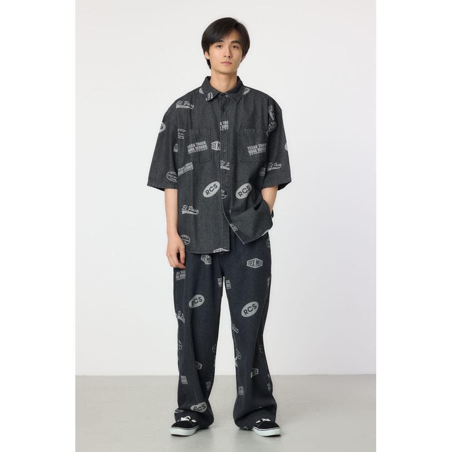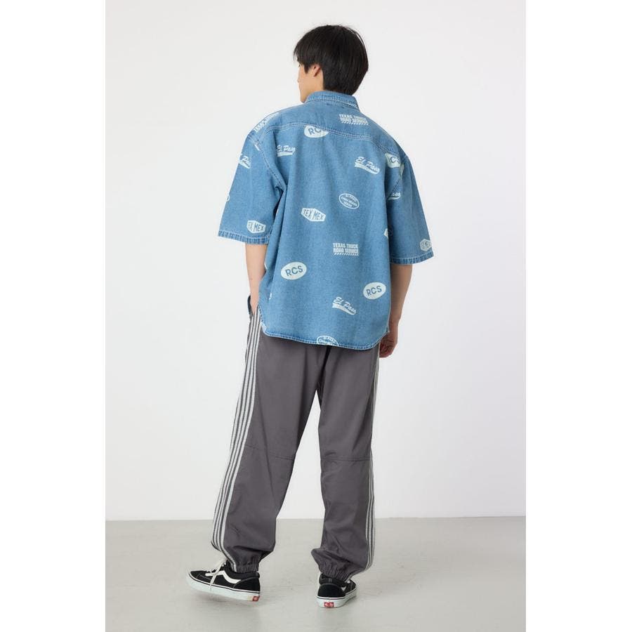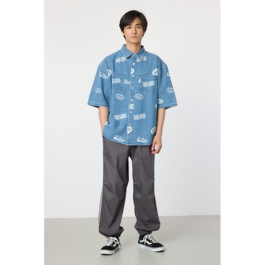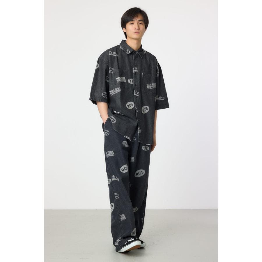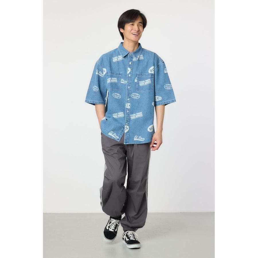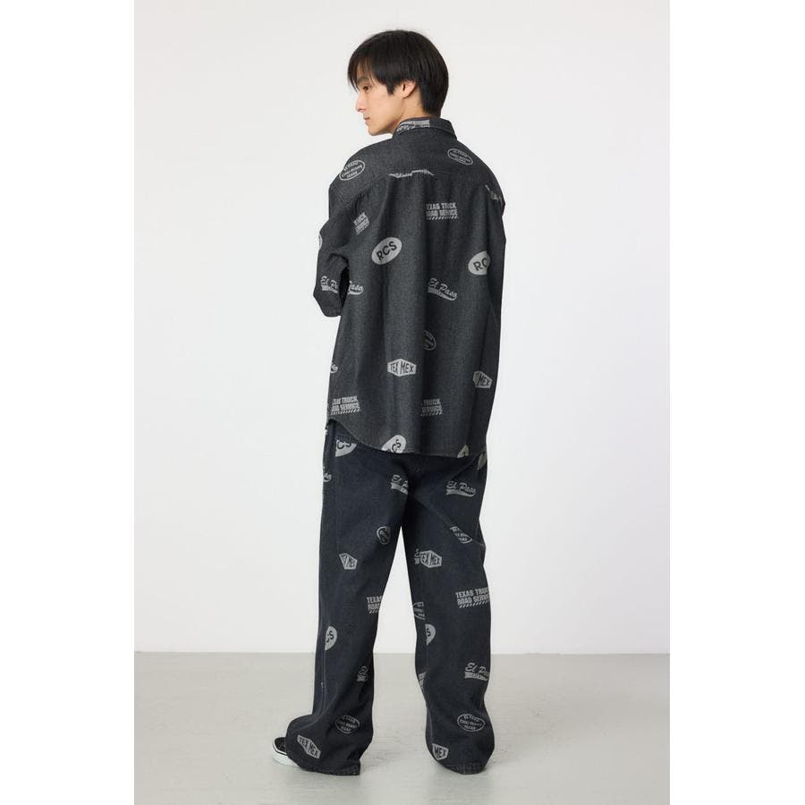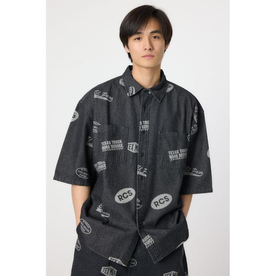 スタンプ調の総柄に抜染されたデザインが特徴的なデニムシャツ。