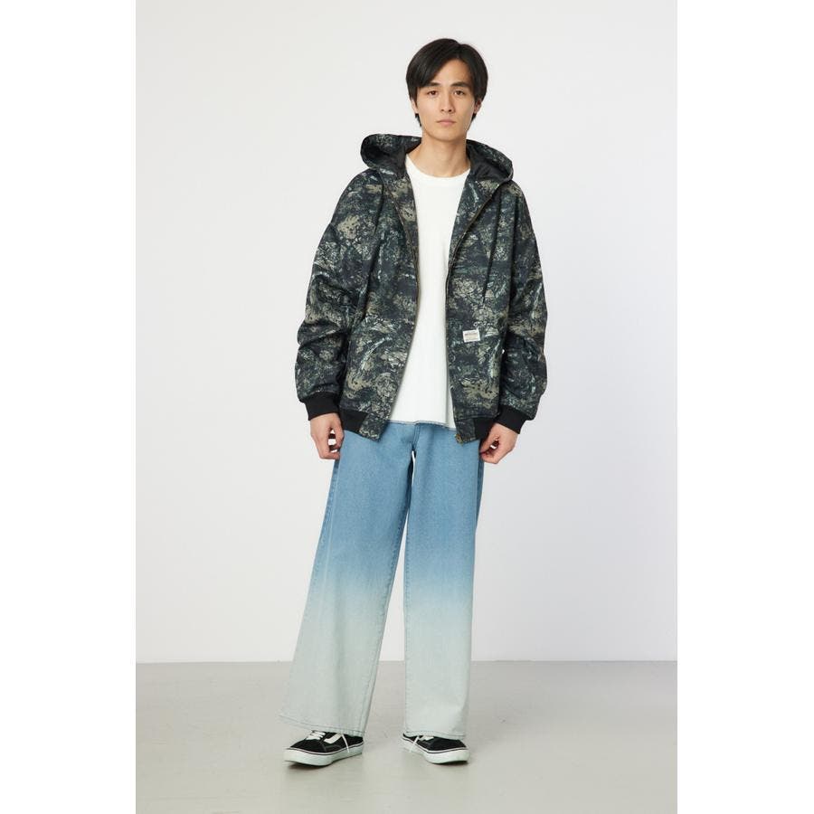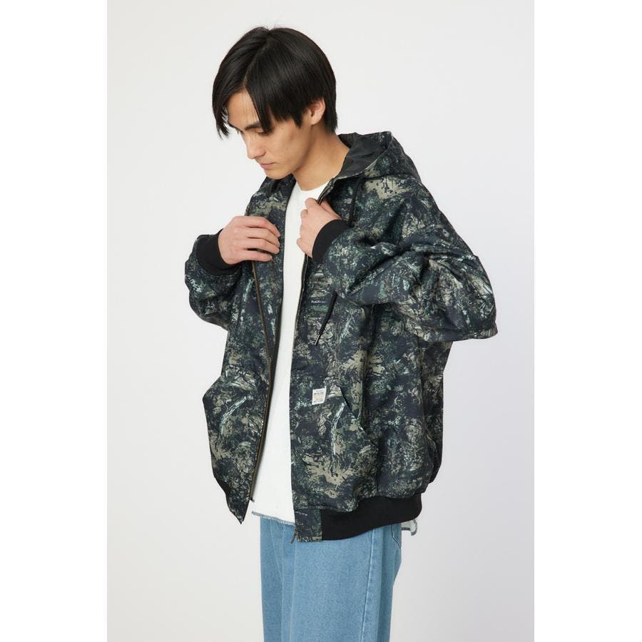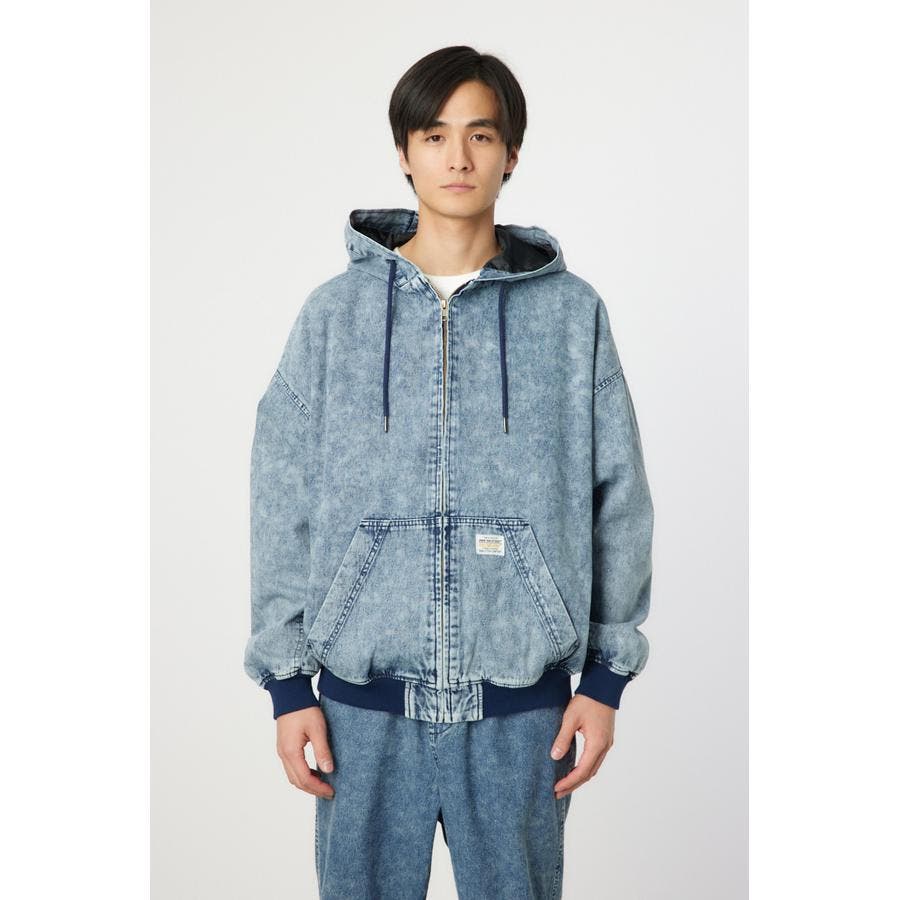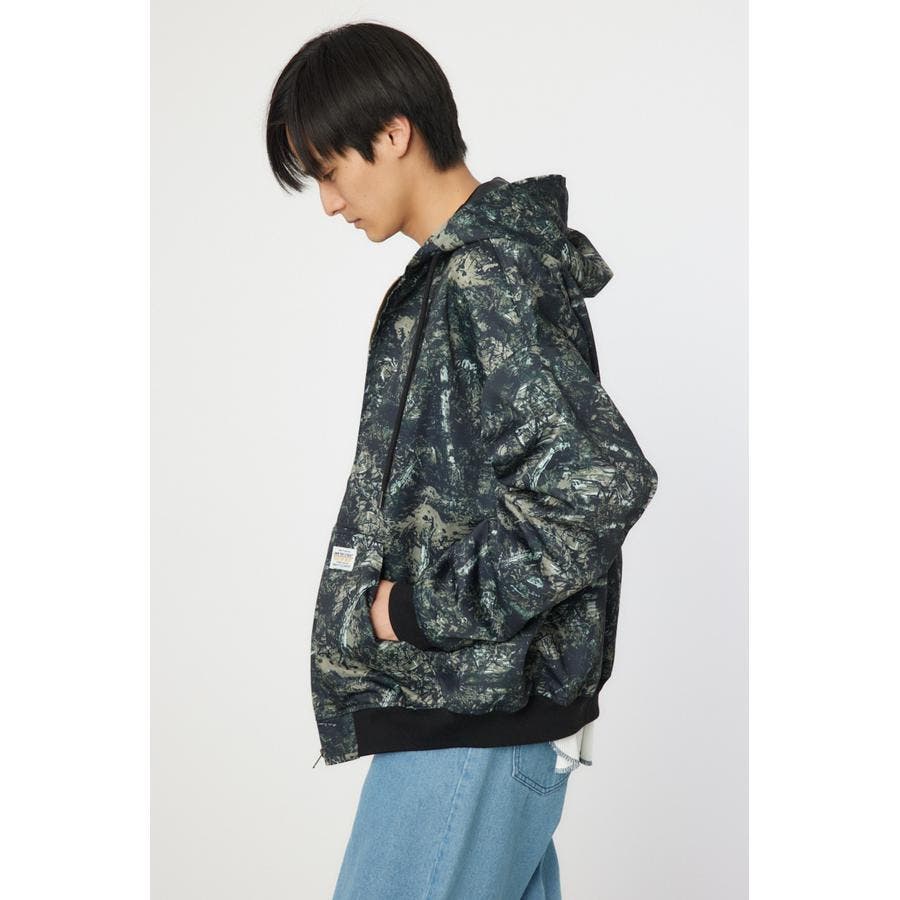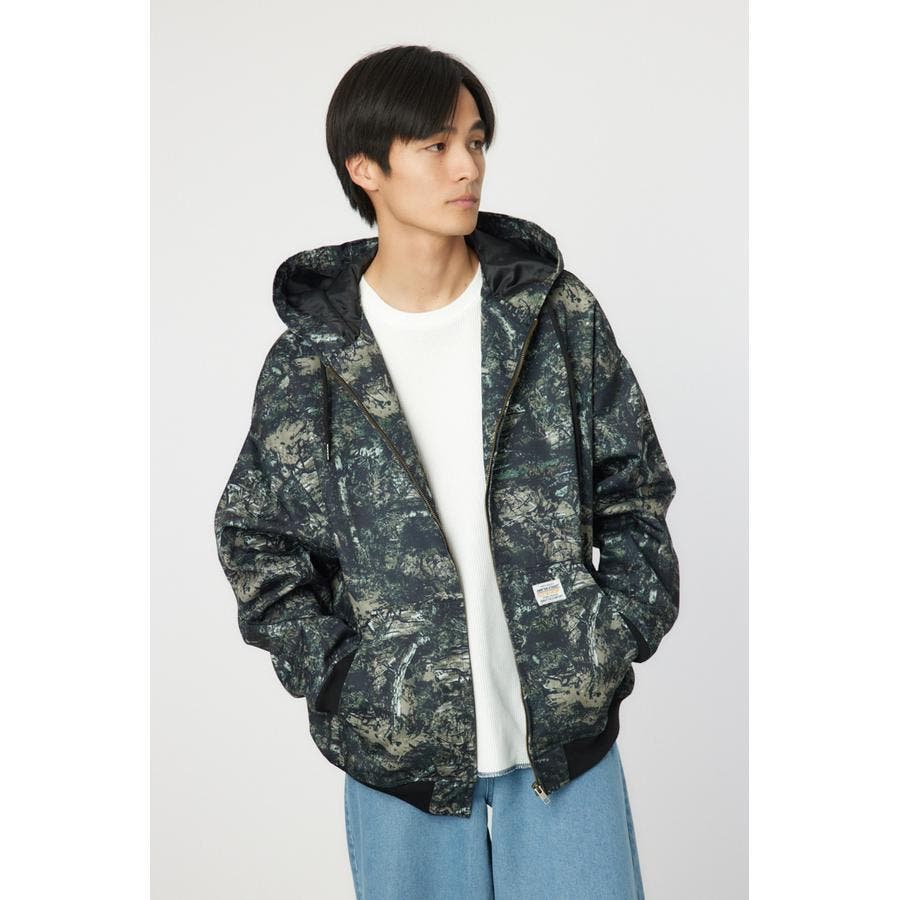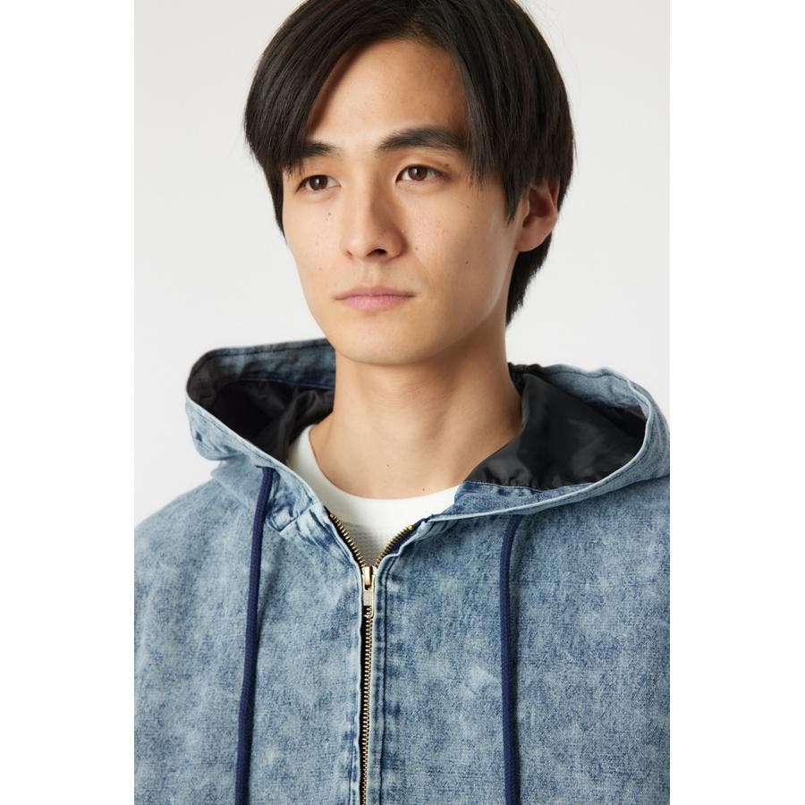 こなれ感のあるケミカル加工を施したデニム素材とリアルリーフ柄のZIPブルゾン。