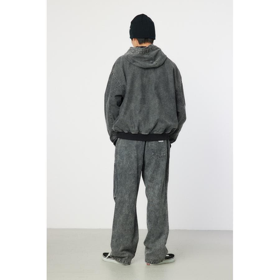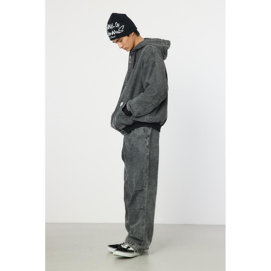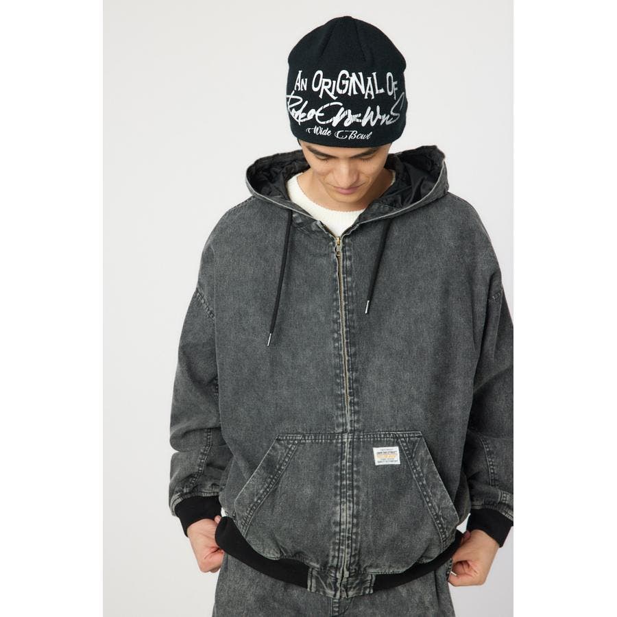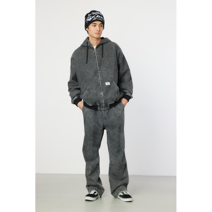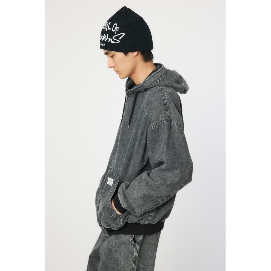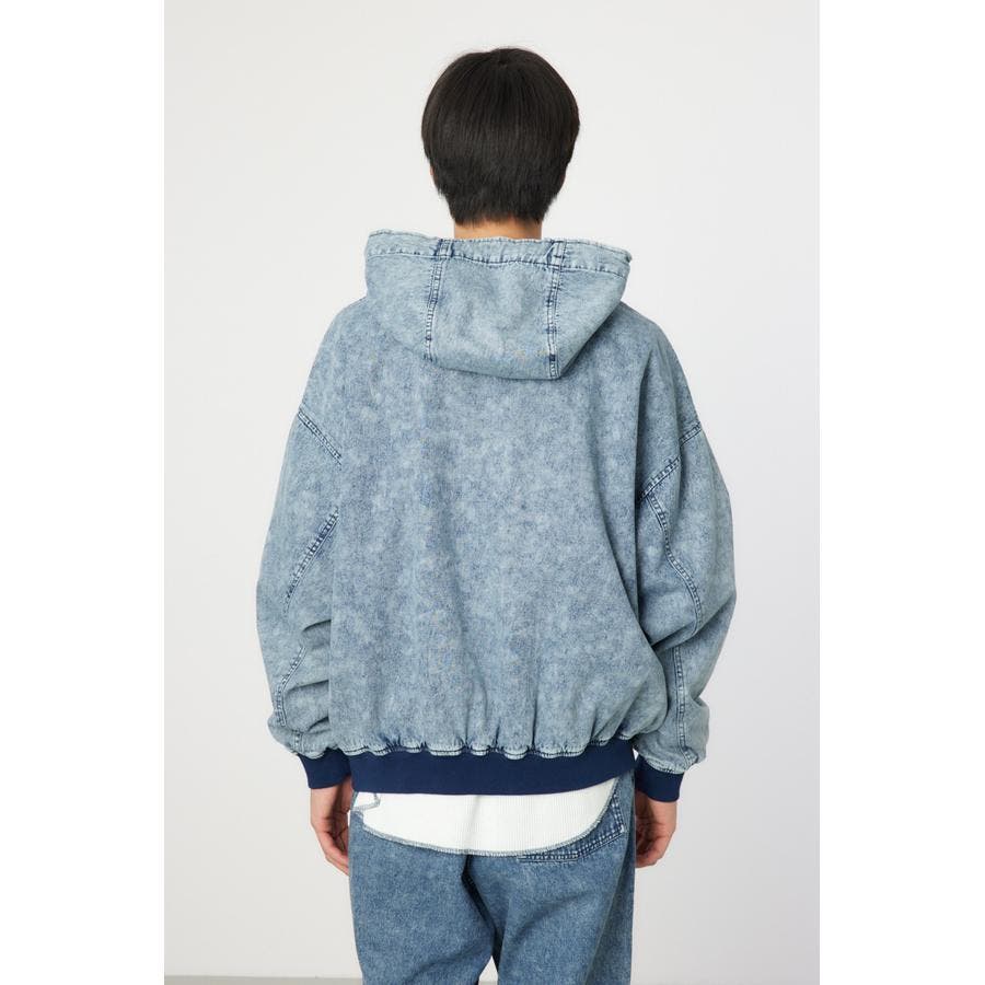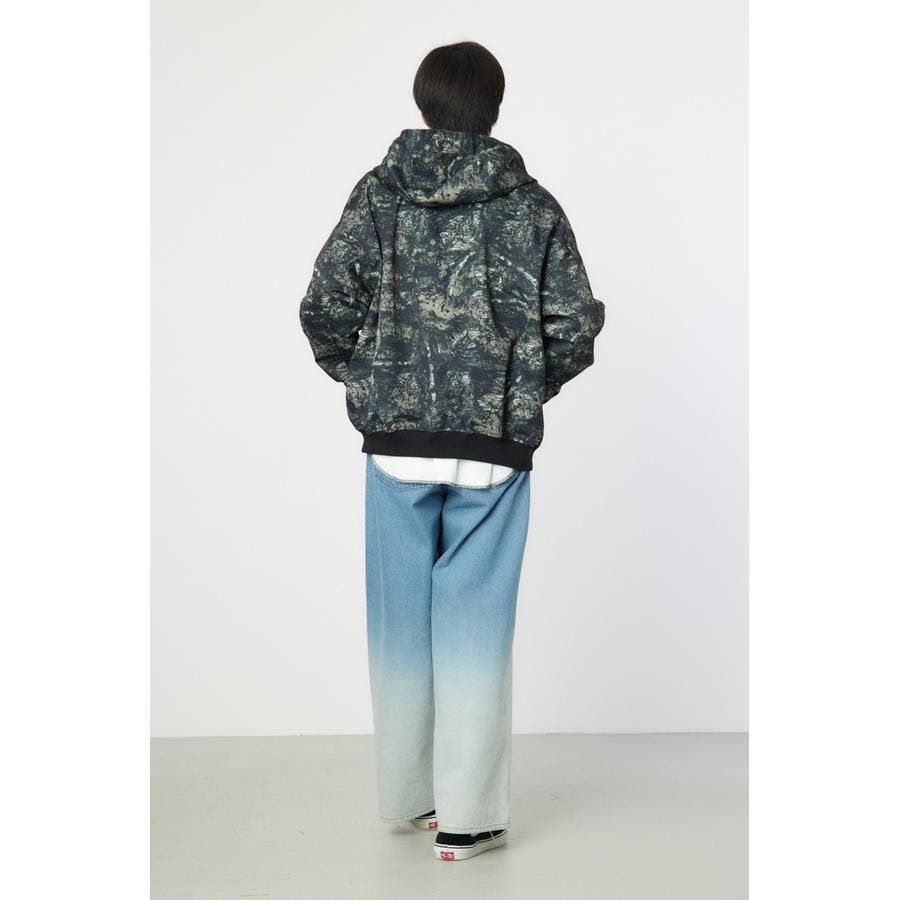 こなれ感のあるケミカル加工を施したデニム素材とリアルリーフ柄のZIPブルゾン。
