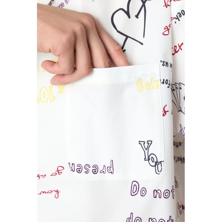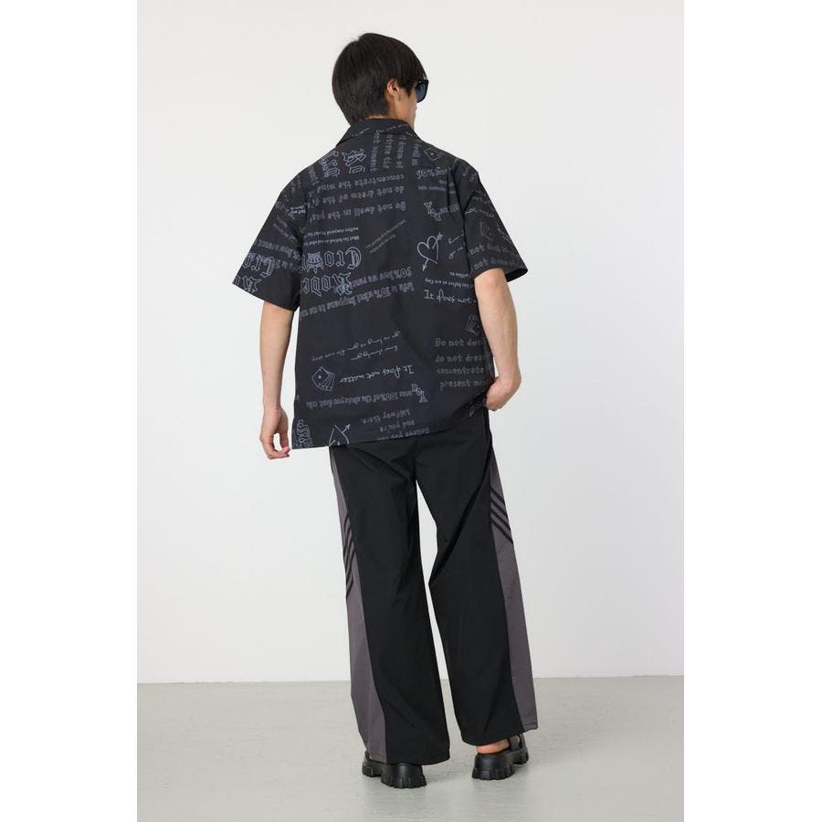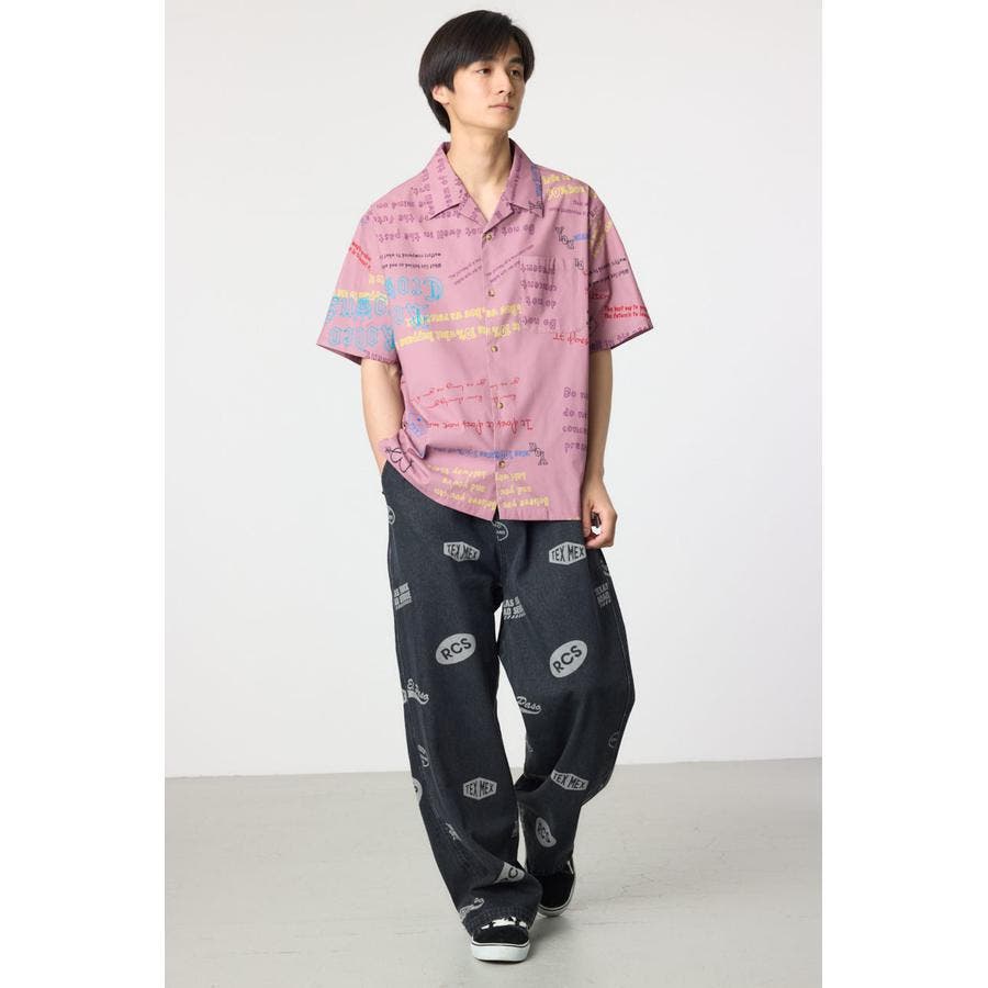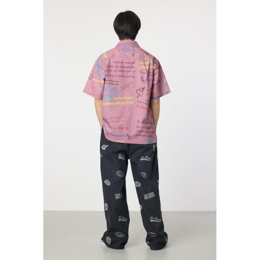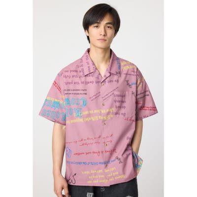 随所にちりばめられた手書き風レタリングデザインやモチーフプリントを組み合わせたオープンカラーシャツ。