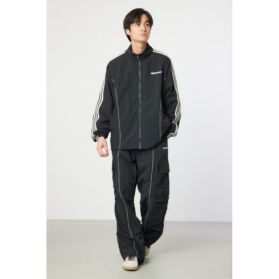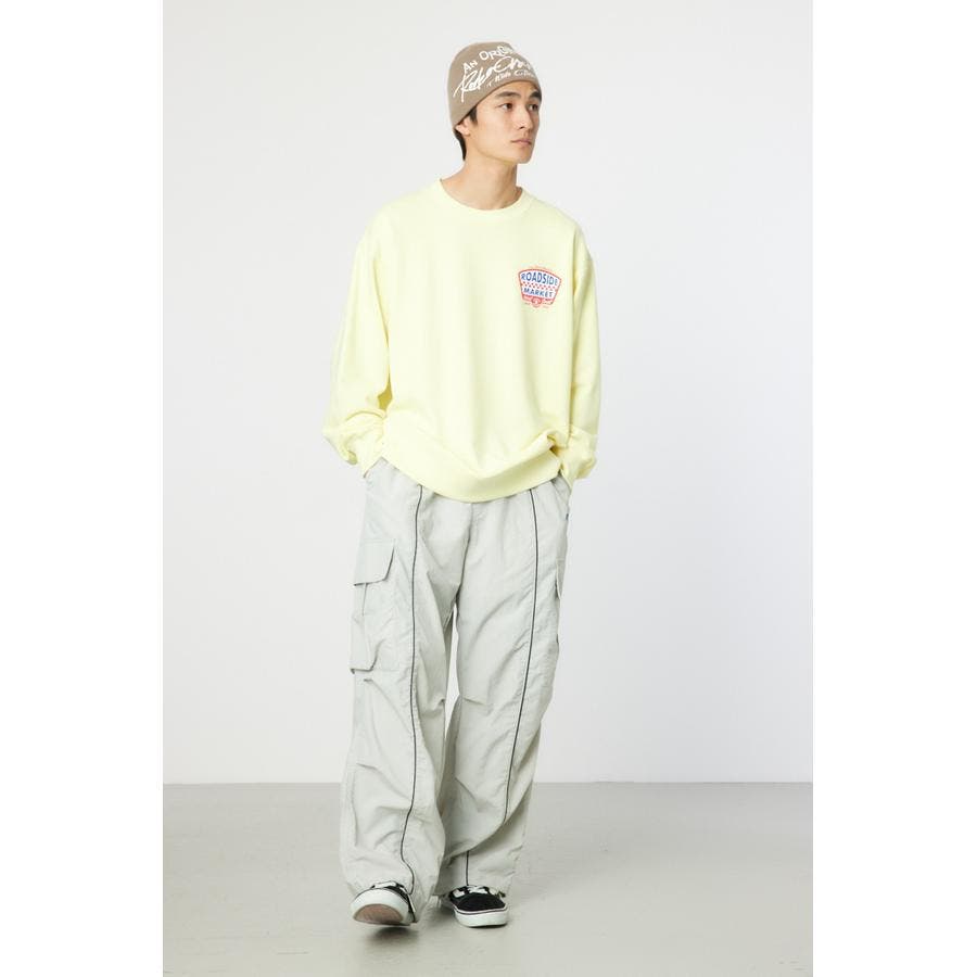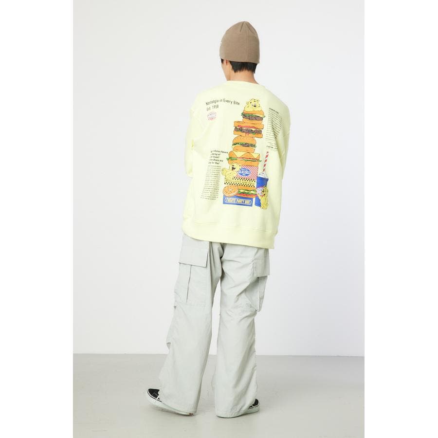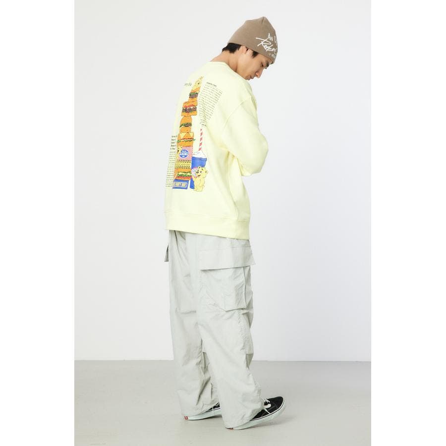 スウェットやニット、パーカーや柄物のアイテムまで幅広くマッチする一着です。スニーカーはボリューム感のあるものと合わせるのがおすすめ。